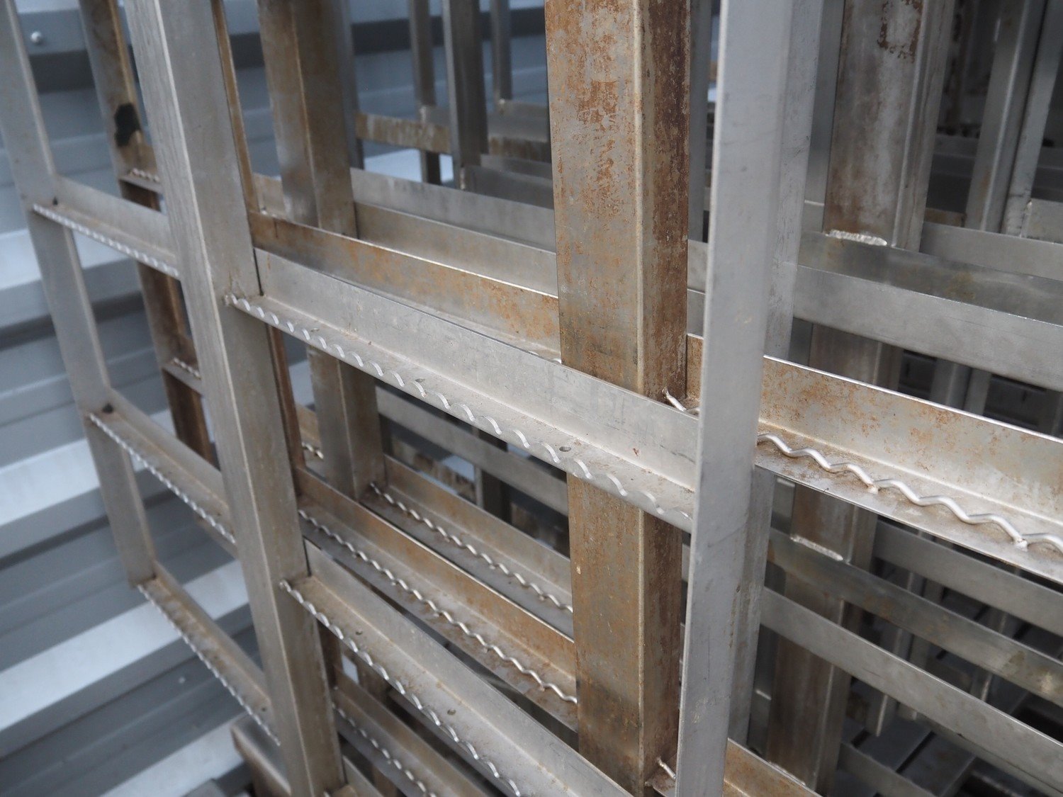 19 s/s smoke trolleys, 5 floors each, dimensions each floor: 960 mm x 900 mm, total dimensions: (19x) 960 mm x 910 mm x 1800 mm.