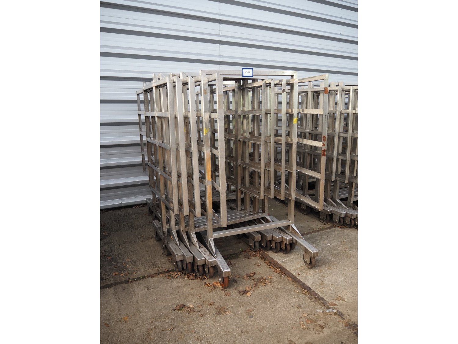 10 s/s smoke trolleys, 5 floors each, dimensions each floor: 960 mm x 900 mm, total dimensions: (10x) 960 mm x 910 mm x 1800 mm.