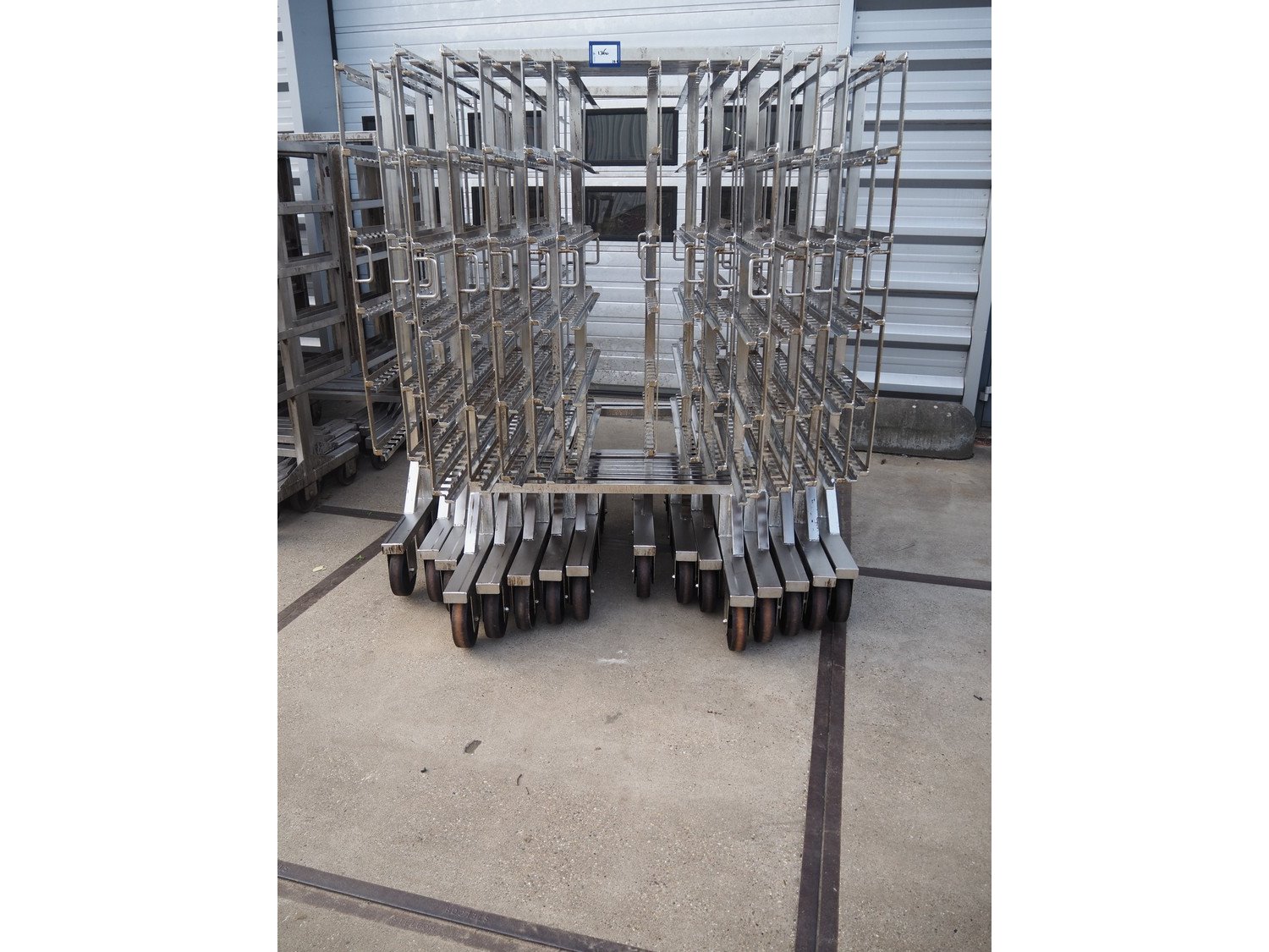 10 s/s smoke trolleys, 6 floors each, dimensions each floor: 1000 mm x 1000 mm, total dimensions: (10x) 1050 mm x 1020 mm x 1960 mm.
