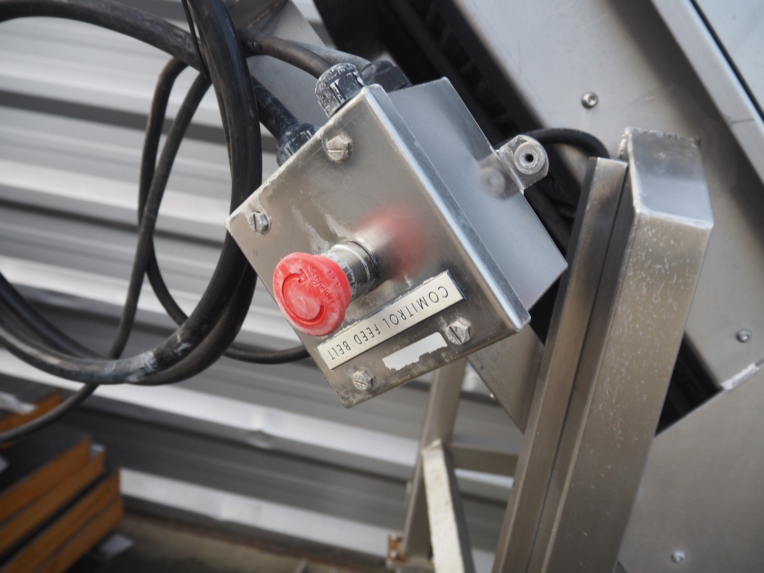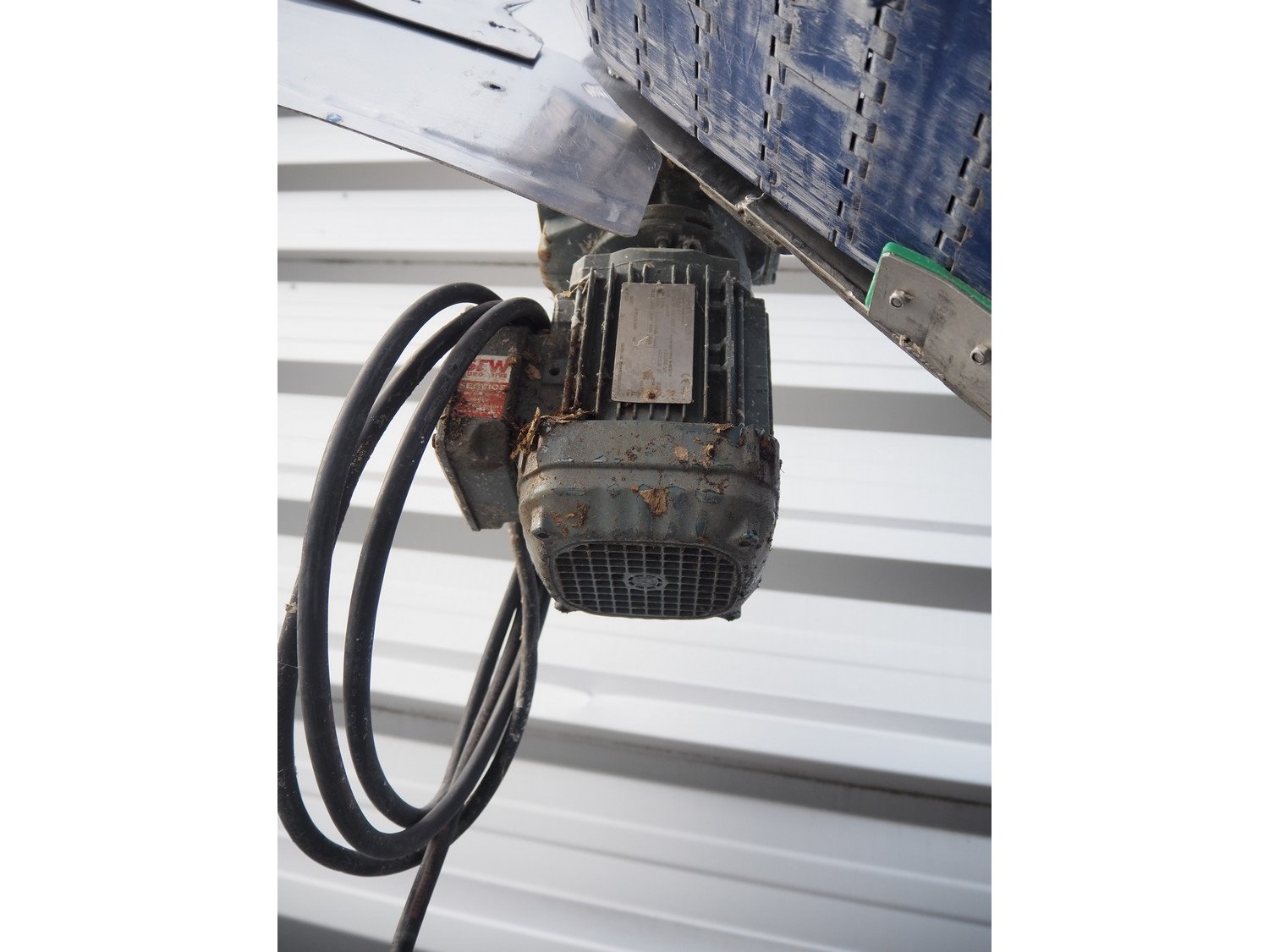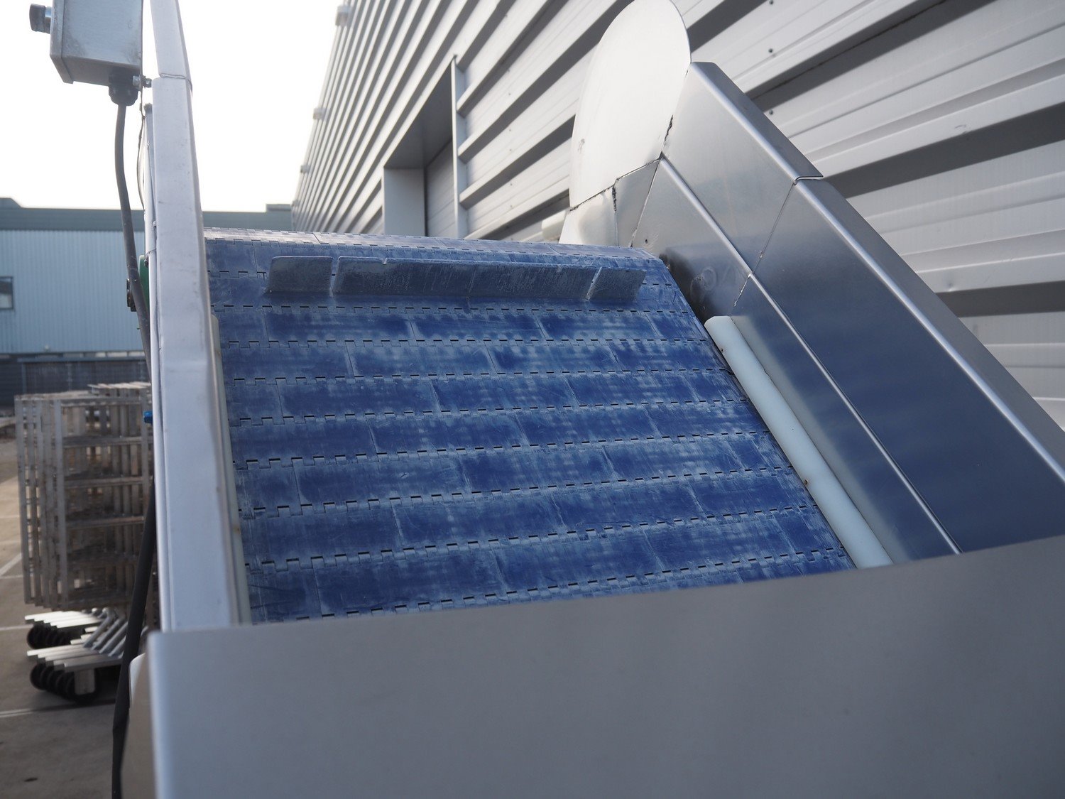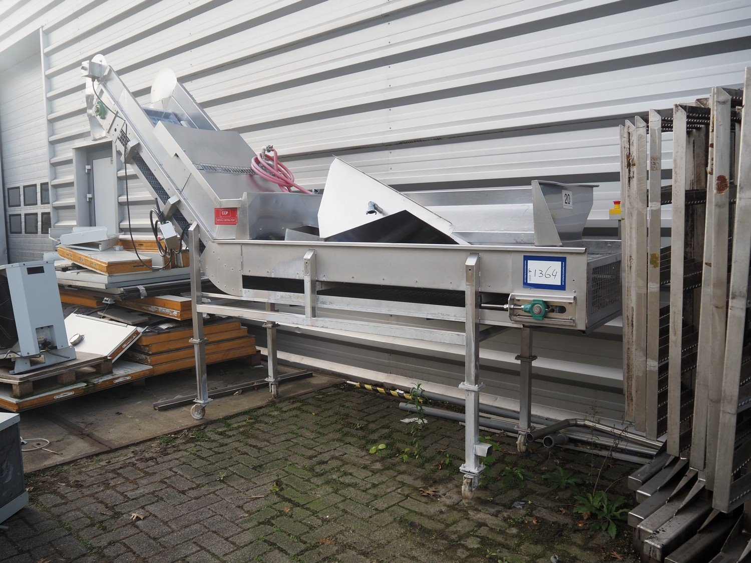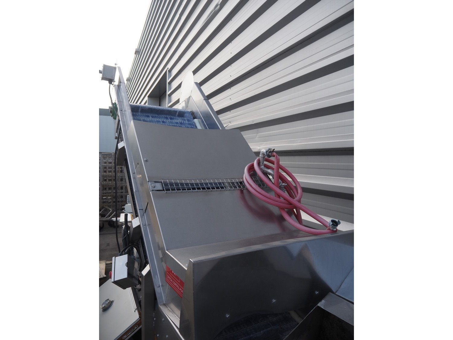 Kemco elevating belt with infeed hopper, plastic belt with dividers, belt width: 600 mm, distance between dividers: 305 mm, divider height: 50 mm, elevating height: 2200 mm, total dimensions: 4150 mm x 950 mm x 2560 mm.