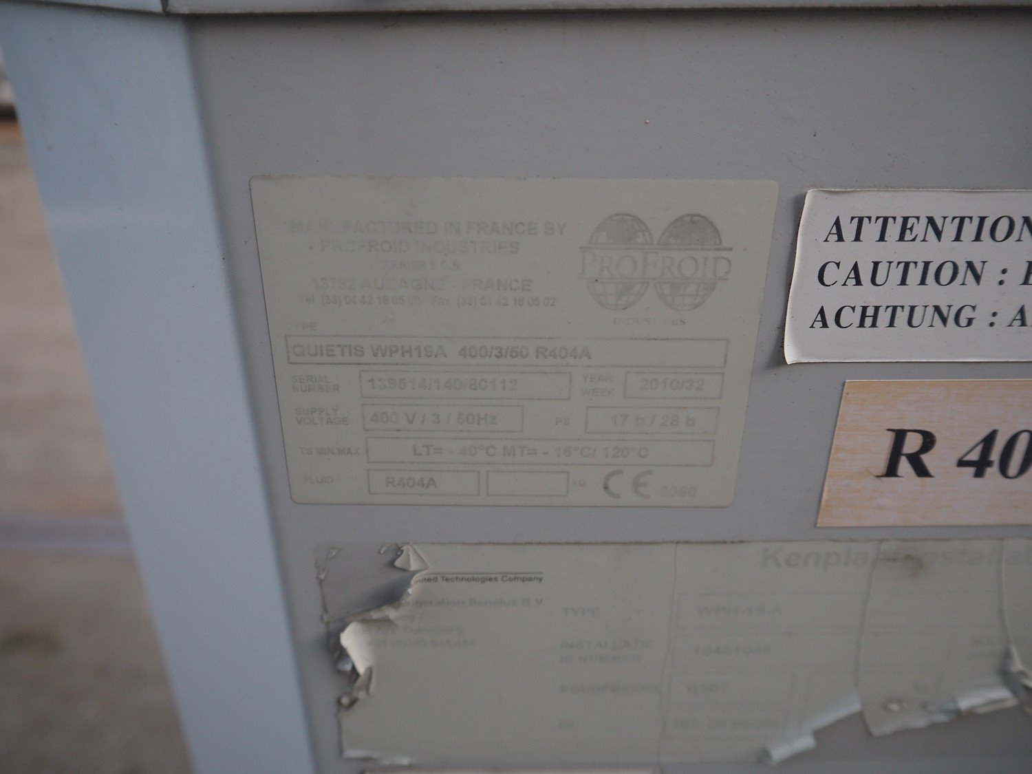 Profroid condensing unit, type: Quietis WPH19A, serial number: 139514/140/8C112, year of construction: 2010, 400 V, 3 Ph, 50 Hz, refrigerant: R404a, dimensions: 1200 mm x 400 mm x 750 mm.