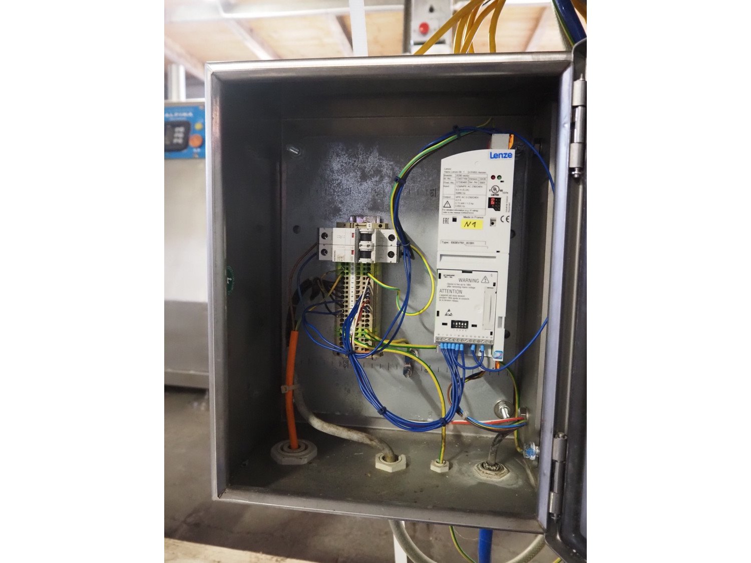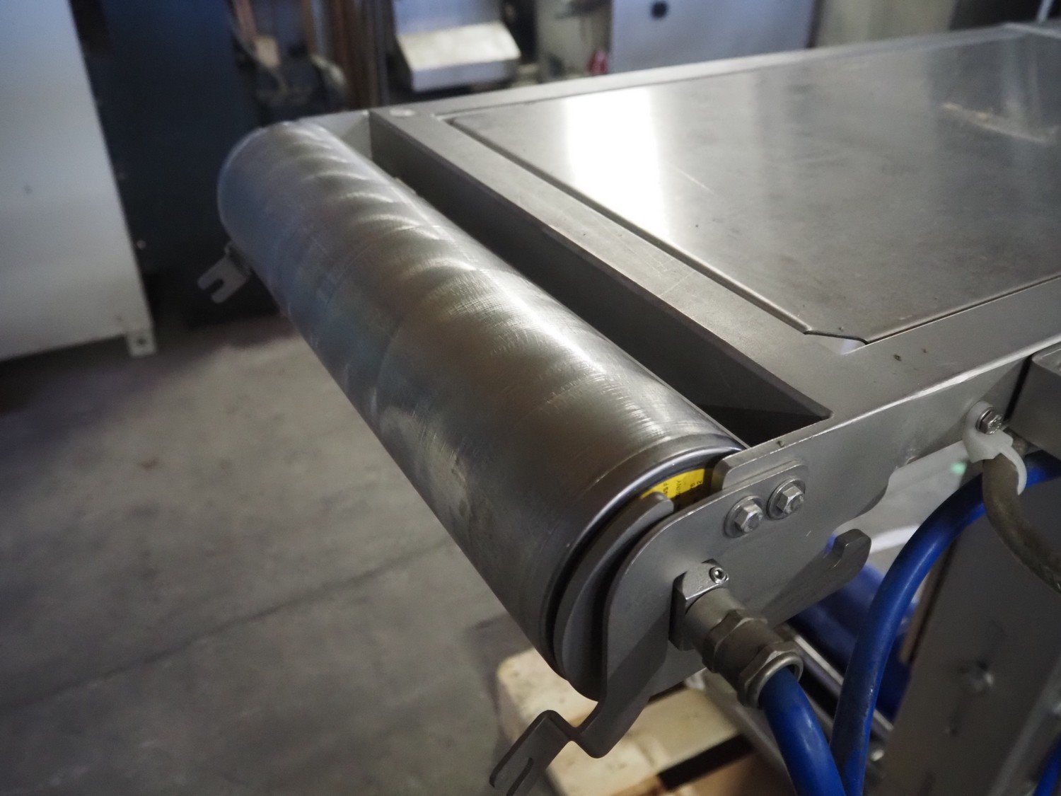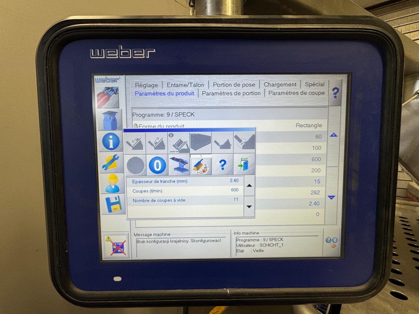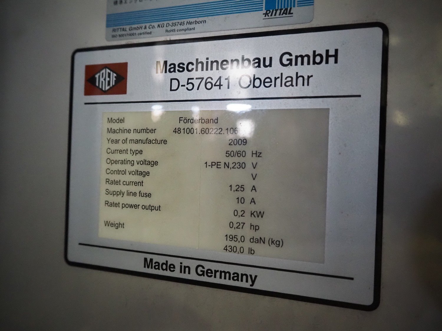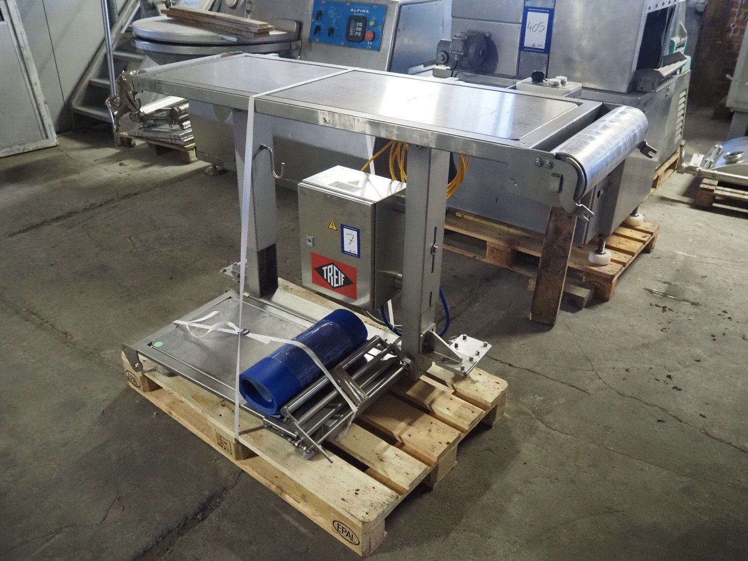 Weber slicer, type: CCS 404, number: 135, year of construction: 06/2008, 400 V, 50 Hz, 10 kW, weight: 1300 kg, wire belt, belt width: 400 mm, total dimensions: 2300 mm x 1340 mm x 2250 mm. With Treif outfeed belt, model: Förderband, machine number: 481001.6022.106, year of construction 2009, 230 V, 1 Ph, 50/60 Hz, 1.25 A, 0.2 kW, weight: 195 kg, (new) plastic belt, belt width: 440 mm, total dimensions: 1460 mm x 640 mm x 1010 mm.