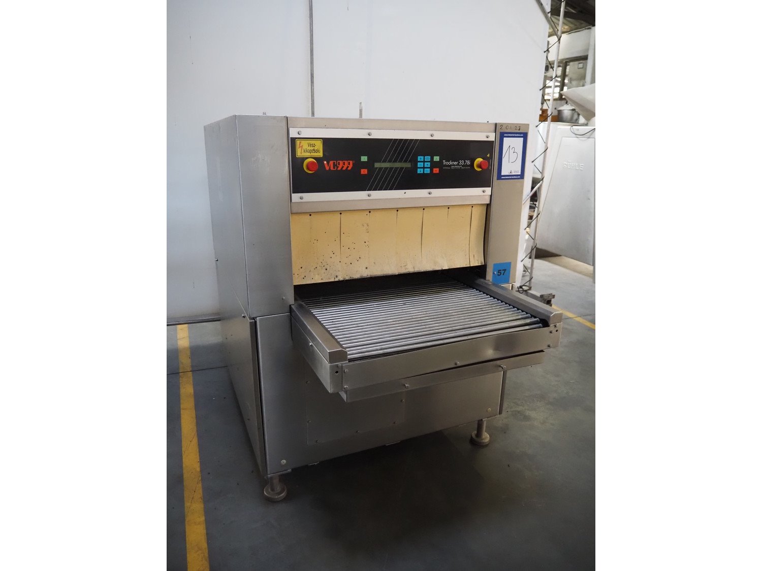Inauen drying tunnel, type: VC999/33.78 i, machine number: 9404073, 400 V, 3 Ph, 50 Hz, 20 A, 12 kW, pressure: 6 bar, s/s rollers, roller width: 780 mm, clearance: 780 mm x 350 mm, s/s mesh belt, belt width: 780 mm, total dimensions: 1720 mm x 1200 mm x 1680 mm.