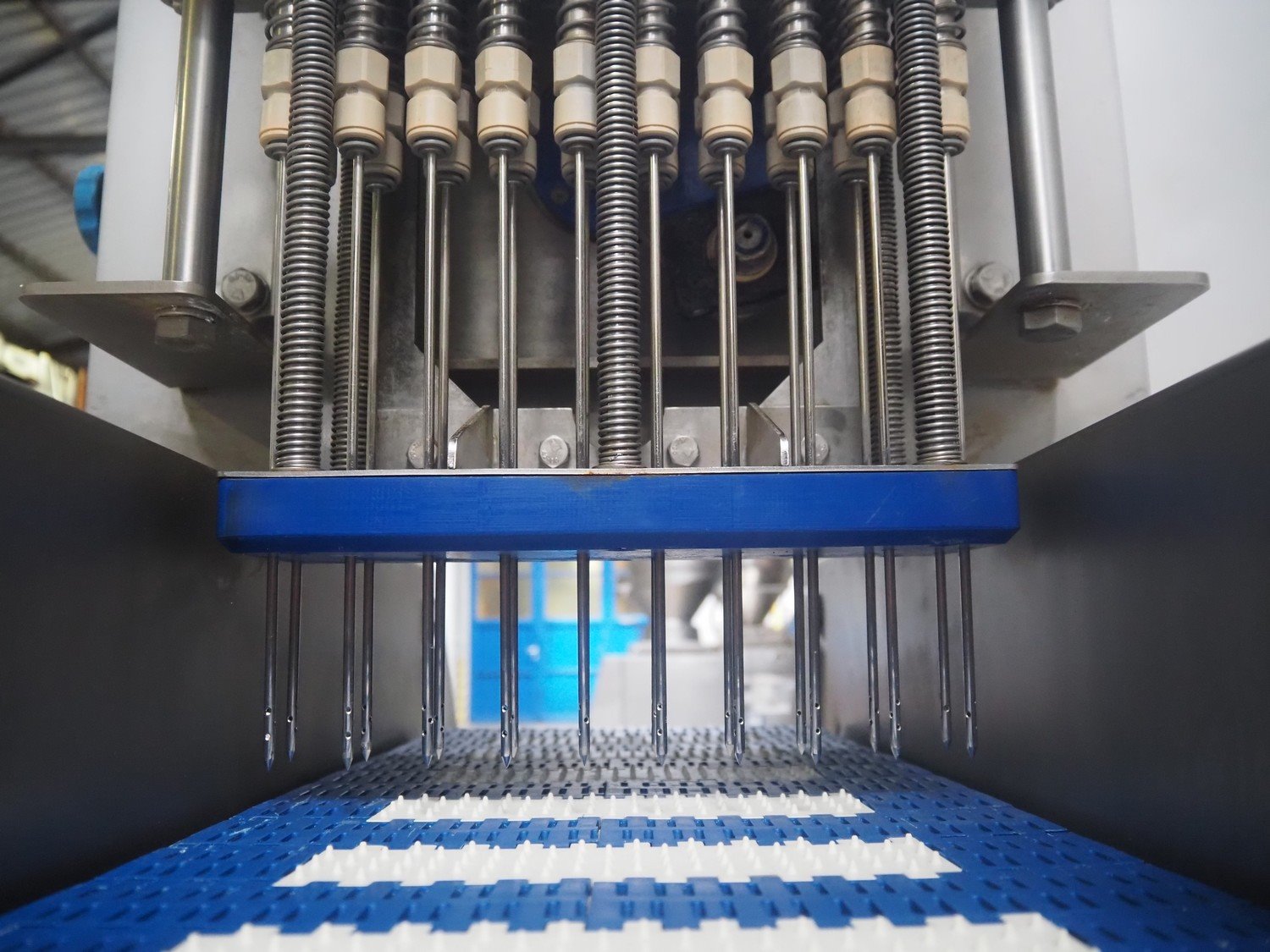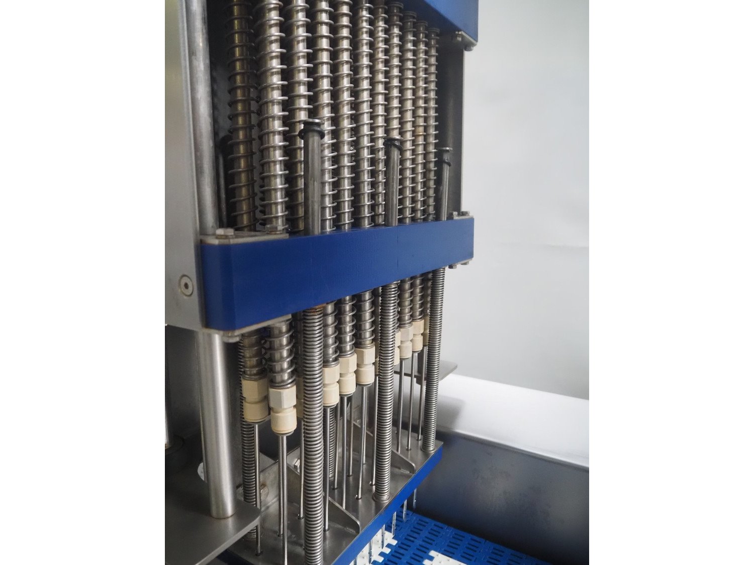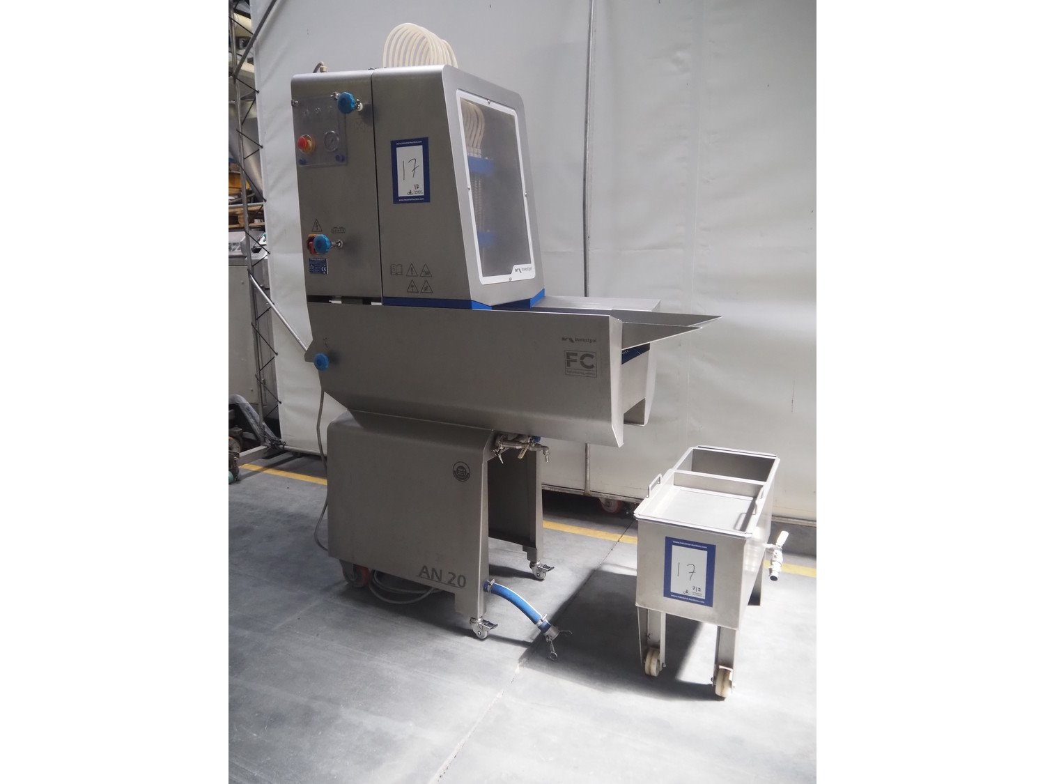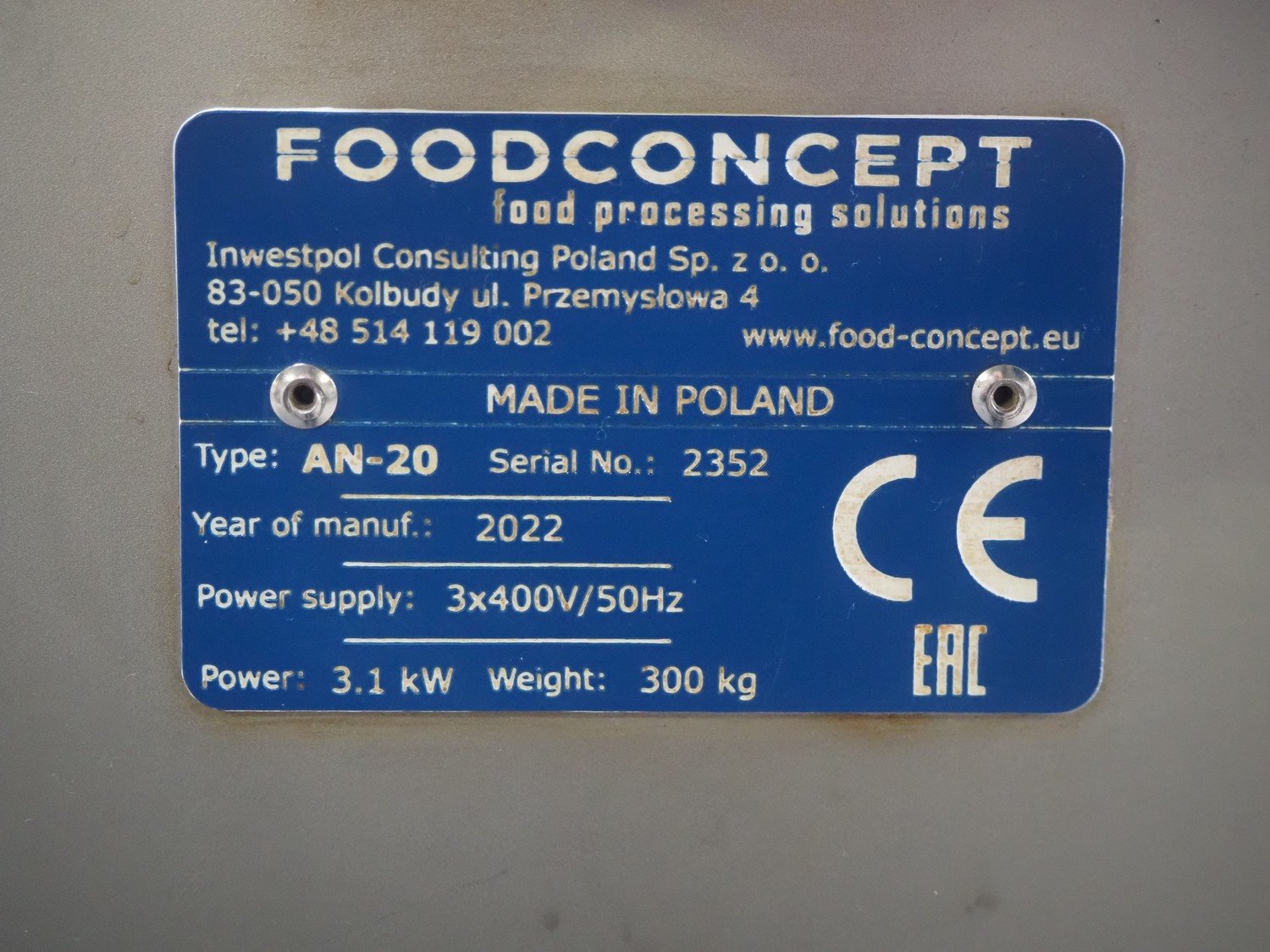 Foodconcept mobile injector with filter tub, type: AN-20, serial number: 2352, year of construction: 2022, 400 V, 3 Ph, 50 Hz, 3.1 kW, 300 kg, 20 needles, plastic mesh belt, belt width: 285 mm, total dimensions: 1300 mm x 650 mm x 2100 mm, dimensions filter tub: 800 mm x 400 mm x 600 mm.