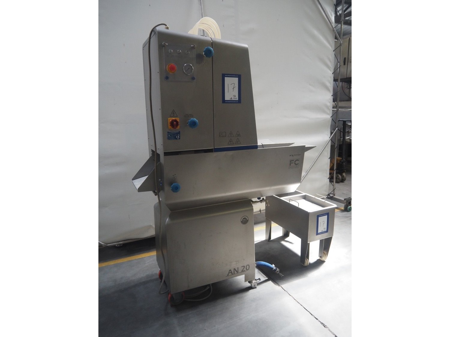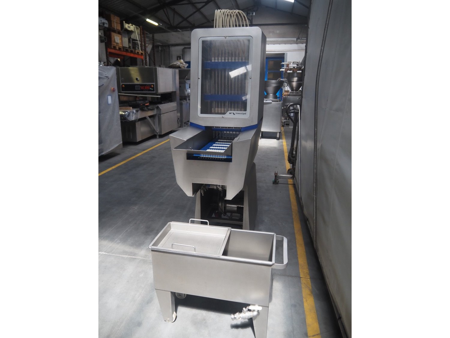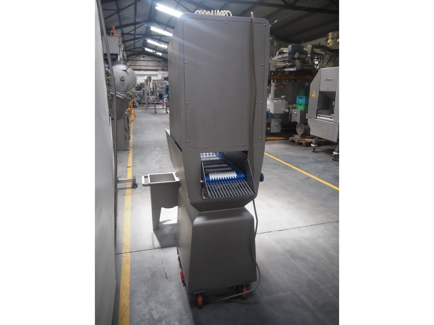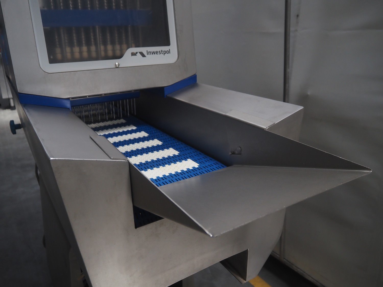 Foodconcept mobile injector with filter tub, type: AN-20, serial number: 2352, year of construction: 2022, 400 V, 3 Ph, 50 Hz, 3.1 kW, 300 kg, 20 needles, plastic mesh belt, belt width: 285 mm, total dimensions: 1300 mm x 650 mm x 2100 mm, dimensions filter tub: 800 mm x 400 mm x 600 mm.