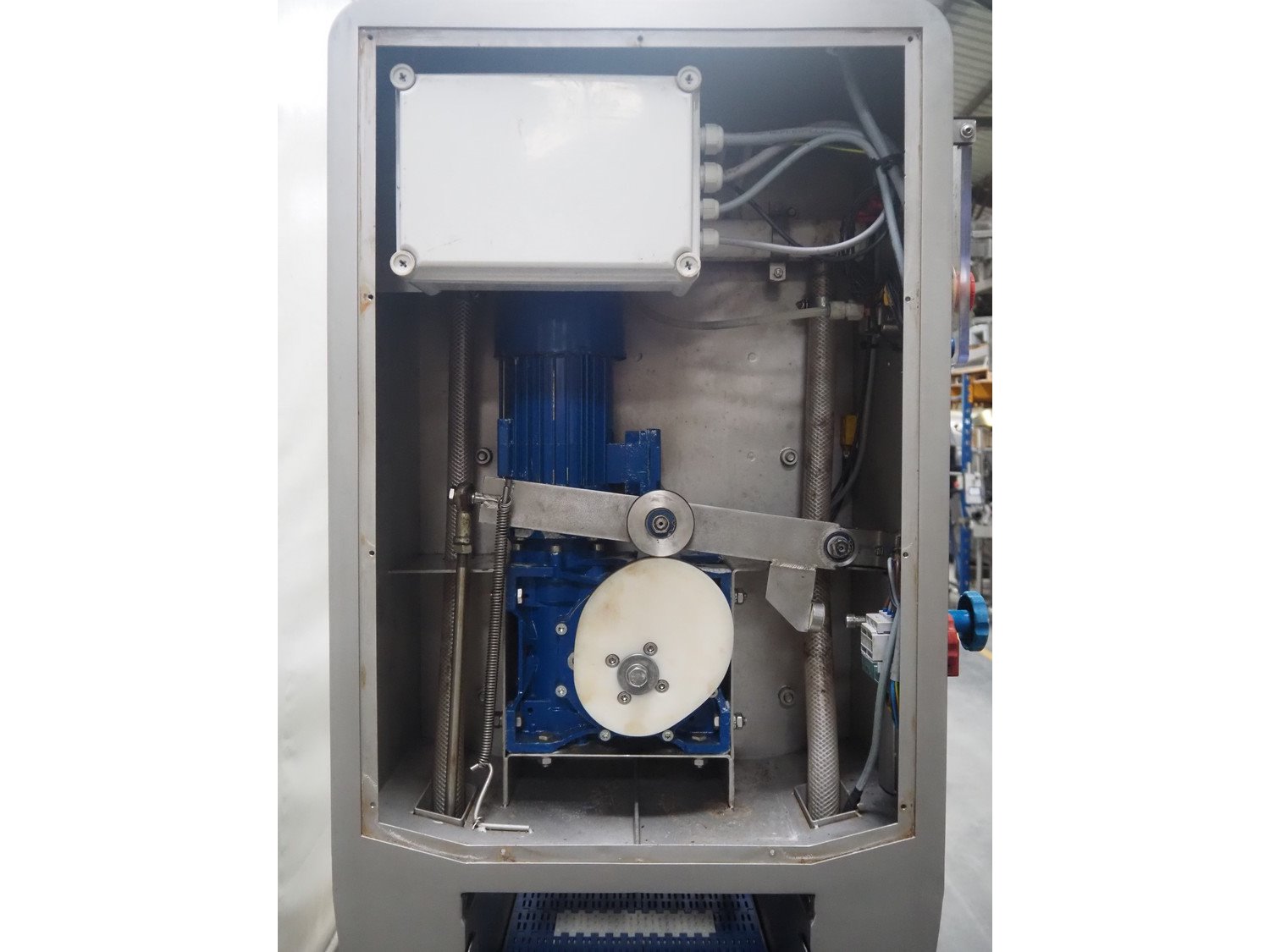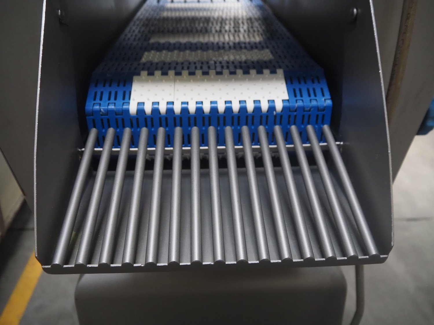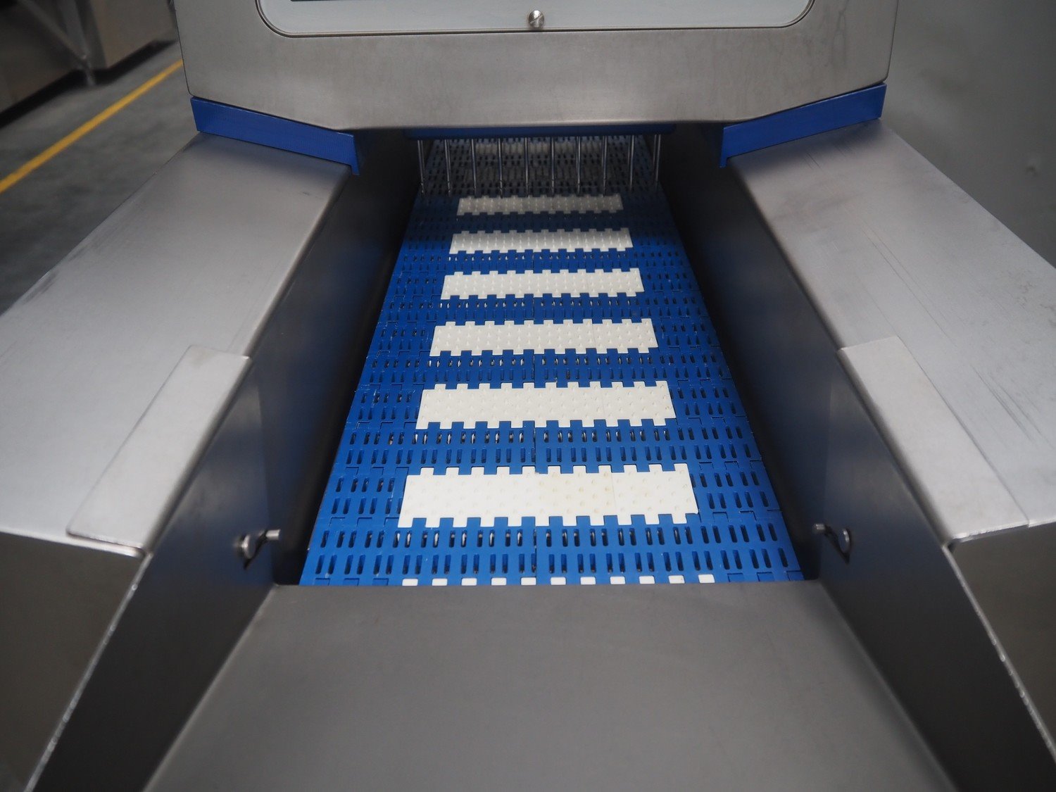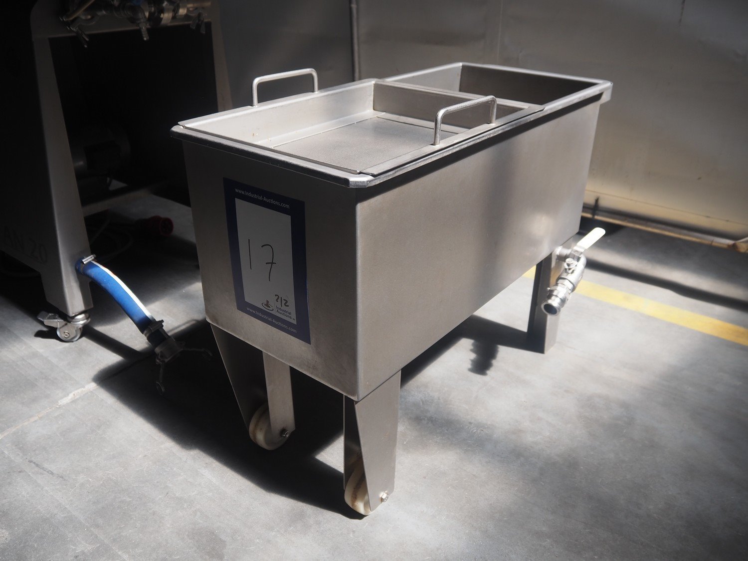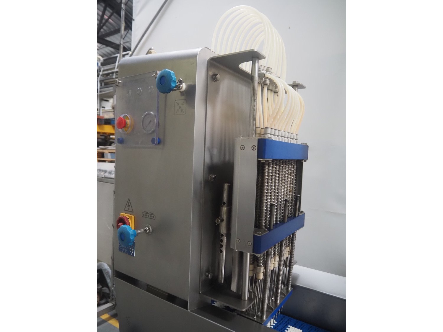 Foodconcept mobile injector with filter tub, type: AN-20, serial number: 2352, year of construction: 2022, 400 V, 3 Ph, 50 Hz, 3.1 kW, 300 kg, 20 needles, plastic mesh belt, belt width: 285 mm, total dimensions: 1300 mm x 650 mm x 2100 mm, dimensions filter tub: 800 mm x 400 mm x 600 mm.