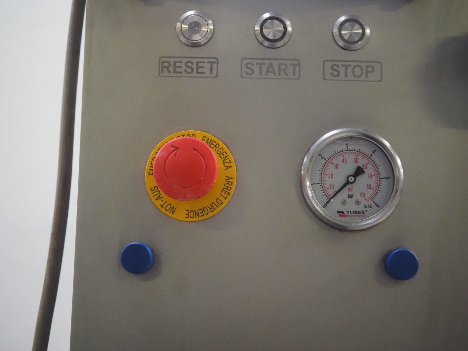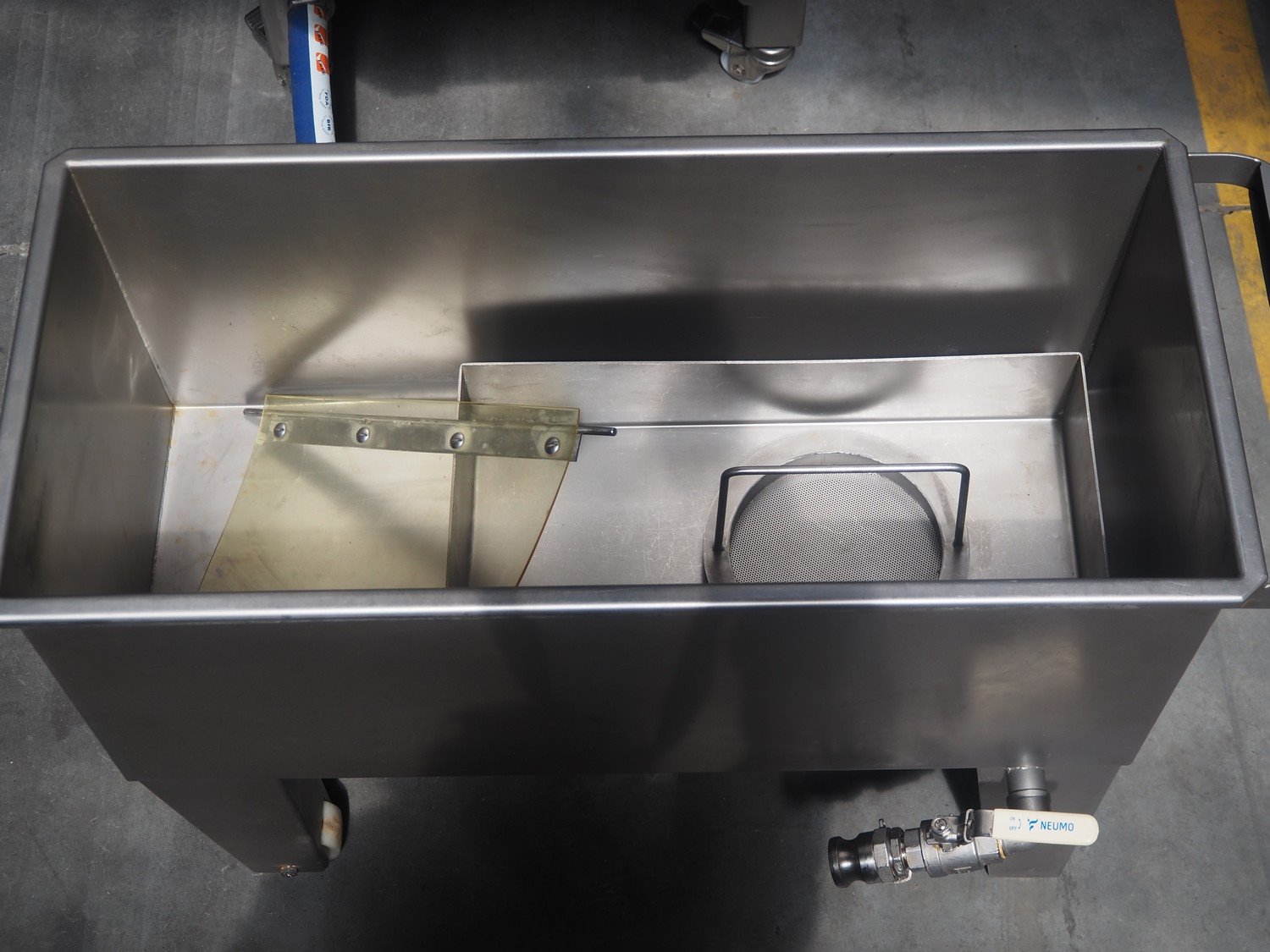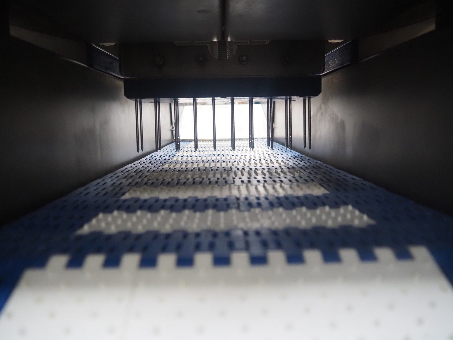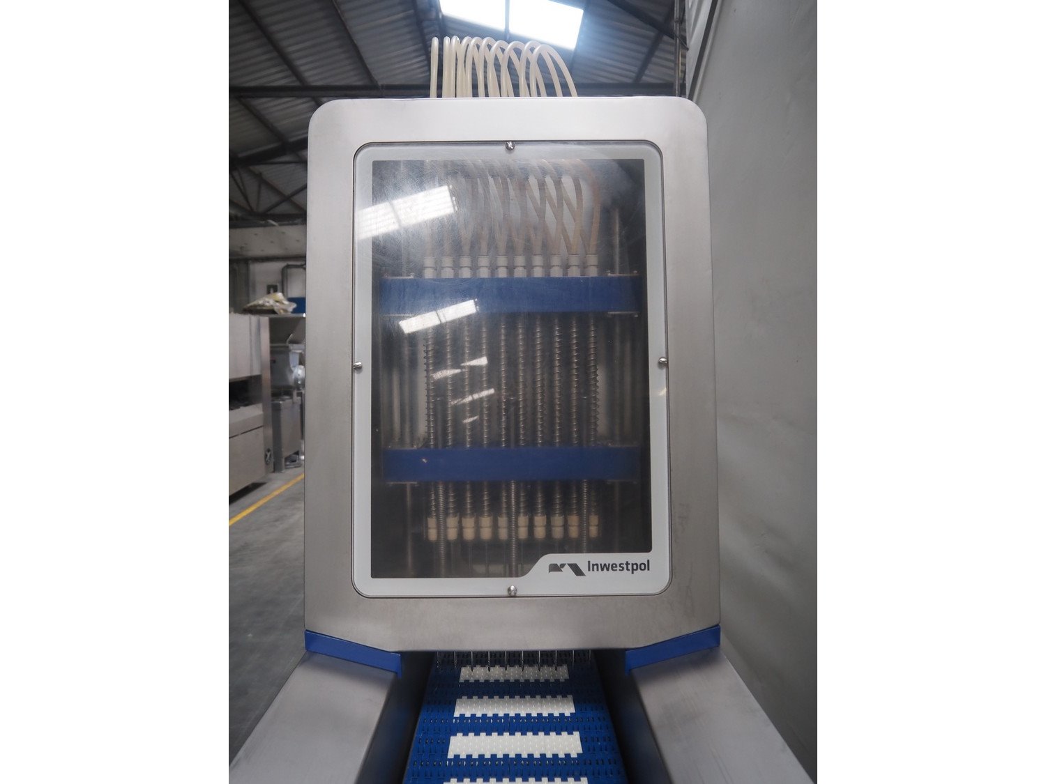 Foodconcept mobile injector with filter tub, type: AN-20, serial number: 2352, year of construction: 2022, 400 V, 3 Ph, 50 Hz, 3.1 kW, 300 kg, 20 needles, plastic mesh belt, belt width: 285 mm, total dimensions: 1300 mm x 650 mm x 2100 mm, dimensions filter tub: 800 mm x 400 mm x 600 mm.