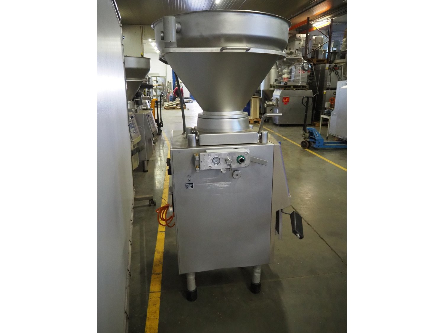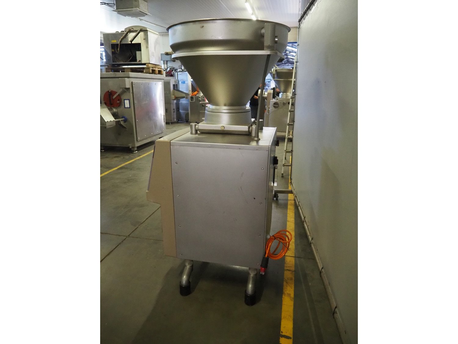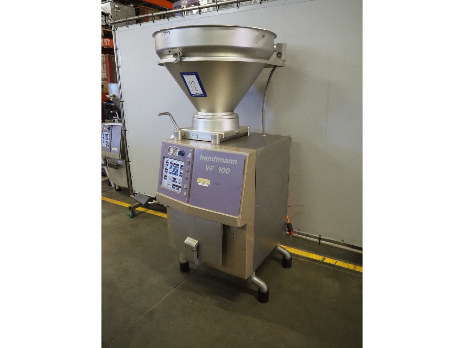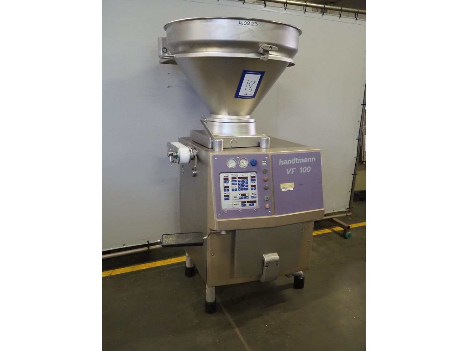Handtmann vacuum filling machine with linking attachment, type: VF100, number: 13950, year of construction: 2001, 400 V, 50 Hz, 12.6 A, 5 kW, type linker: 34-5, number linker: 11353, dimensions: 1000 mm x 900 mm x 1900 mm.