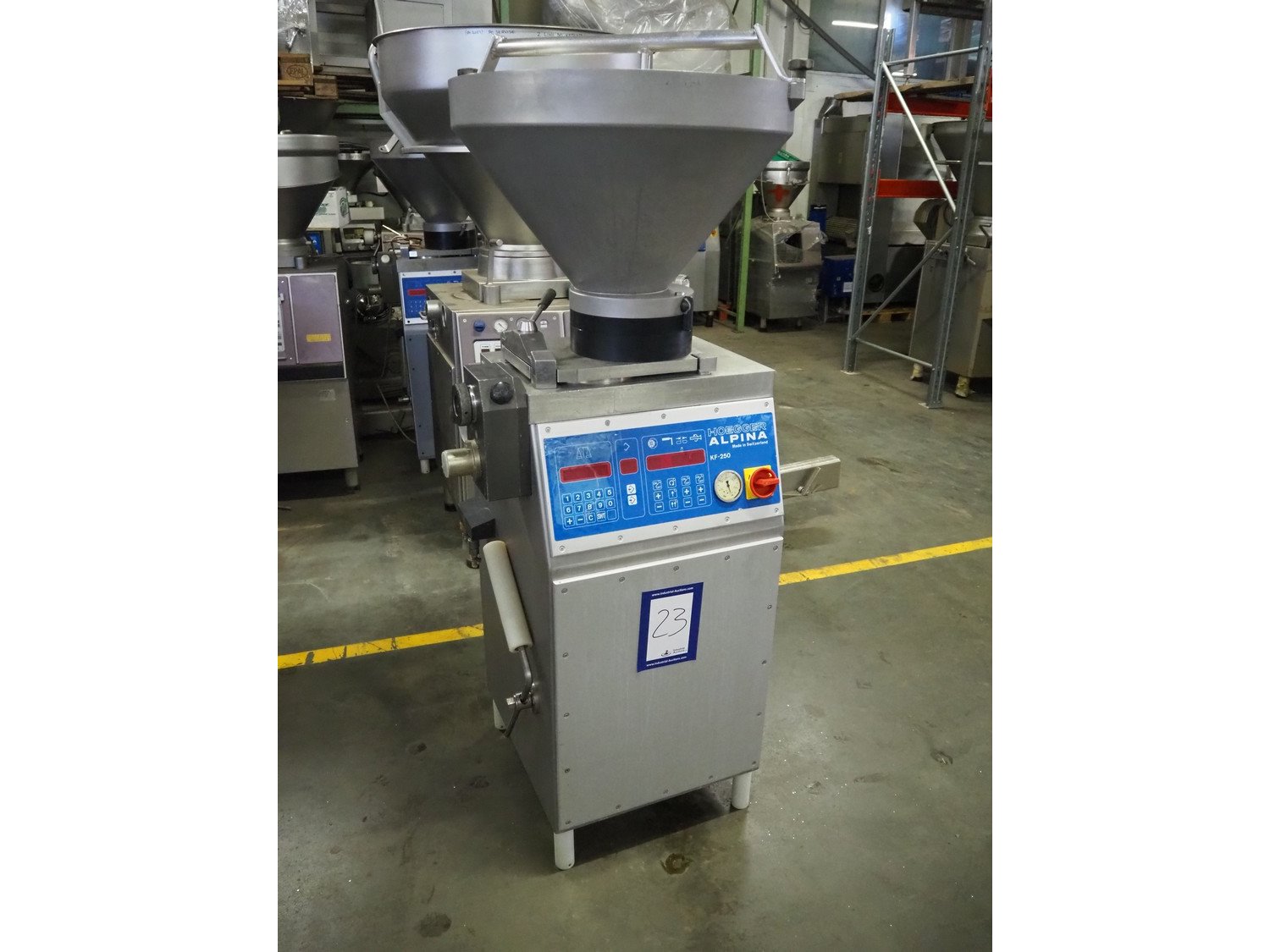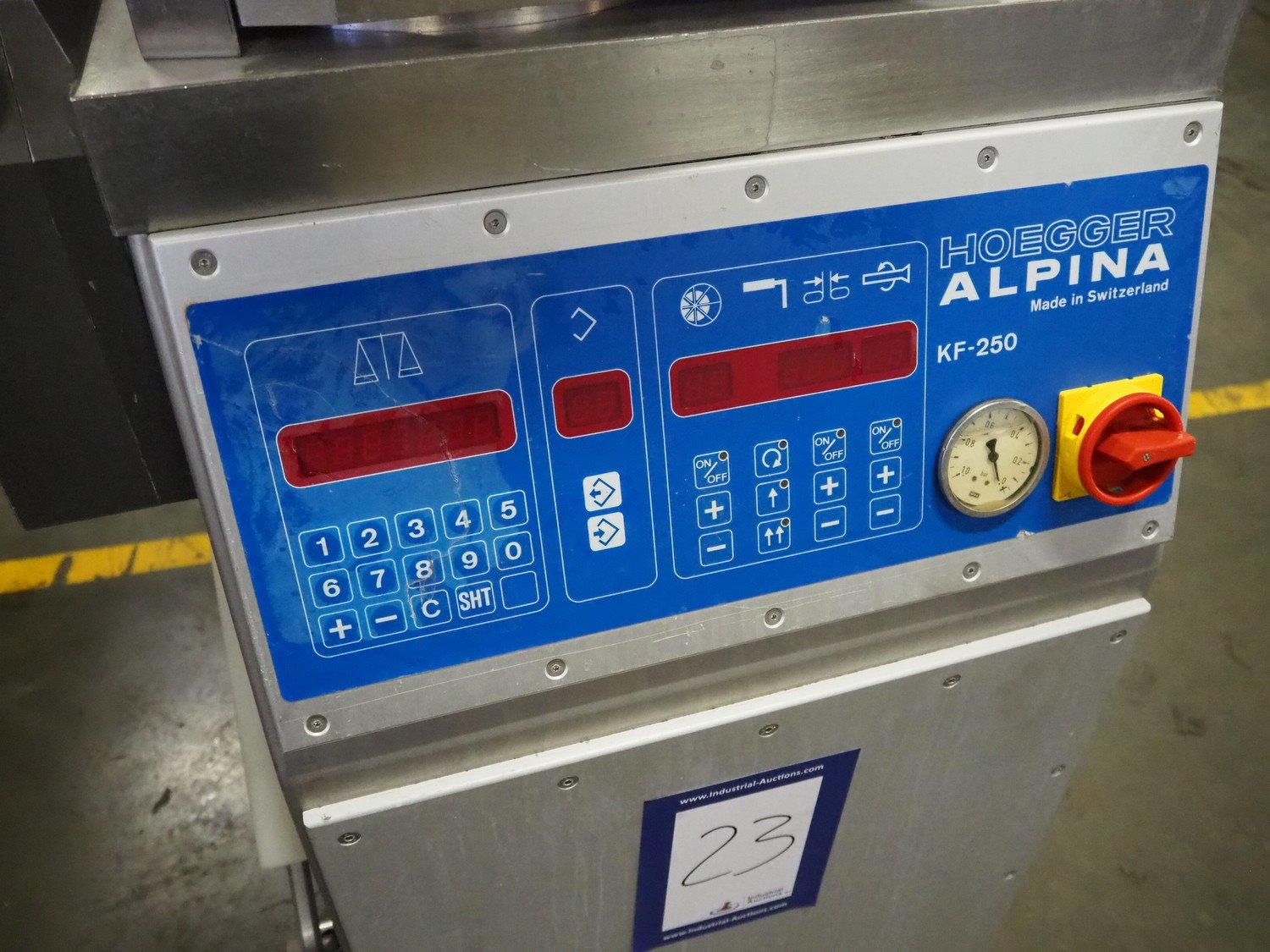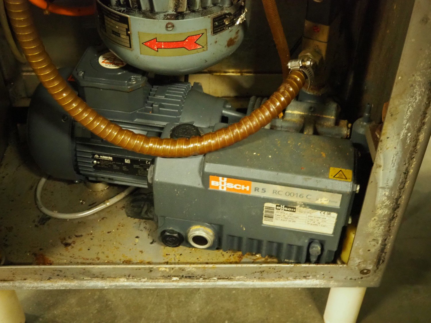 Hoegger Alpina vacuum filling machine, type: KF-250, machine number: 829011, 380 V, 4 kW, Busch vacuum pump, type: RC 0016 C 303, dimensions: 700 mm x 650 mm x 1800 mm.