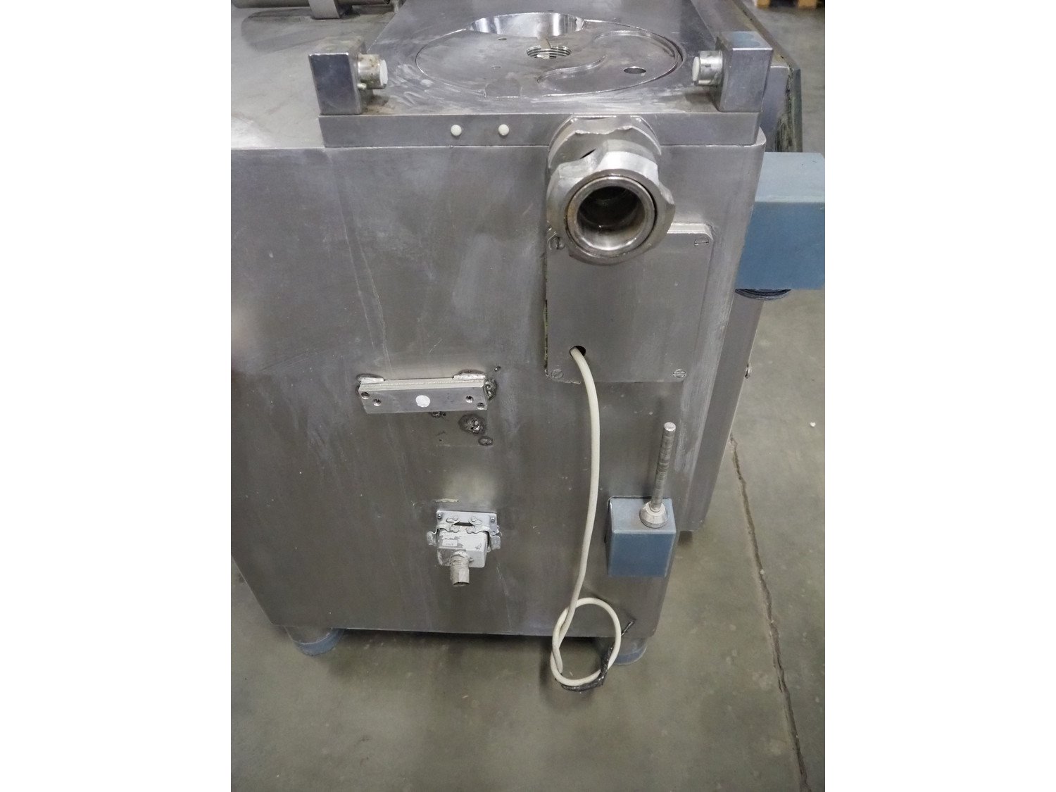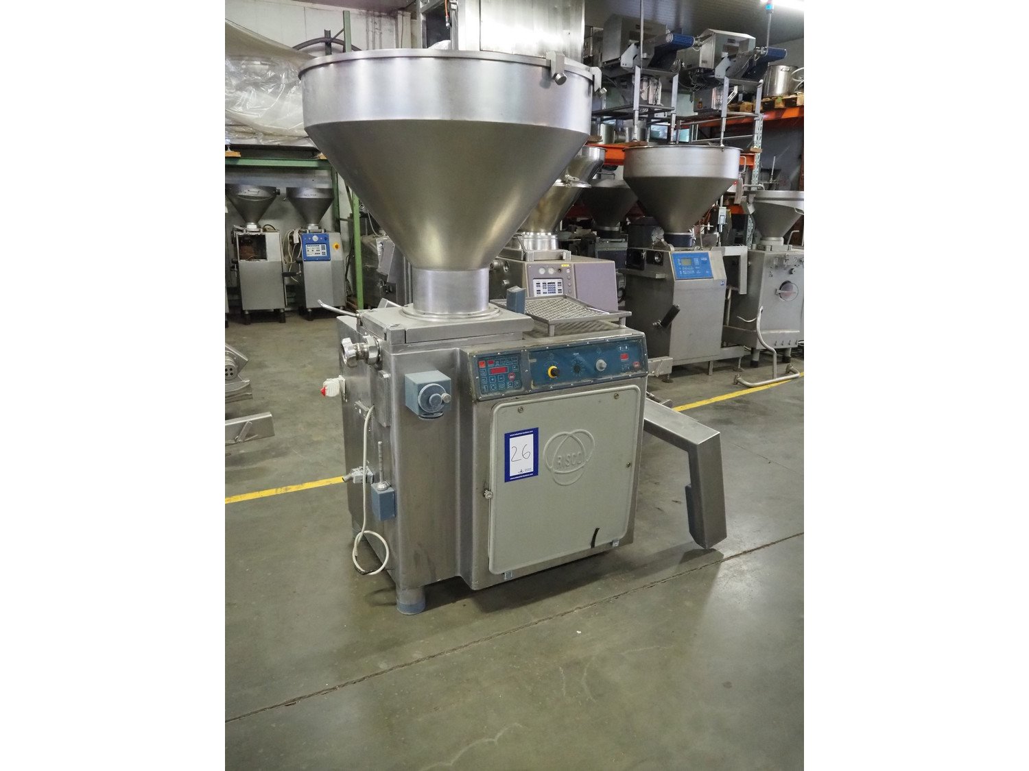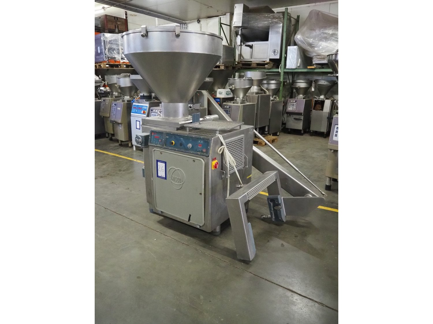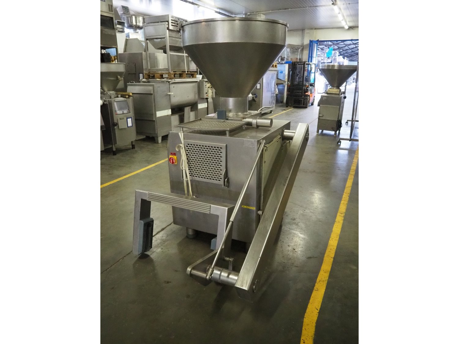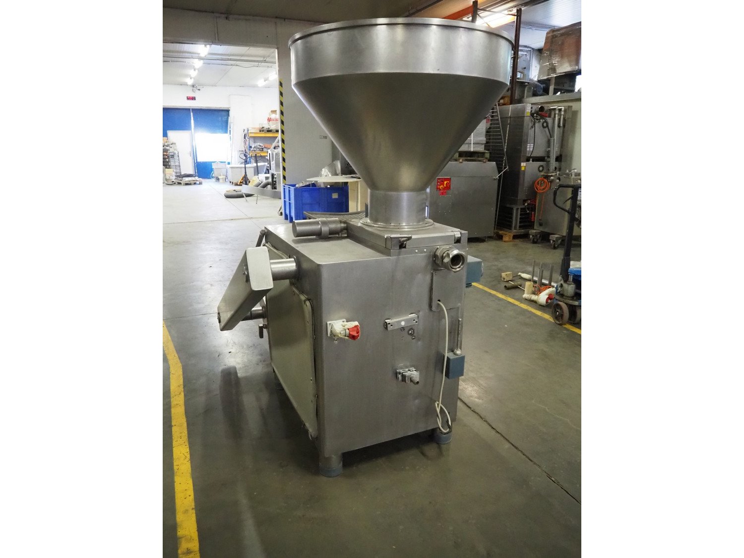 Risco vacuum filling machine with lifter for 200 liter meat bins, type: RS 5001, serial number: C194005, year of construction: 1995, 380 V, 3 Ph, 50 Hz, 35 A, 12 kW, dimensions: 2200 mm x 1100 mm x 2300 mm. With case spooling device among others.