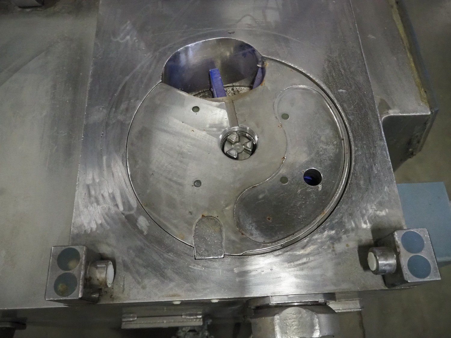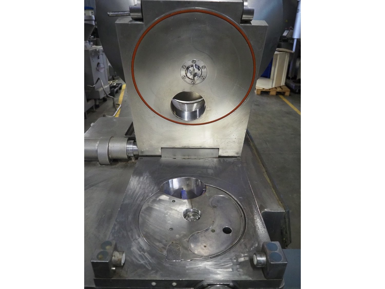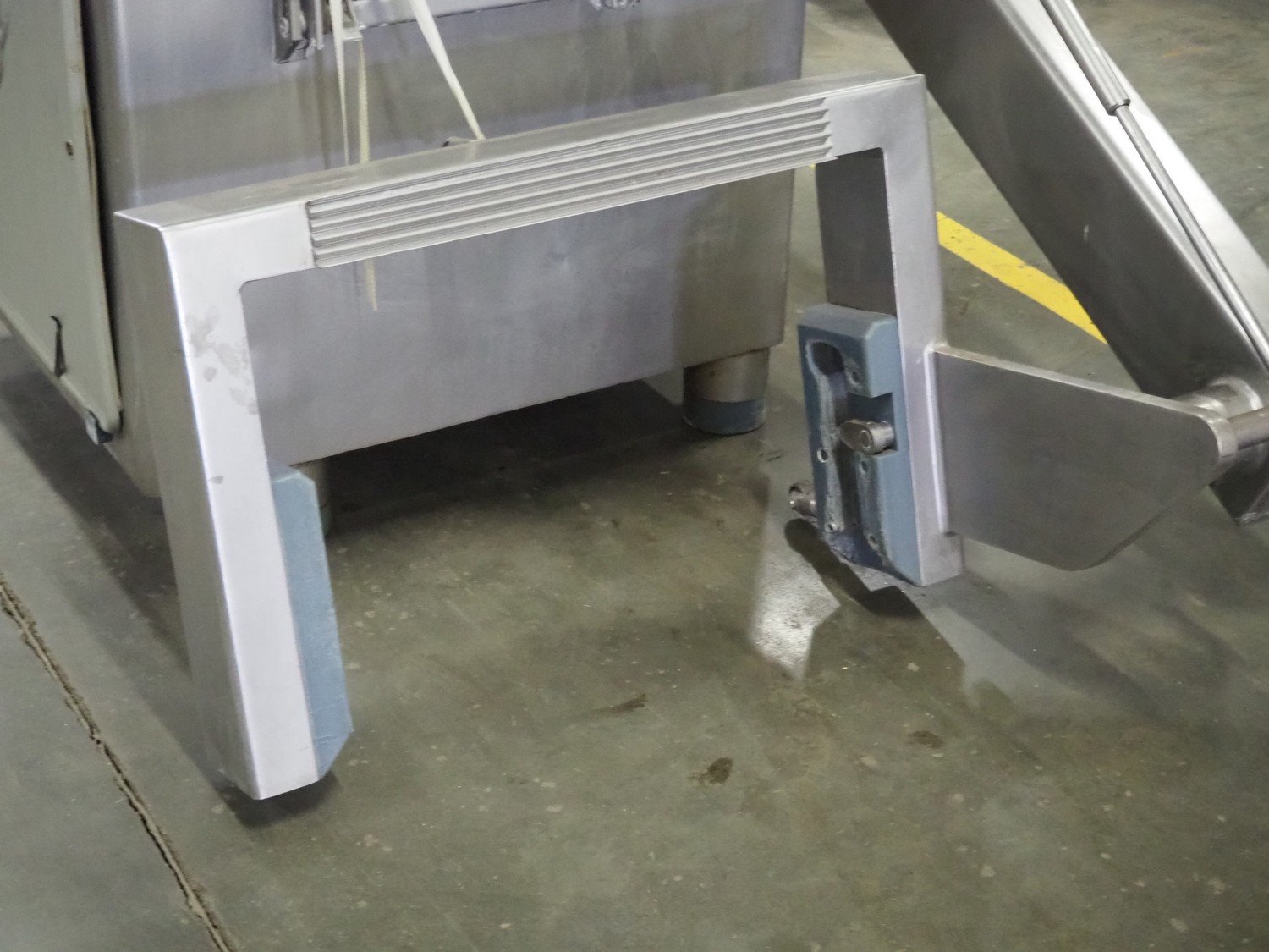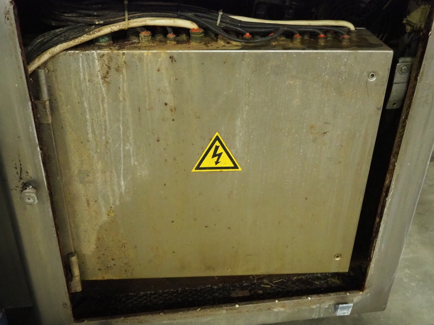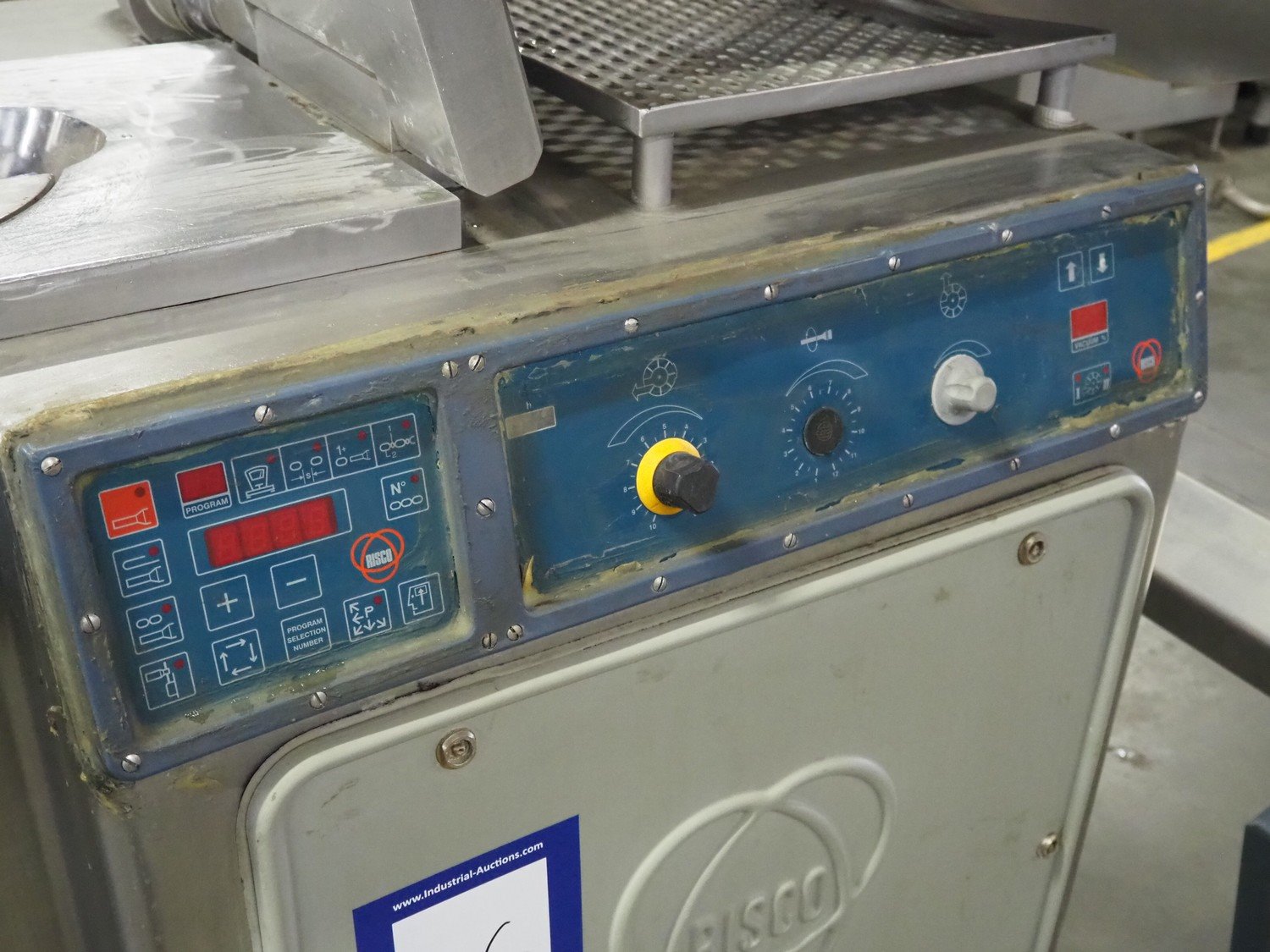 Risco vacuum filling machine with lifter for 200 liter meat bins, type: RS 5001, serial number: C194005, year of construction: 1995, 380 V, 3 Ph, 50 Hz, 35 A, 12 kW, dimensions: 2200 mm x 1100 mm x 2300 mm. With case spooling device among others.