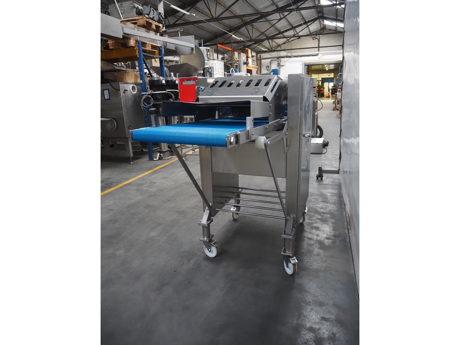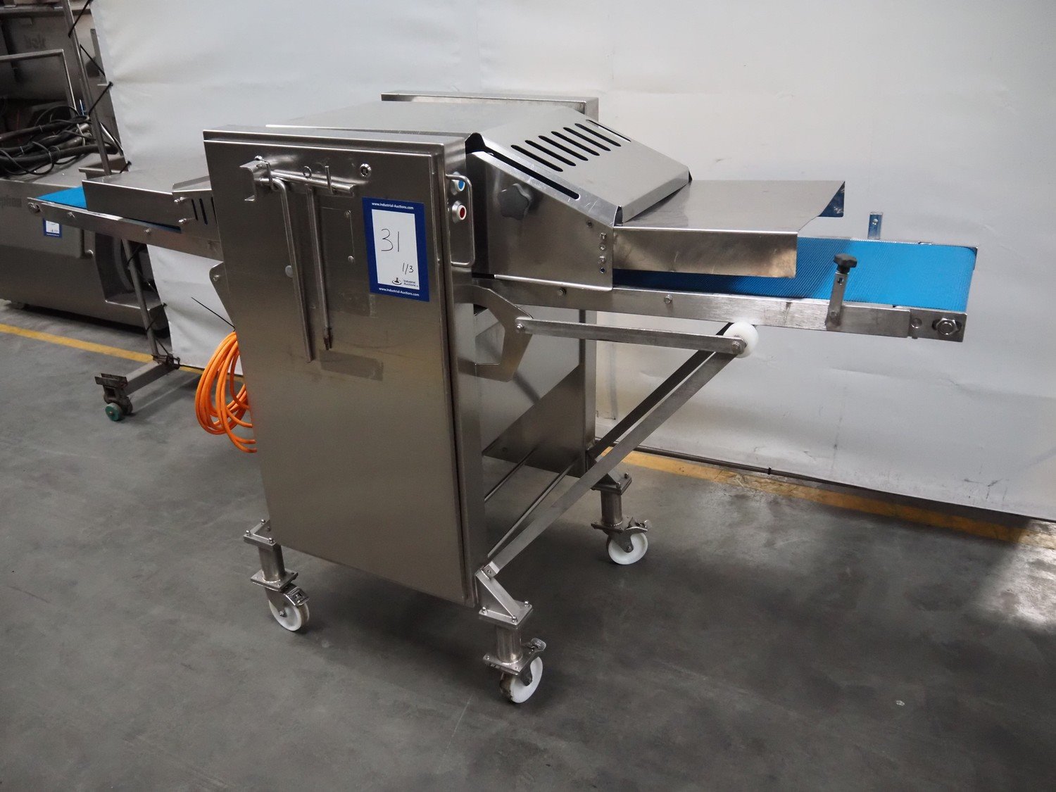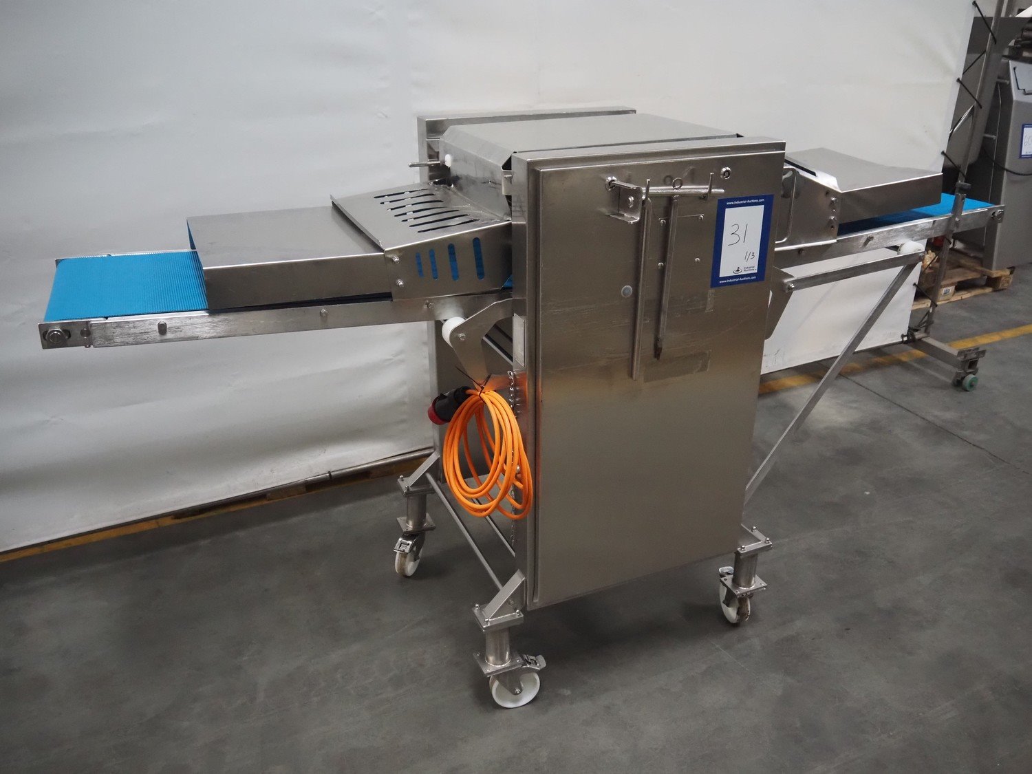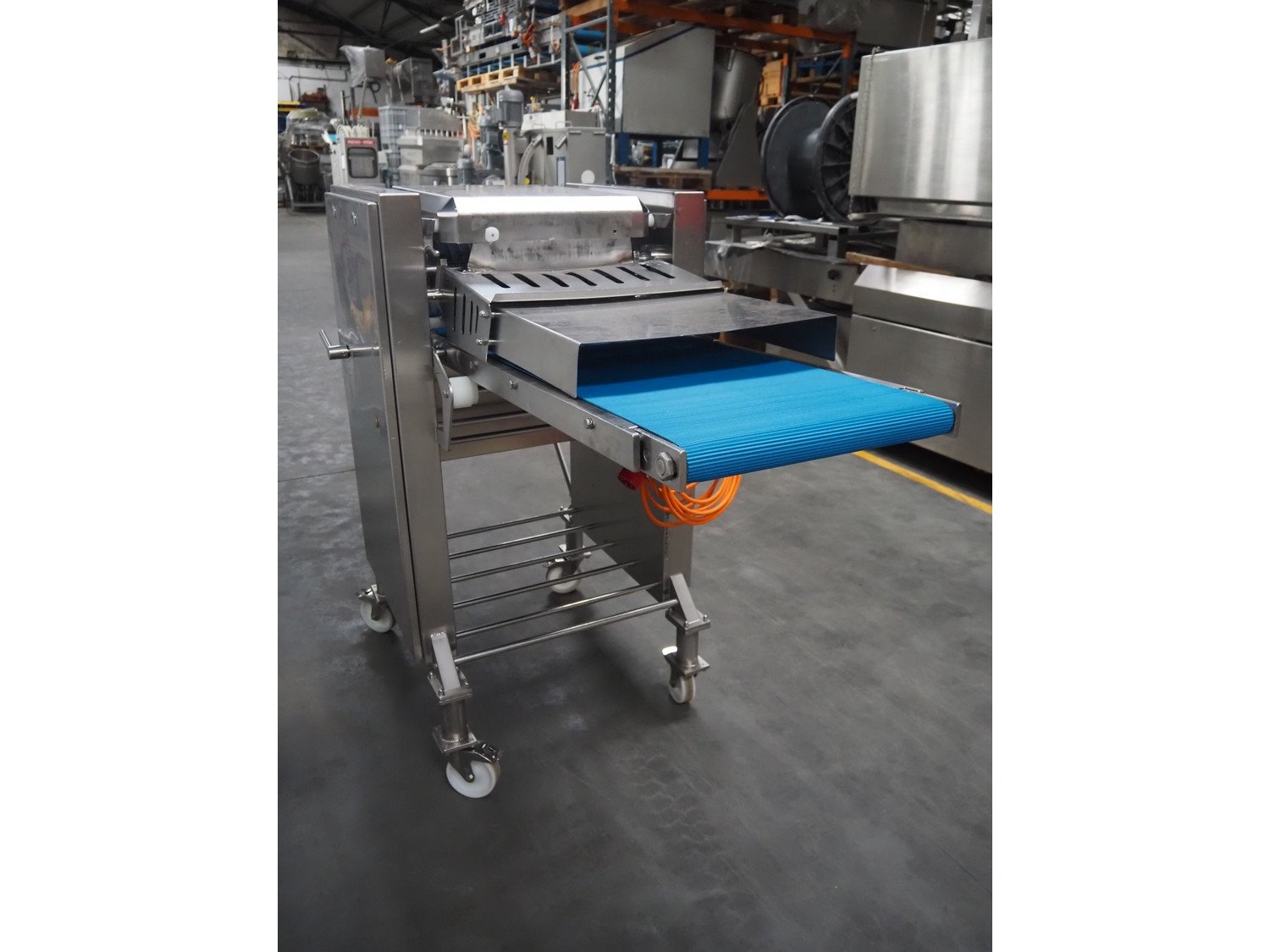 Nock mobile strip cutter, type: CB495/5K, serial number: 09020110, year of construction: 2006, 400 V, 3 Ph, 50 Hz, 10 A, plastic belt, belt width: 430 mm, 16 knives, distance between knives: 30 mm, total dimensions: 2400 mm x 850 mm x 1480 mm. Including 2 extra knives, (1x) 30 mm, (1x) 15 mm, and s/s trolley, dimensions: 570 mm x 830 mm x 1100 mm.