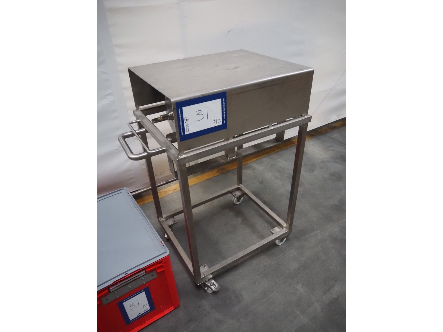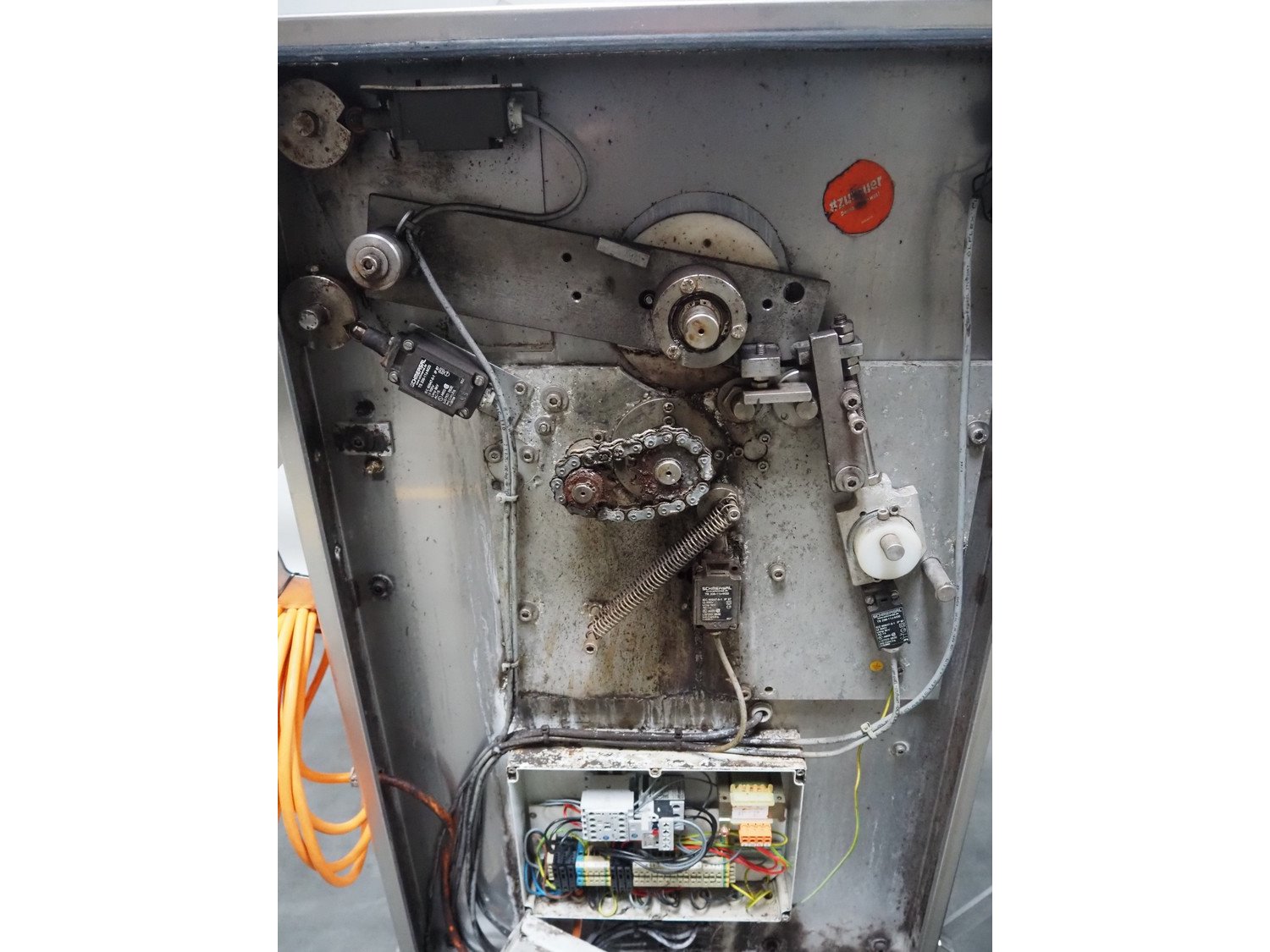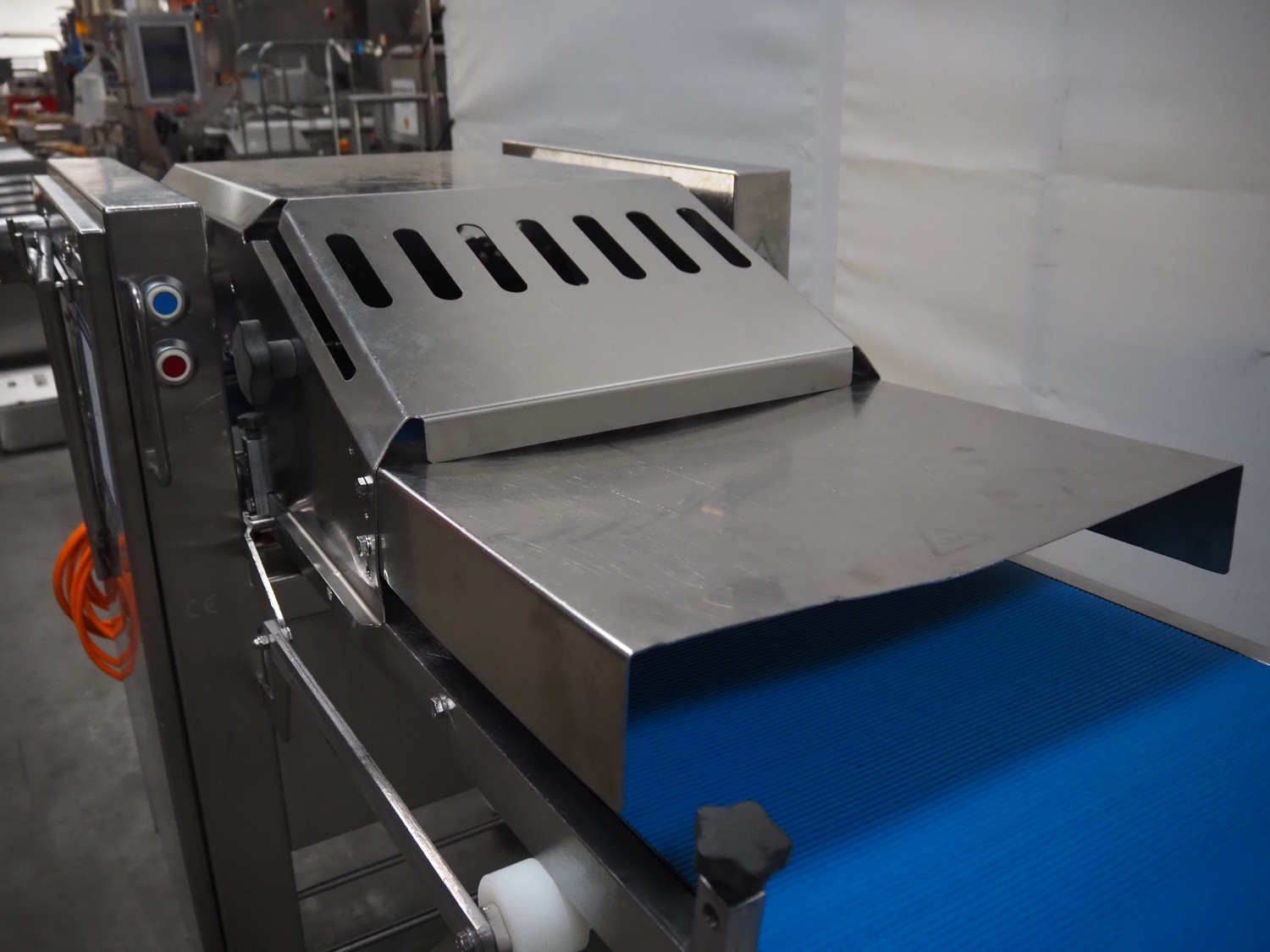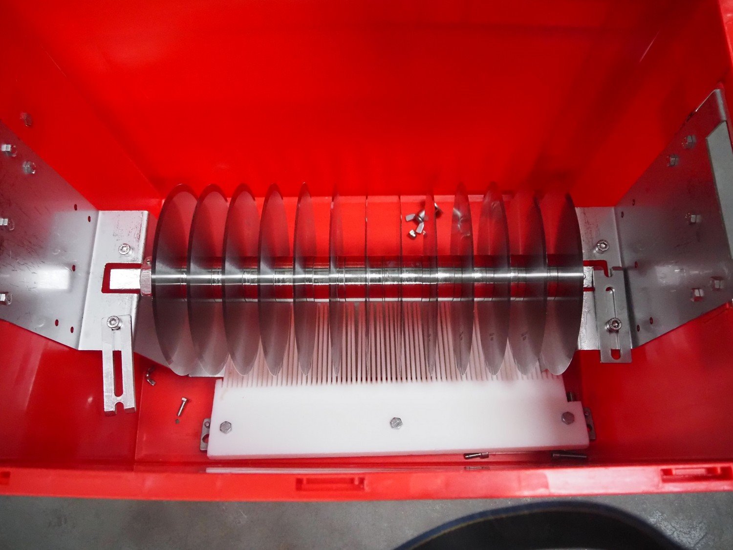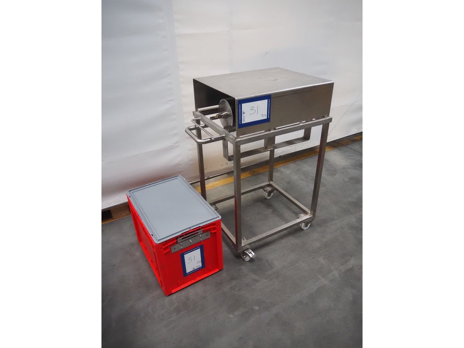 Nock mobile strip cutter, type: CB495/5K, serial number: 09020110, year of construction: 2006, 400 V, 3 Ph, 50 Hz, 10 A, plastic belt, belt width: 430 mm, 16 knives, distance between knives: 30 mm, total dimensions: 2400 mm x 850 mm x 1480 mm. Including 2 extra knives, (1x) 30 mm, (1x) 15 mm, and s/s trolley, dimensions: 570 mm x 830 mm x 1100 mm.
