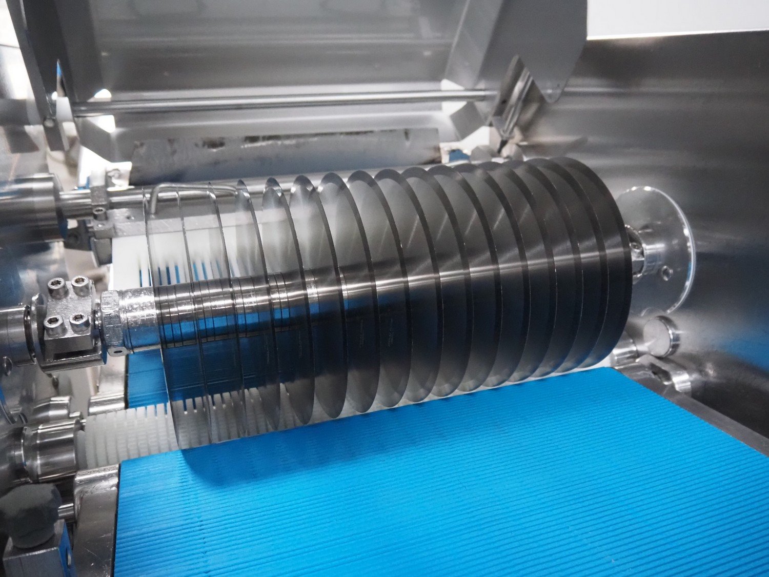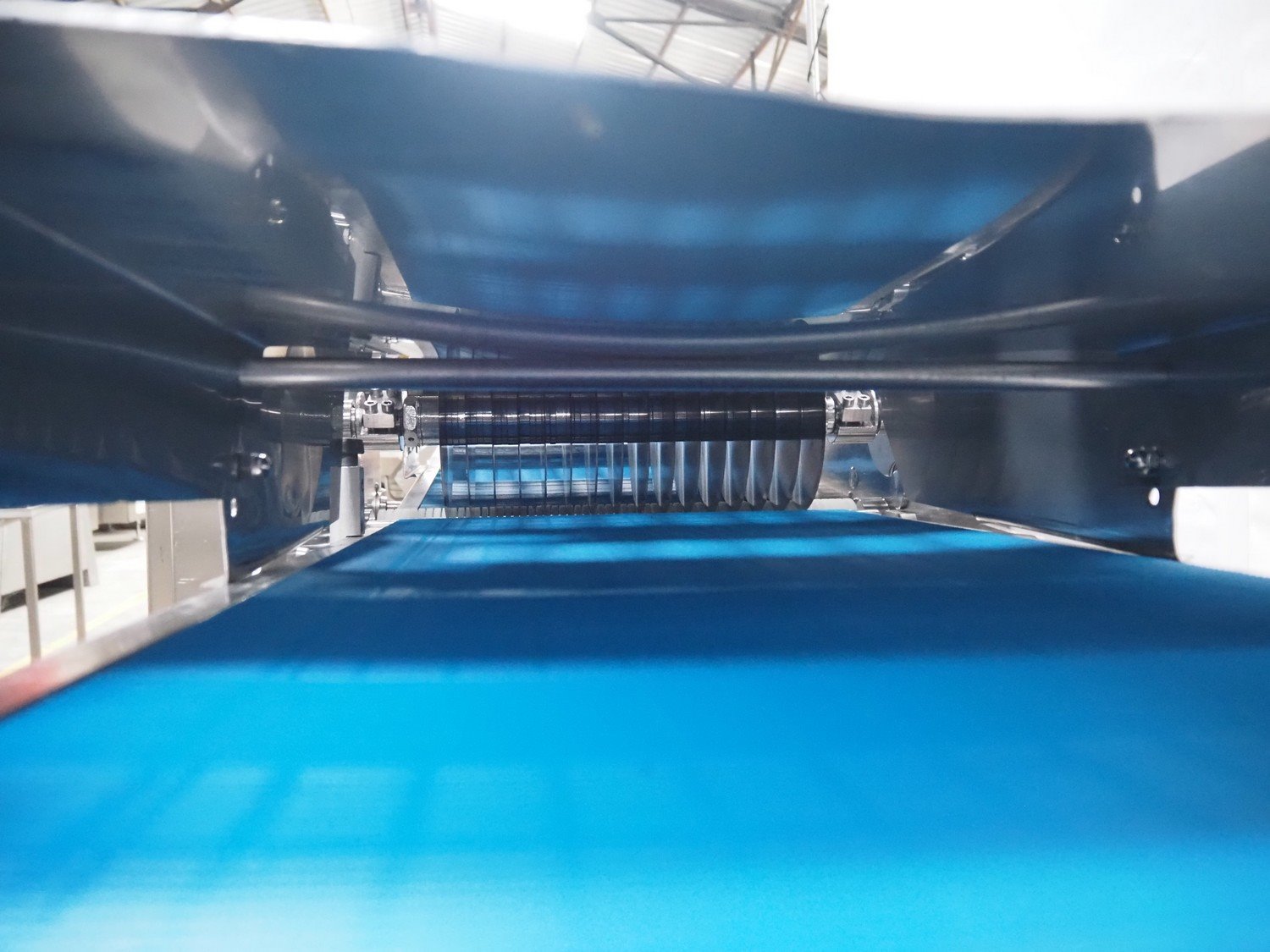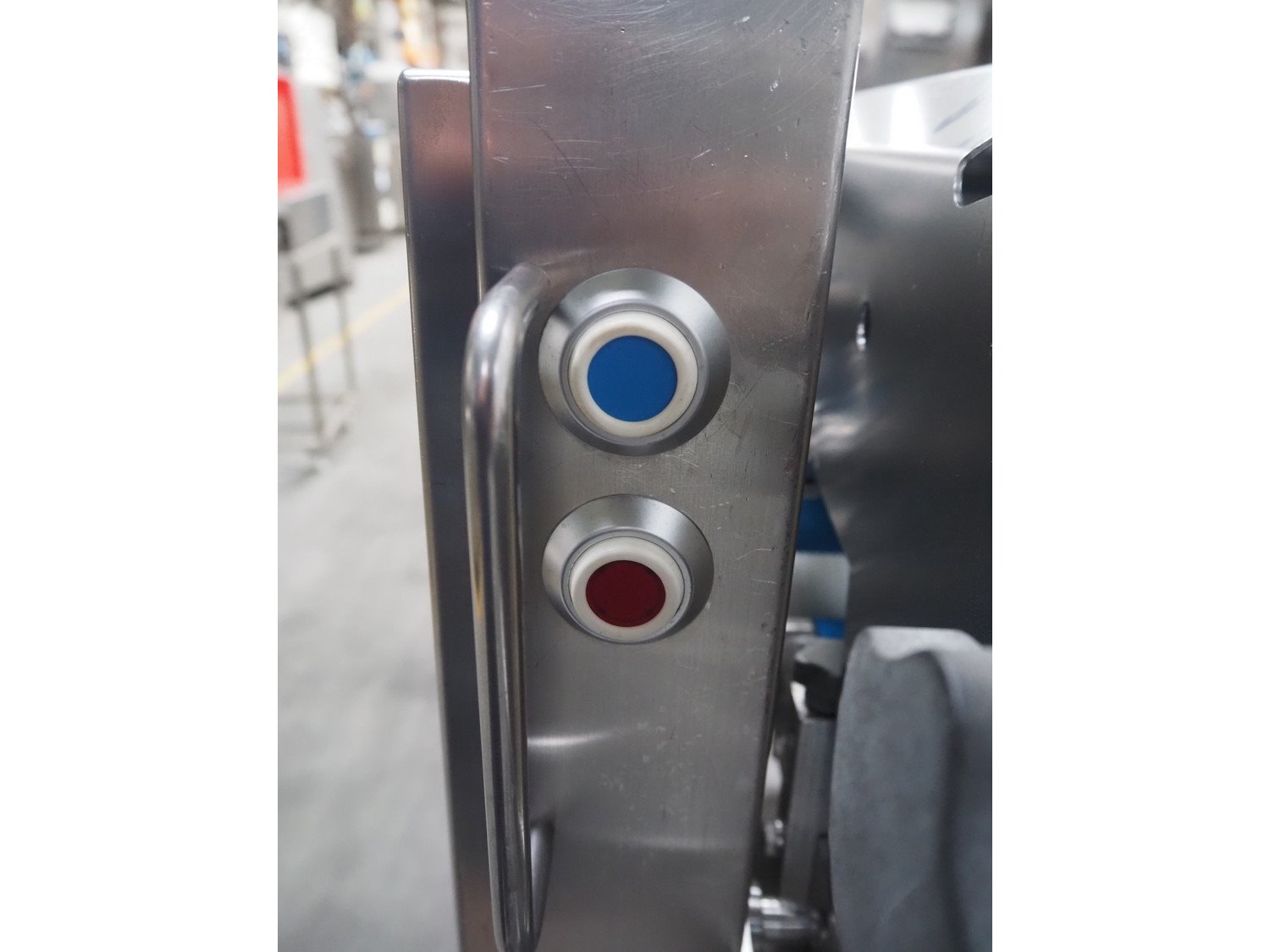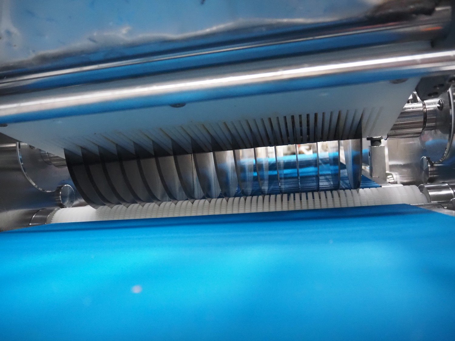 Nock mobile strip cutter, type: CB495/5K, serial number: 09020110, year of construction: 2006, 400 V, 3 Ph, 50 Hz, 10 A, plastic belt, belt width: 430 mm, 16 knives, distance between knives: 30 mm, total dimensions: 2400 mm x 850 mm x 1480 mm. Including 2 extra knives, (1x) 30 mm, (1x) 15 mm, and s/s trolley, dimensions: 570 mm x 830 mm x 1100 mm.