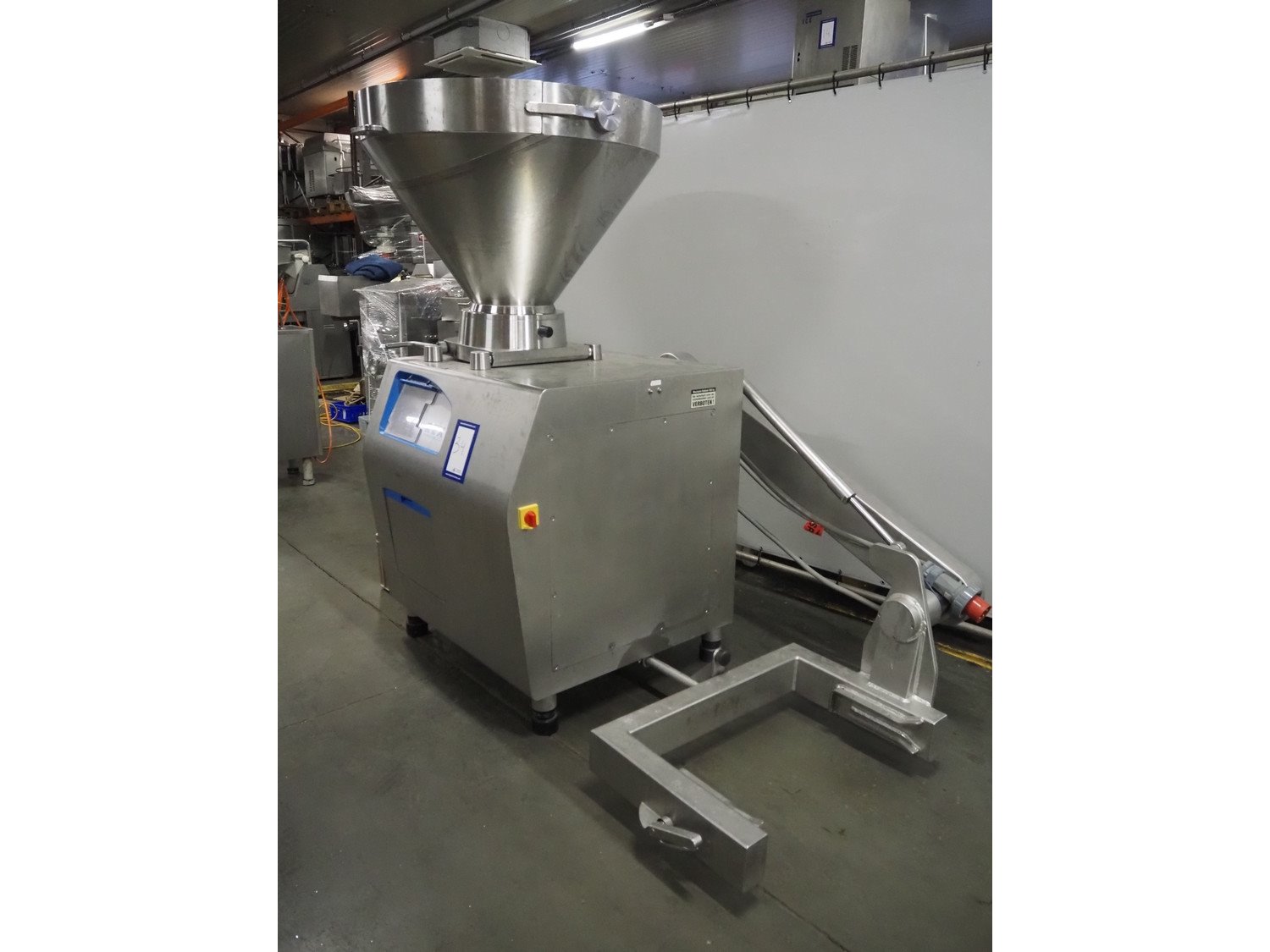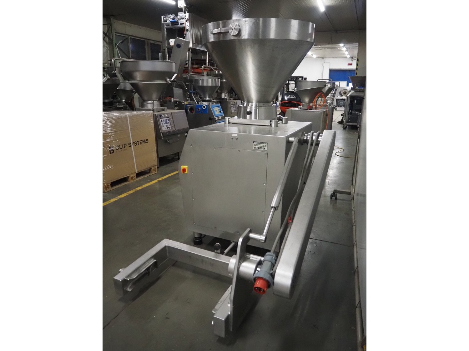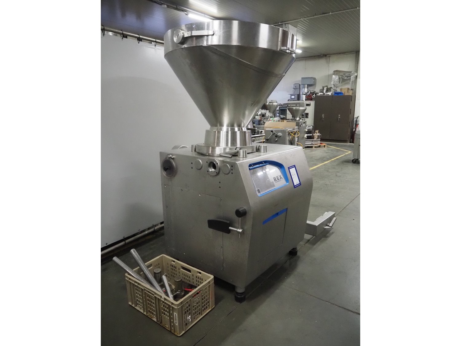Rex Technologie vacuum filling machine with lifter for 200 liter meat bins, type: RVF 911, machine number: 9110090529, 400 V, 3 Ph, 50 Hz, 44 A, 22 kW, dimensions: 2100 mm x 1400 mm x 2070 mm. Including crate with parts and 2 rotors with 8 and 16 vanes.