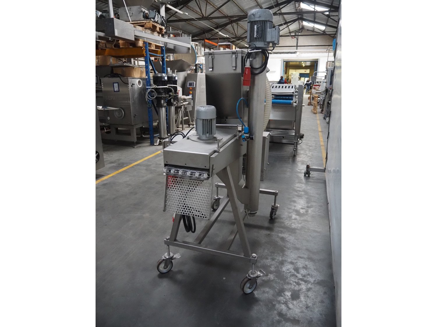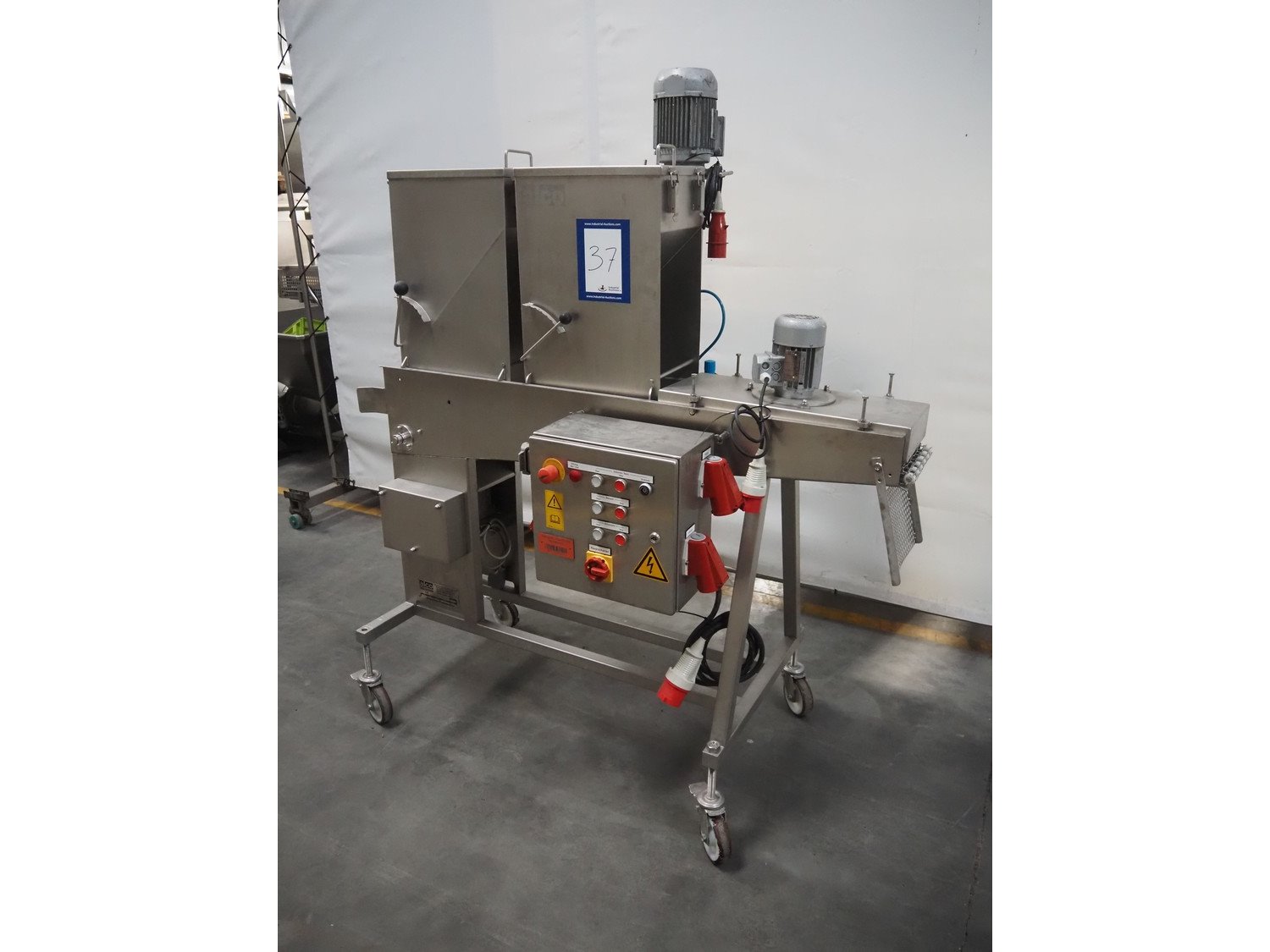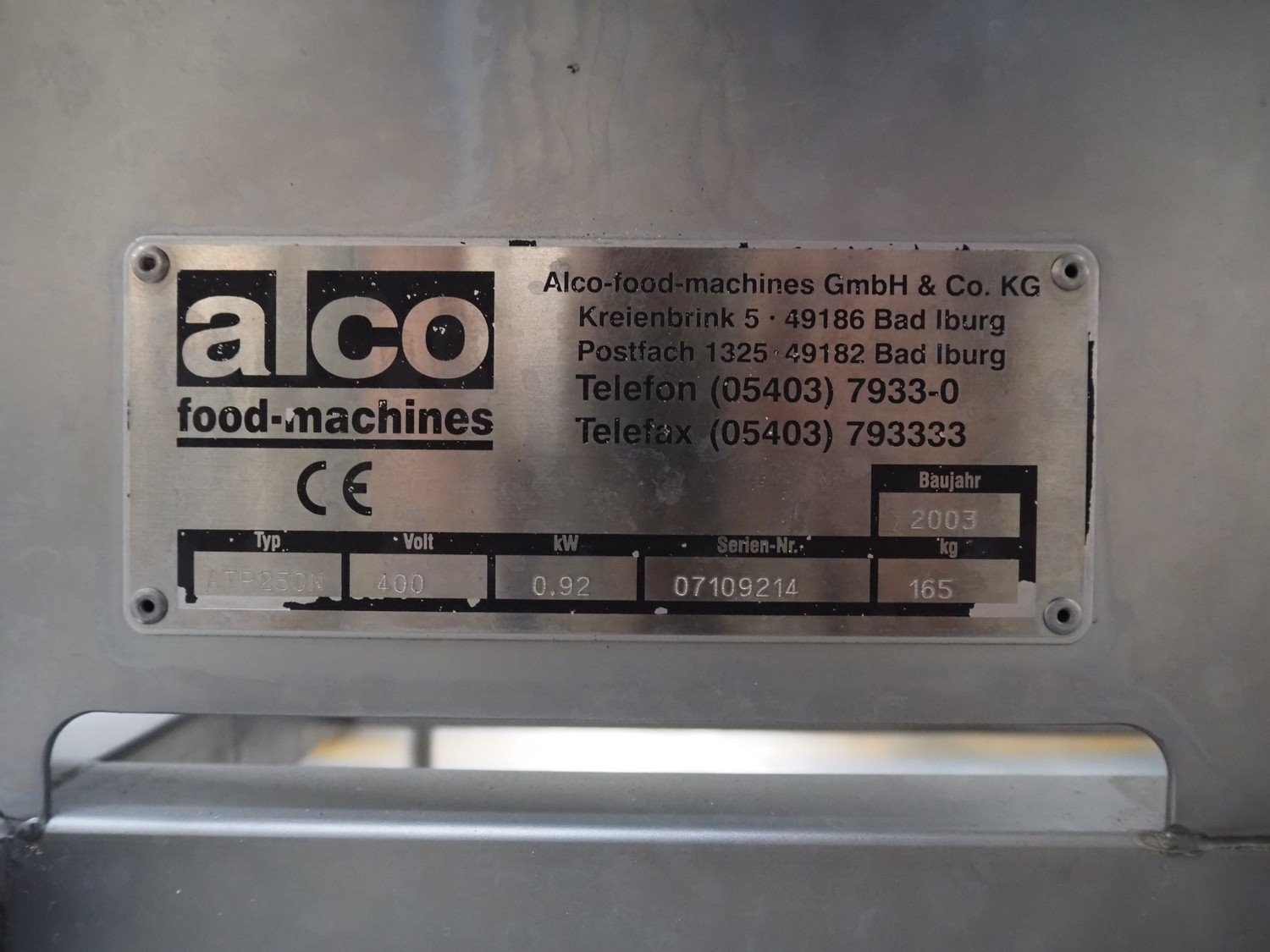 Alco Food Machines GmbH mobile breading machine, type: ATP250N, serial number: 07109214, year of construction: 2003, 400 V, 0.92 kW, weight: 165 kg, s/s mesh belt, belt width: 250 mm, total dimensions: 1730 mm x 720 mm x 1860 mm.