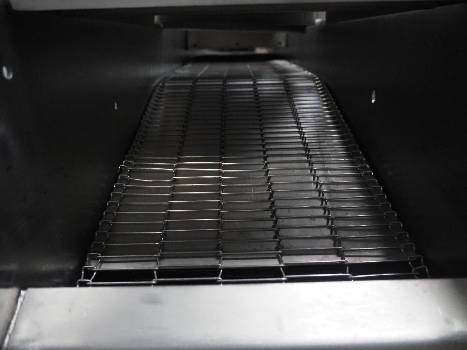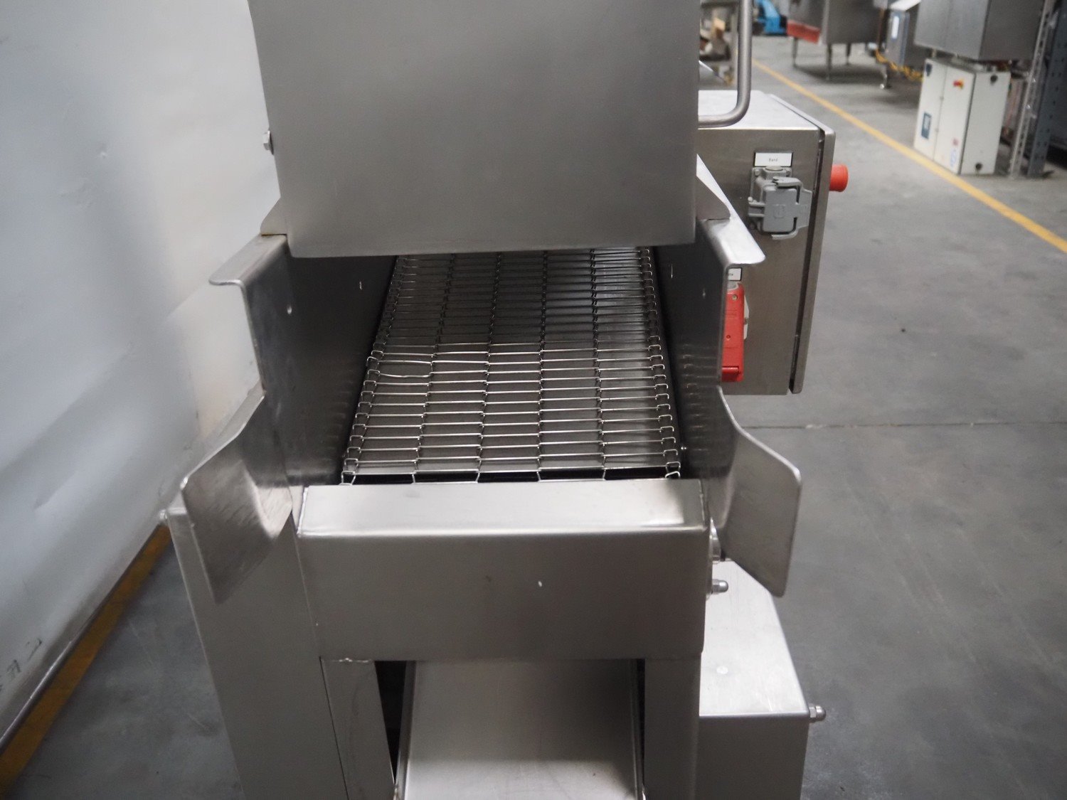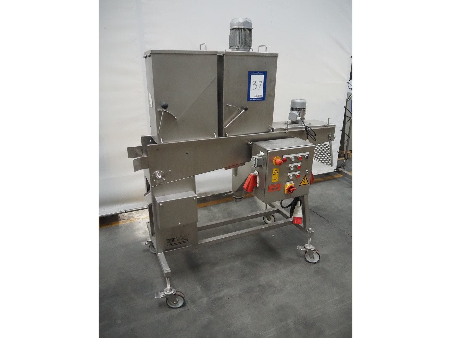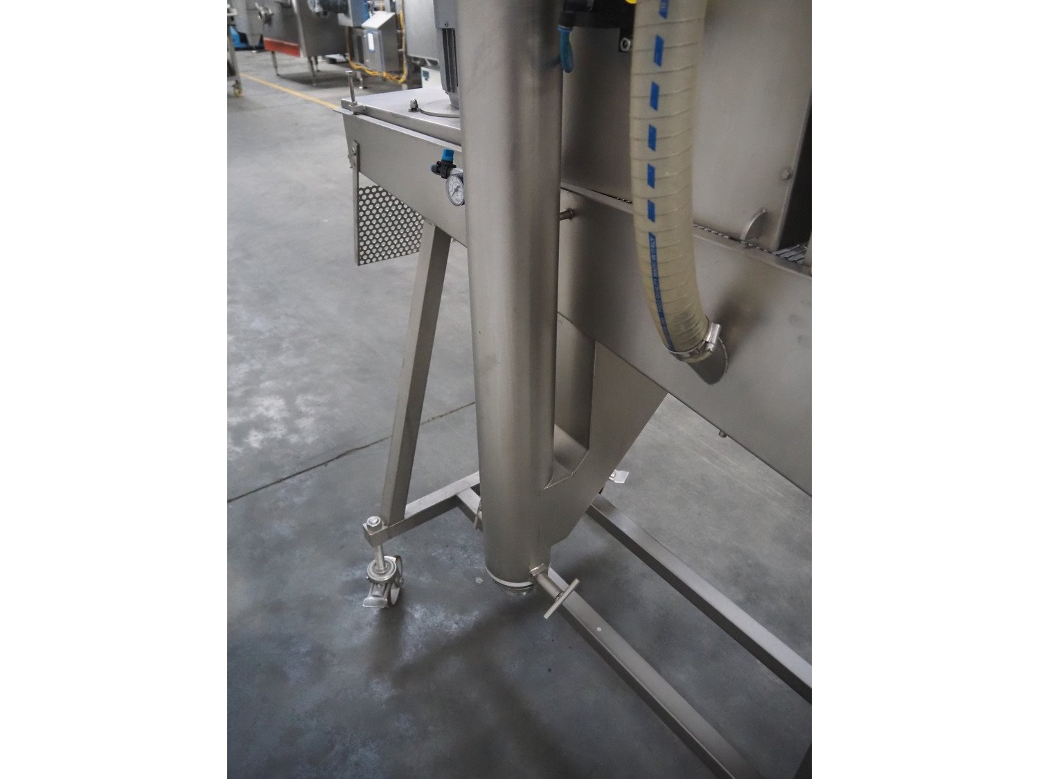 Alco Food Machines GmbH mobile breading machine, type: ATP250N, serial number: 07109214, year of construction: 2003, 400 V, 0.92 kW, weight: 165 kg, s/s mesh belt, belt width: 250 mm, total dimensions: 1730 mm x 720 mm x 1860 mm.