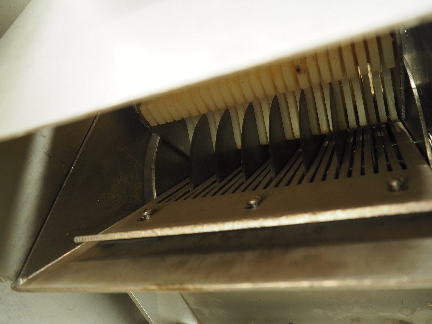 Brunner strip cutter, 7 knives, distance between knives: 15 mm and 25 mm, total dimensions: 1000 mm x 750 mm x 1400 mm.