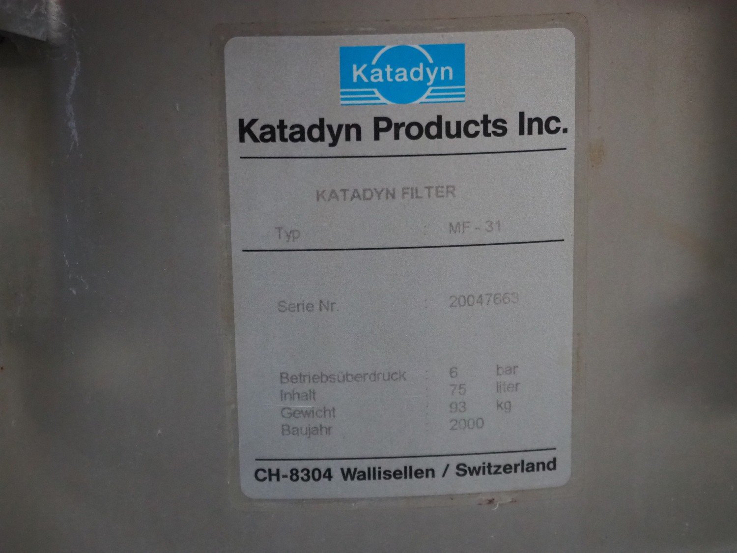 Katadyn Products Inc Katadyn filter, type: MF-31, serial number: 20047663, year of construction: 2000, volume: 75 liter, weight: 93 kg, dimensions: Ø 650 mm x 1100 mm.