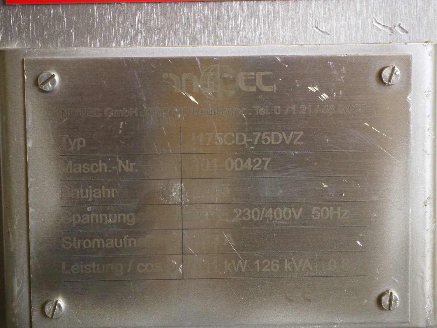 Inotec emulsifier, type: I175CD-75DVZ, number: 101-00427, year of construction: 2005, 230/400 V, 3 Ph, 50 Hz, 182 A, 111 kW, 126 kVa, plate diameter: 175 mm, total dimensions: 1850 mm x 1200 mm x 2785 mm. Including switch cabinet, dimensions: 600 mm x 1250 mm x 2350 mm. Overhauled by Servo.