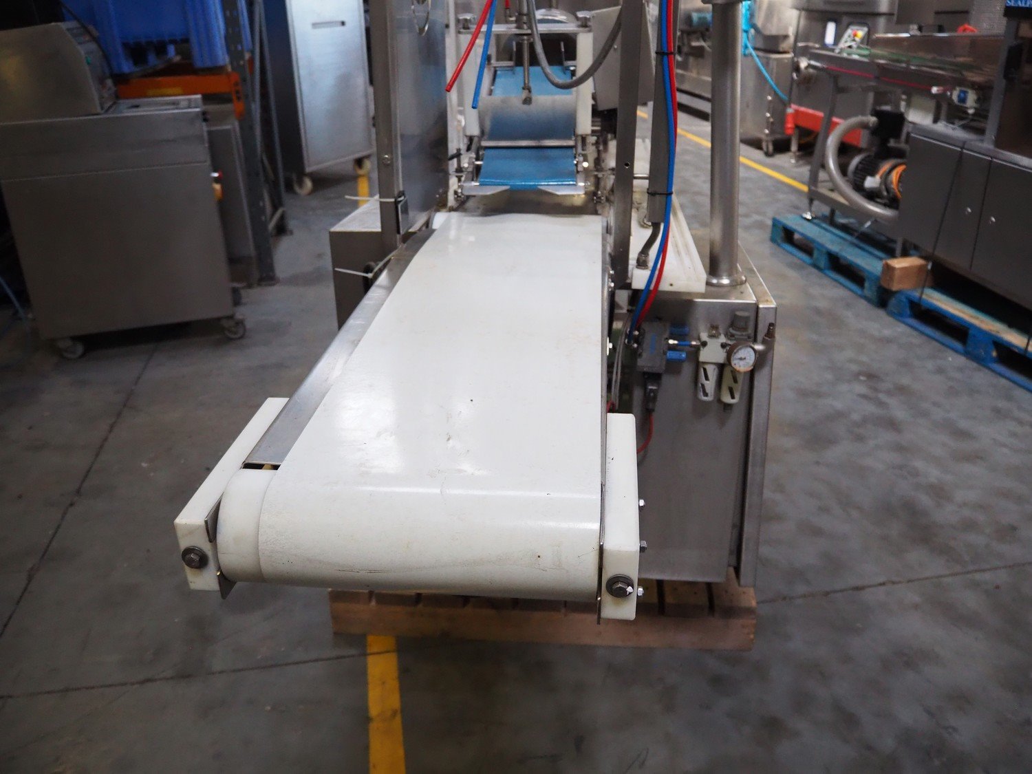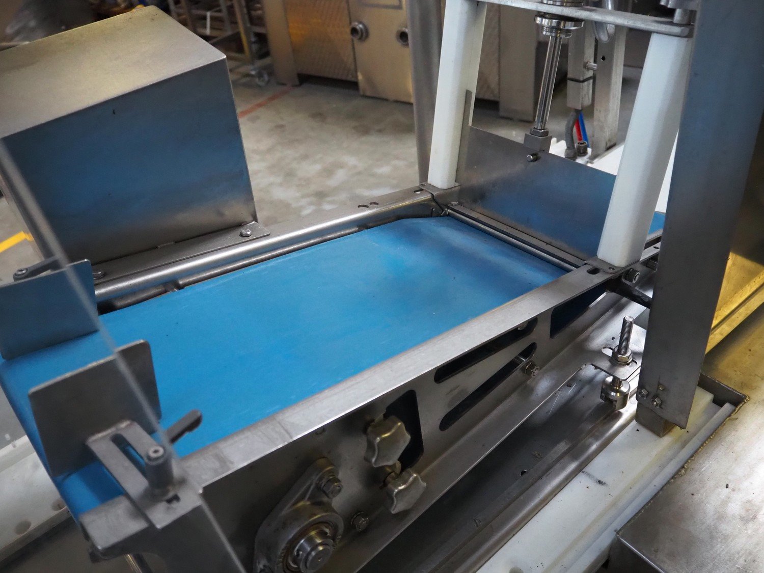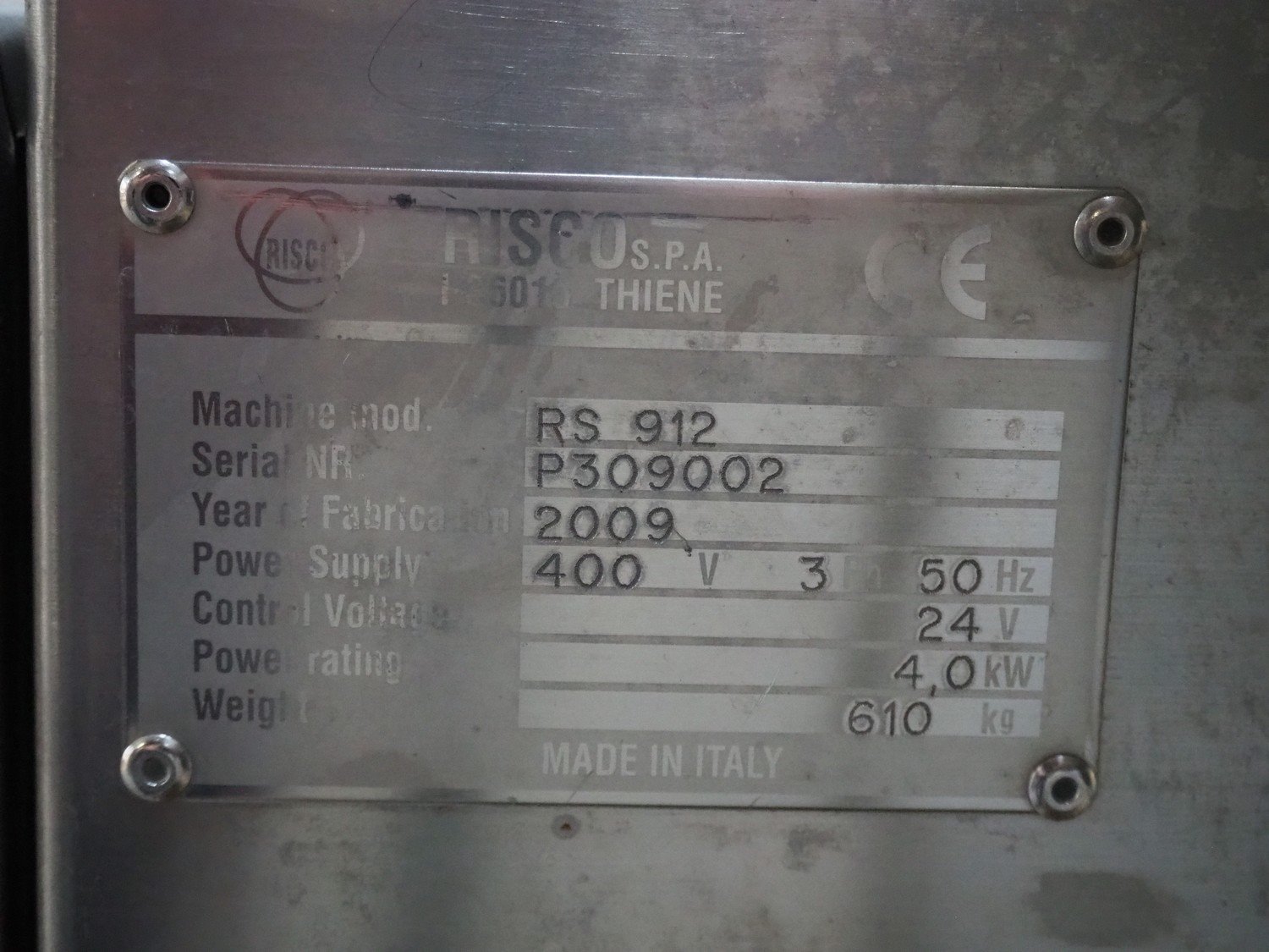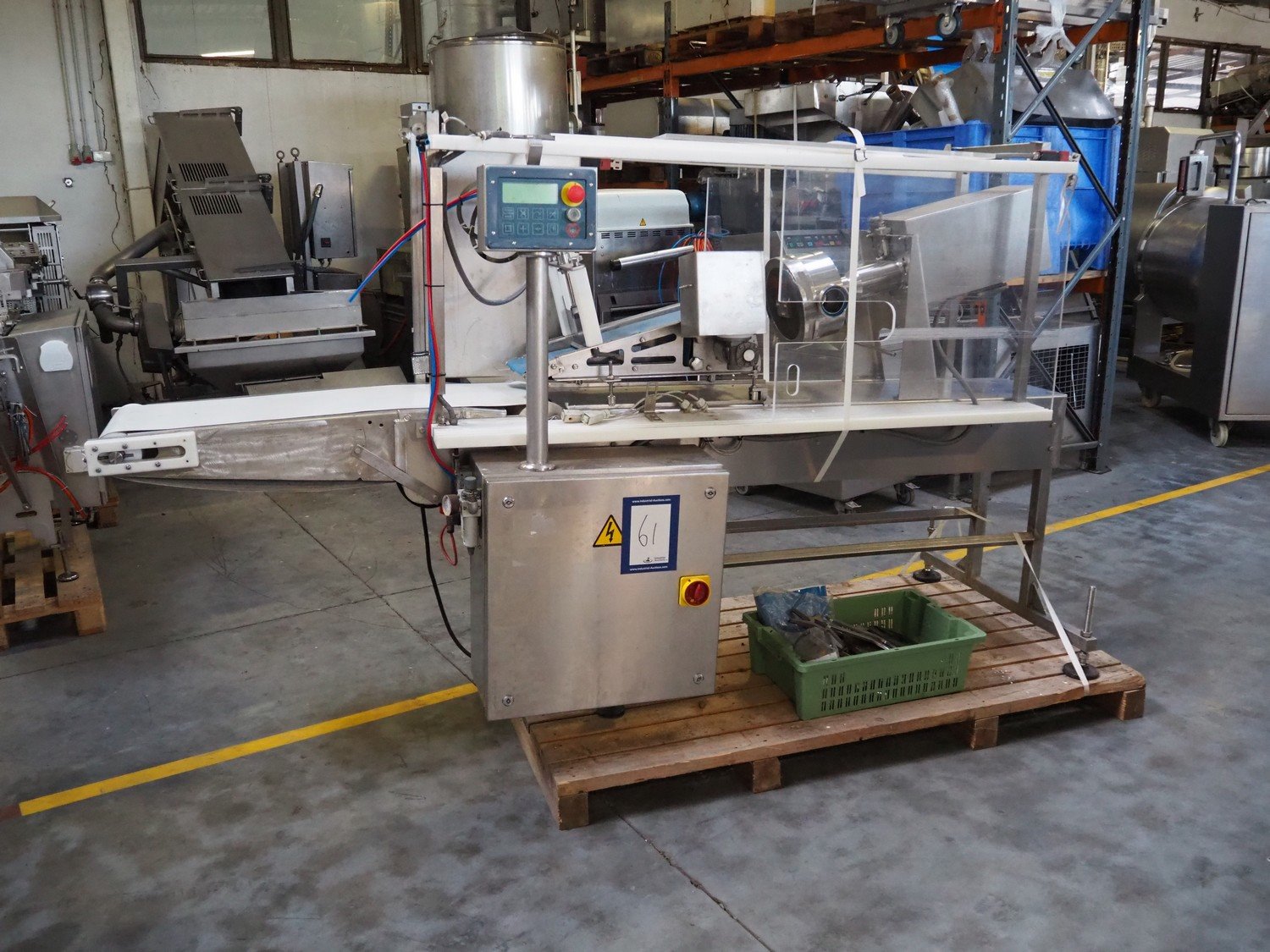 Risco S.p.A. portioning machine for minced meat, model: RS 912, serial number: P309002, year of construction: 2009, 400 V, 3 Ph, 50 Hz, 4.0 kW, weight: 610 kg, plastic belt, belt width: 185 mm and 300 mm, total dimensions: 2700 mm x 800 mm x 1700 mm.