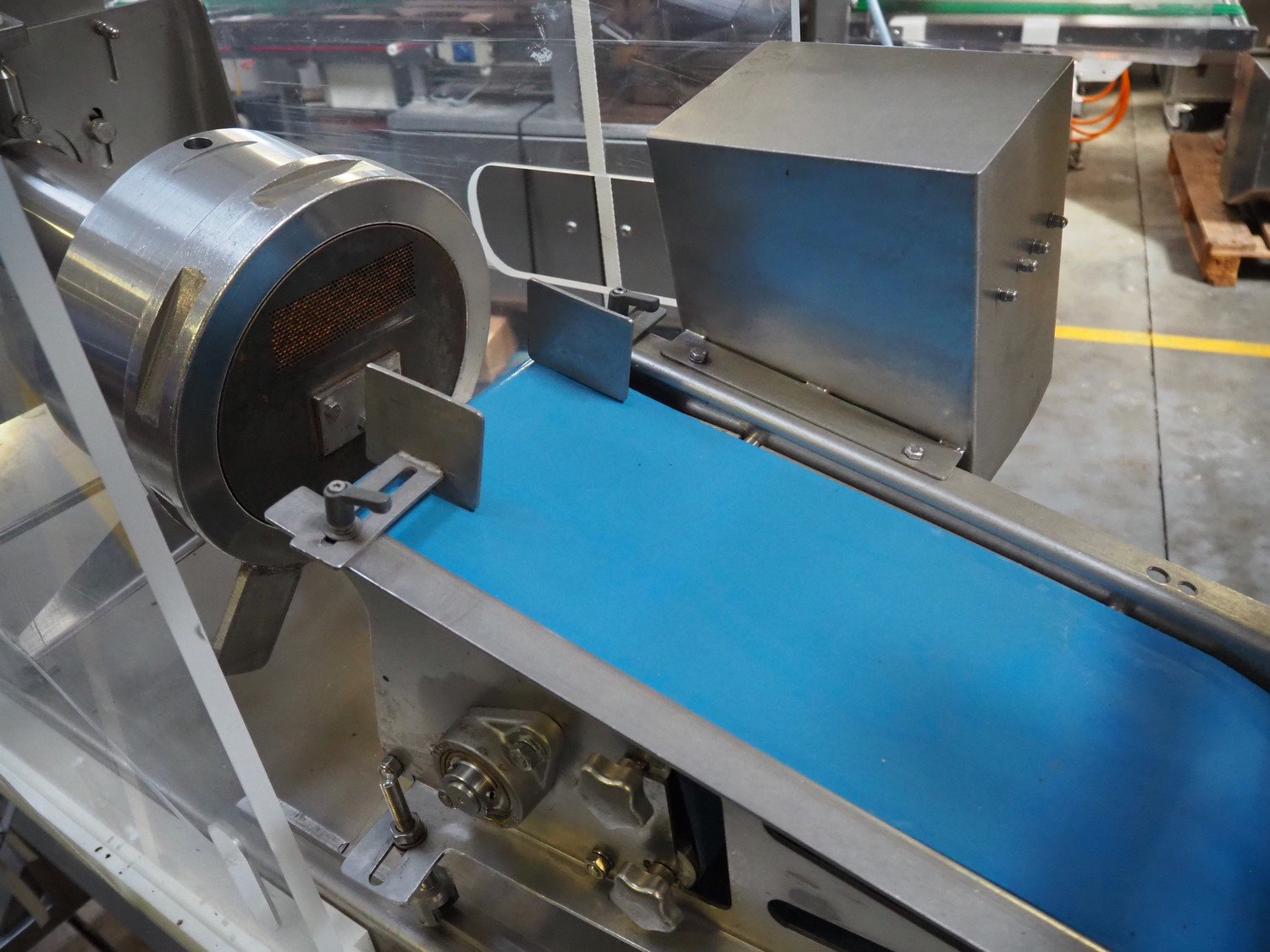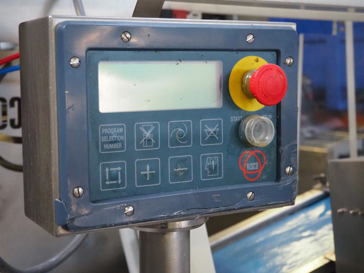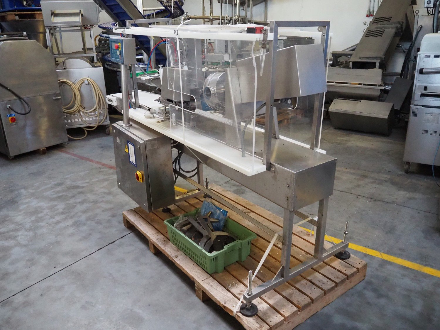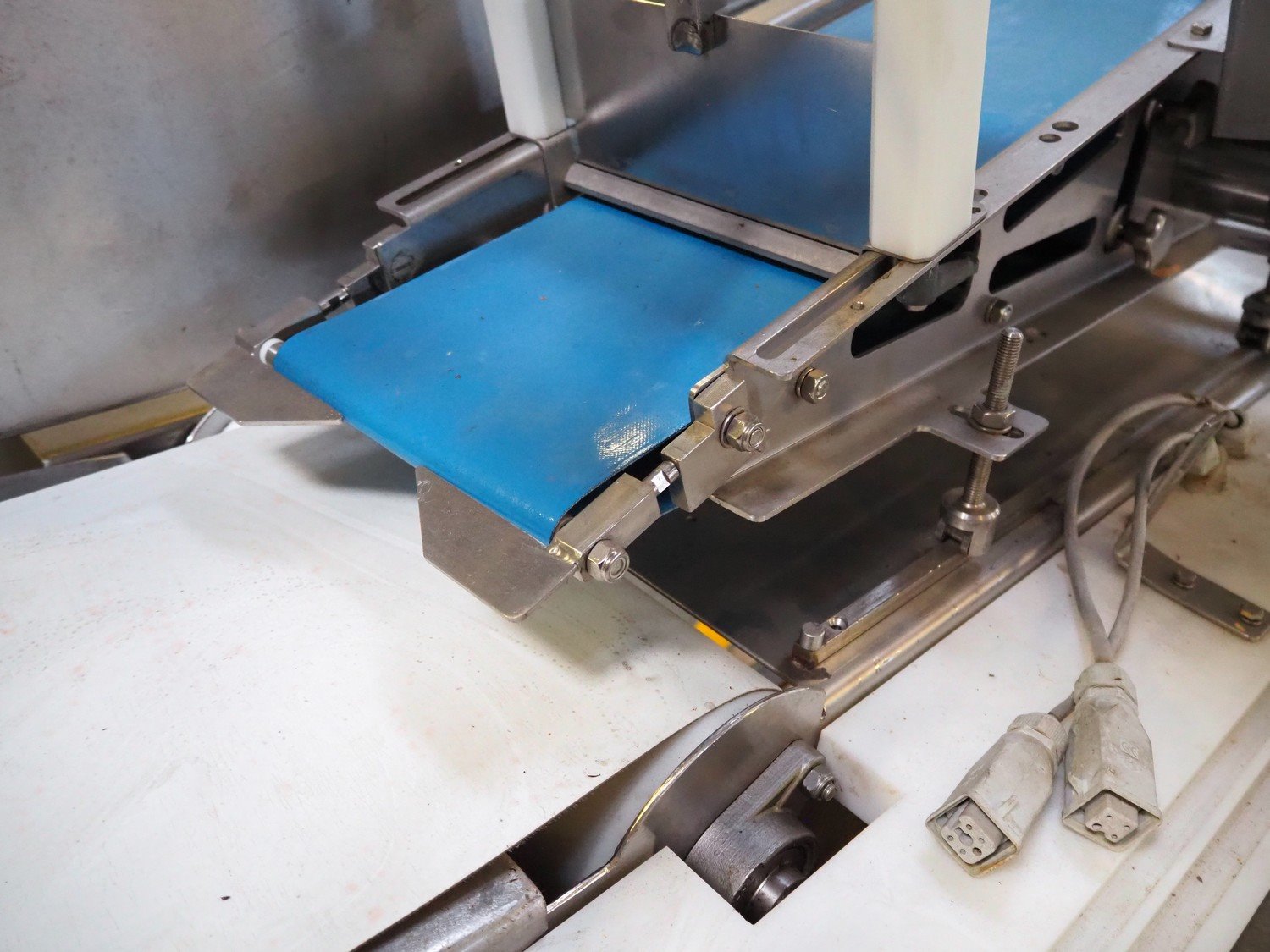 Risco S.p.A. portioning machine for minced meat, model: RS 912, serial number: P309002, year of construction: 2009, 400 V, 3 Ph, 50 Hz, 4.0 kW, weight: 610 kg, plastic belt, belt width: 185 mm and 300 mm, total dimensions: 2700 mm x 800 mm x 1700 mm.
