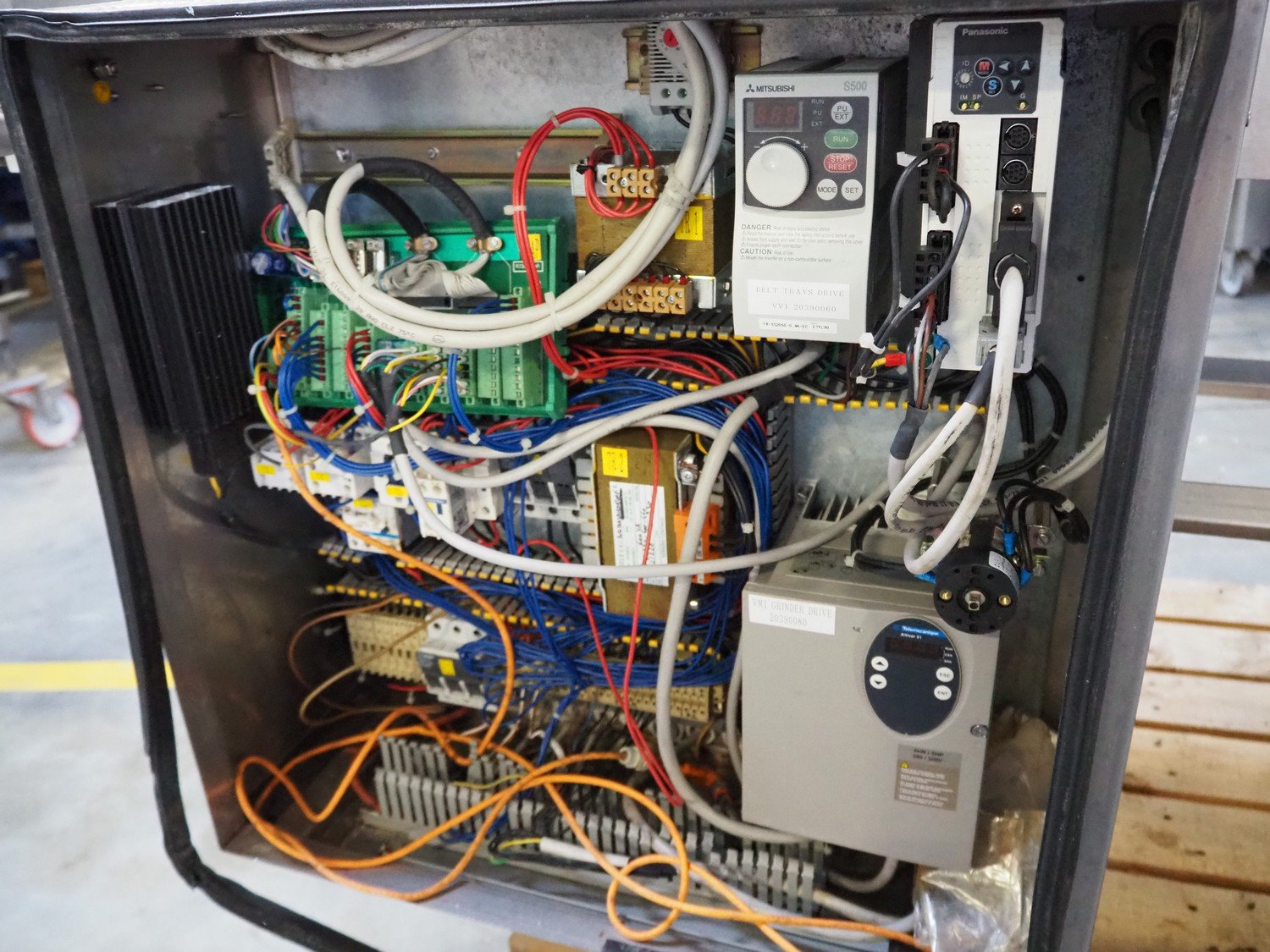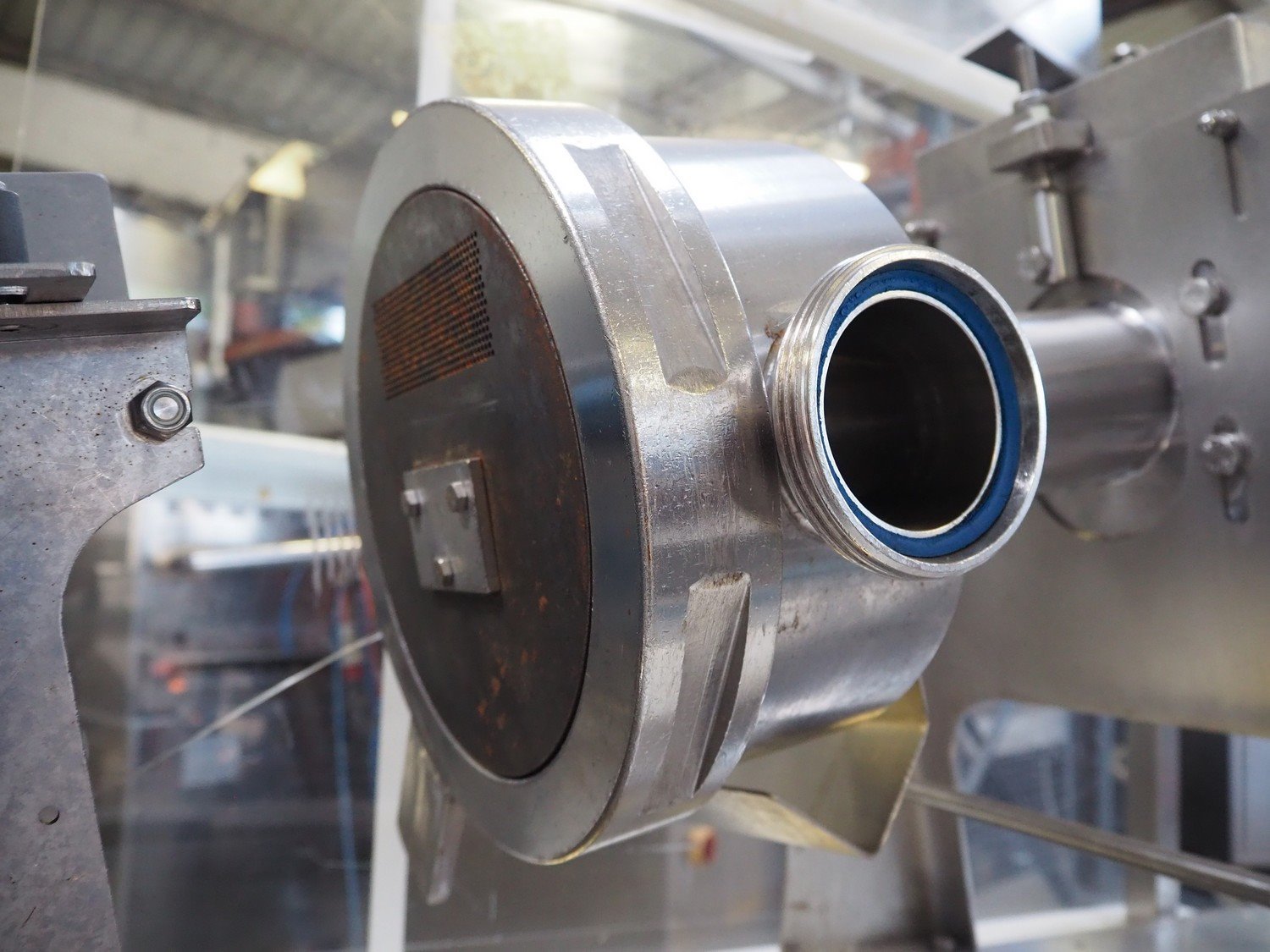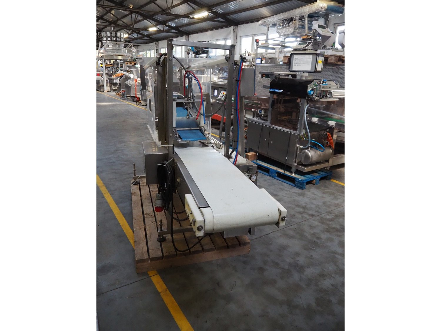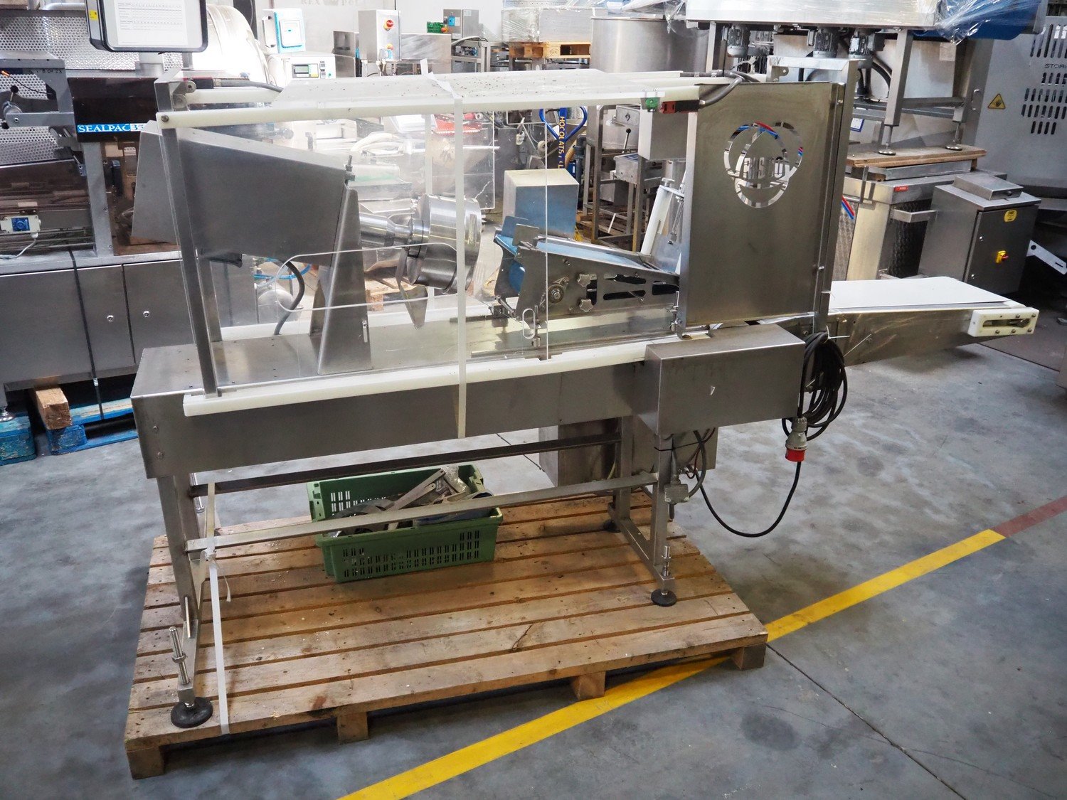 Risco S.p.A. portioning machine for minced meat, model: RS 912, serial number: P309002, year of construction: 2009, 400 V, 3 Ph, 50 Hz, 4.0 kW, weight: 610 kg, plastic belt, belt width: 185 mm and 300 mm, total dimensions: 2700 mm x 800 mm x 1700 mm.