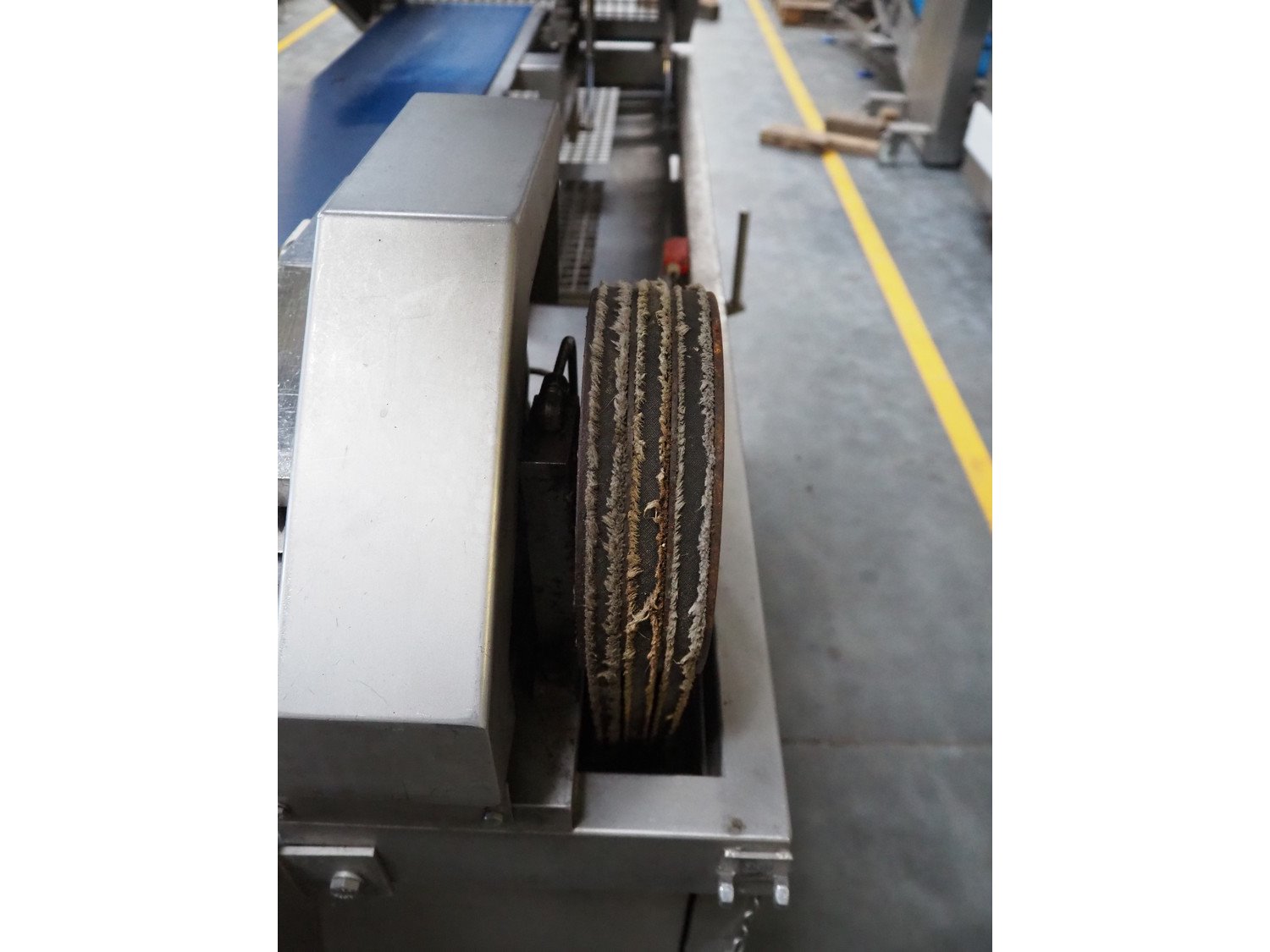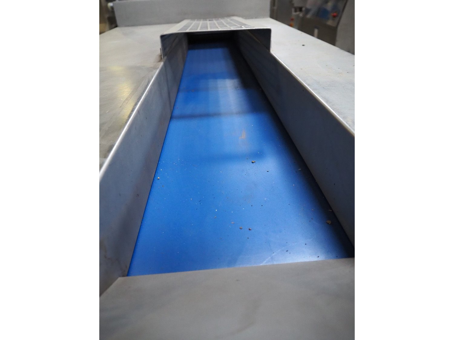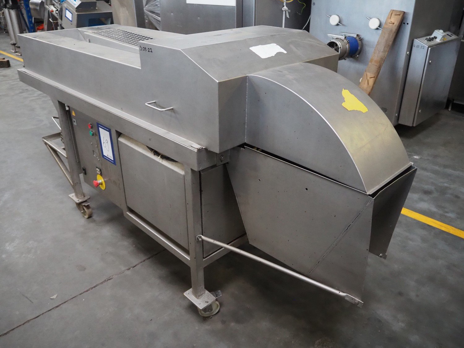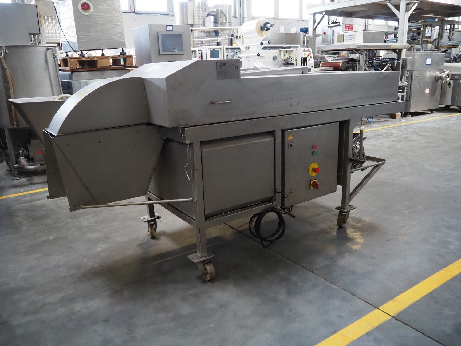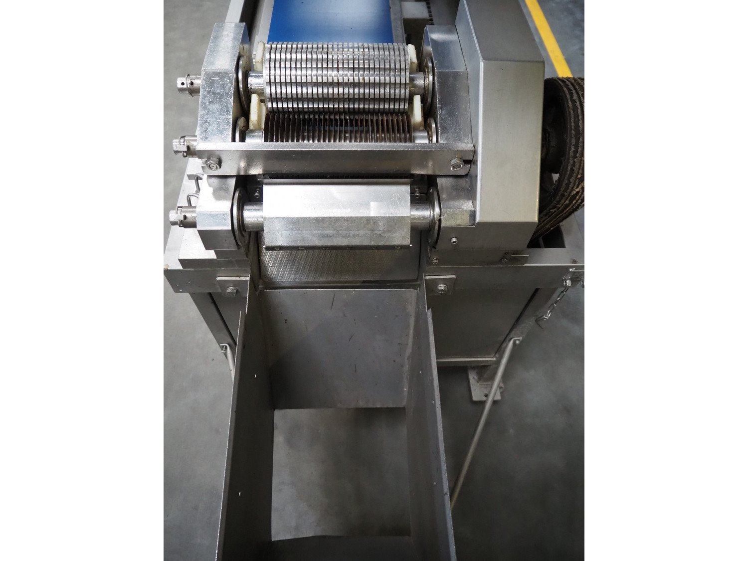 FAM slicer/dicer, type: PMD-2D, serial number: 4371, year of construction: 1999, 380 V, 3 Ph, 50 Hz, 7.5 kW, weight: 450 kg, plastic belt, belt width: 270 mm, 29 knives, distance between knives: 8 mm, total dimensions: 2450 mm x 900 mm x 1200 mm. Including extra belt.