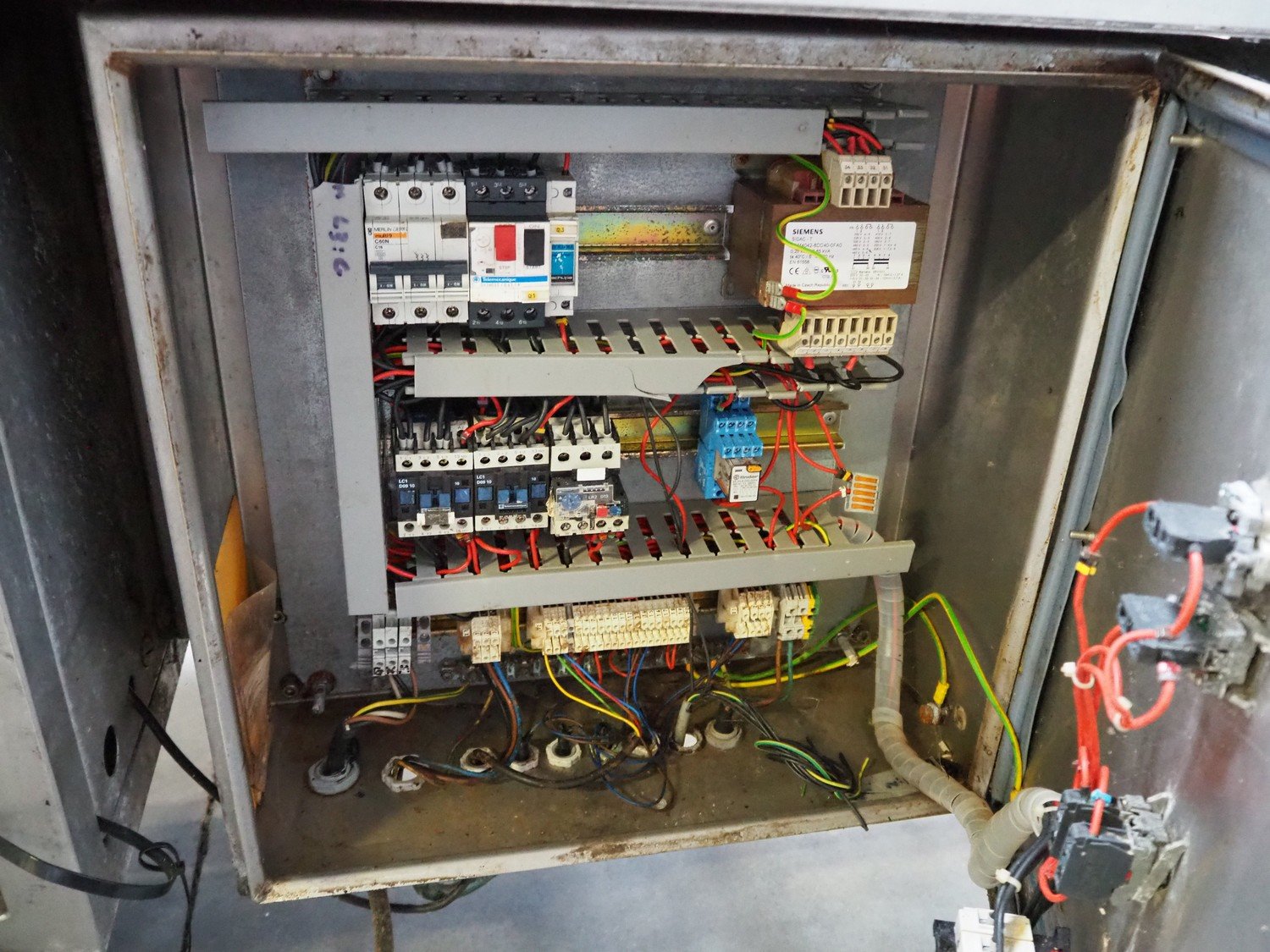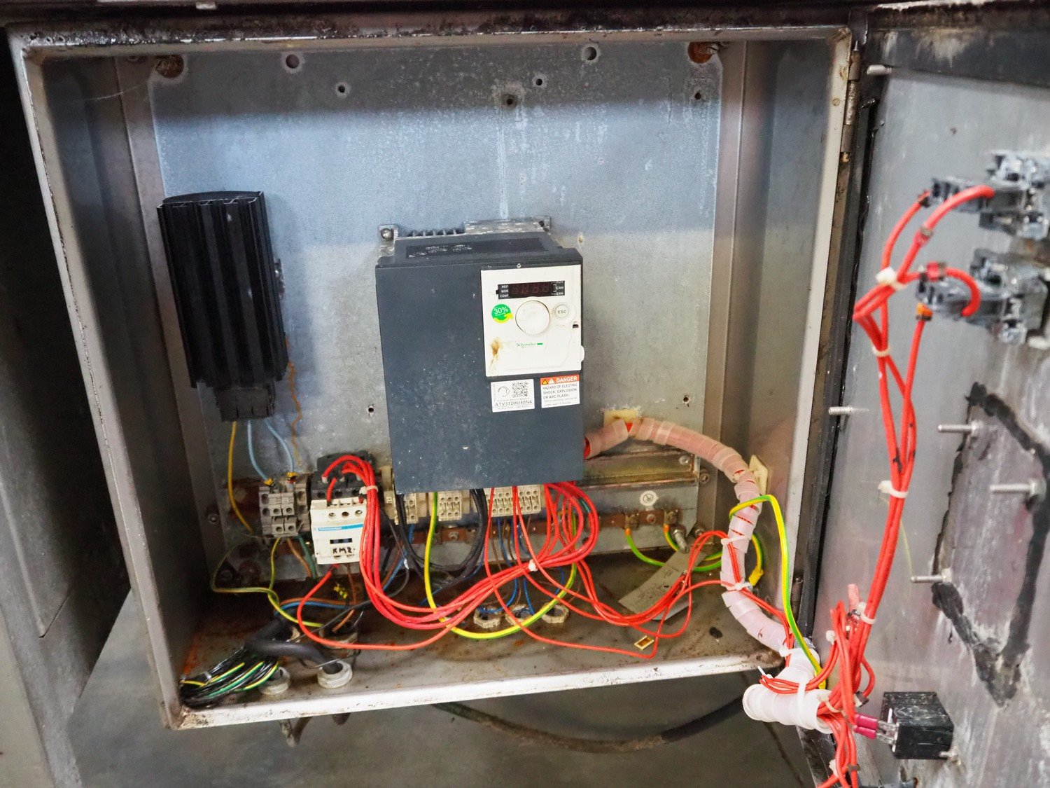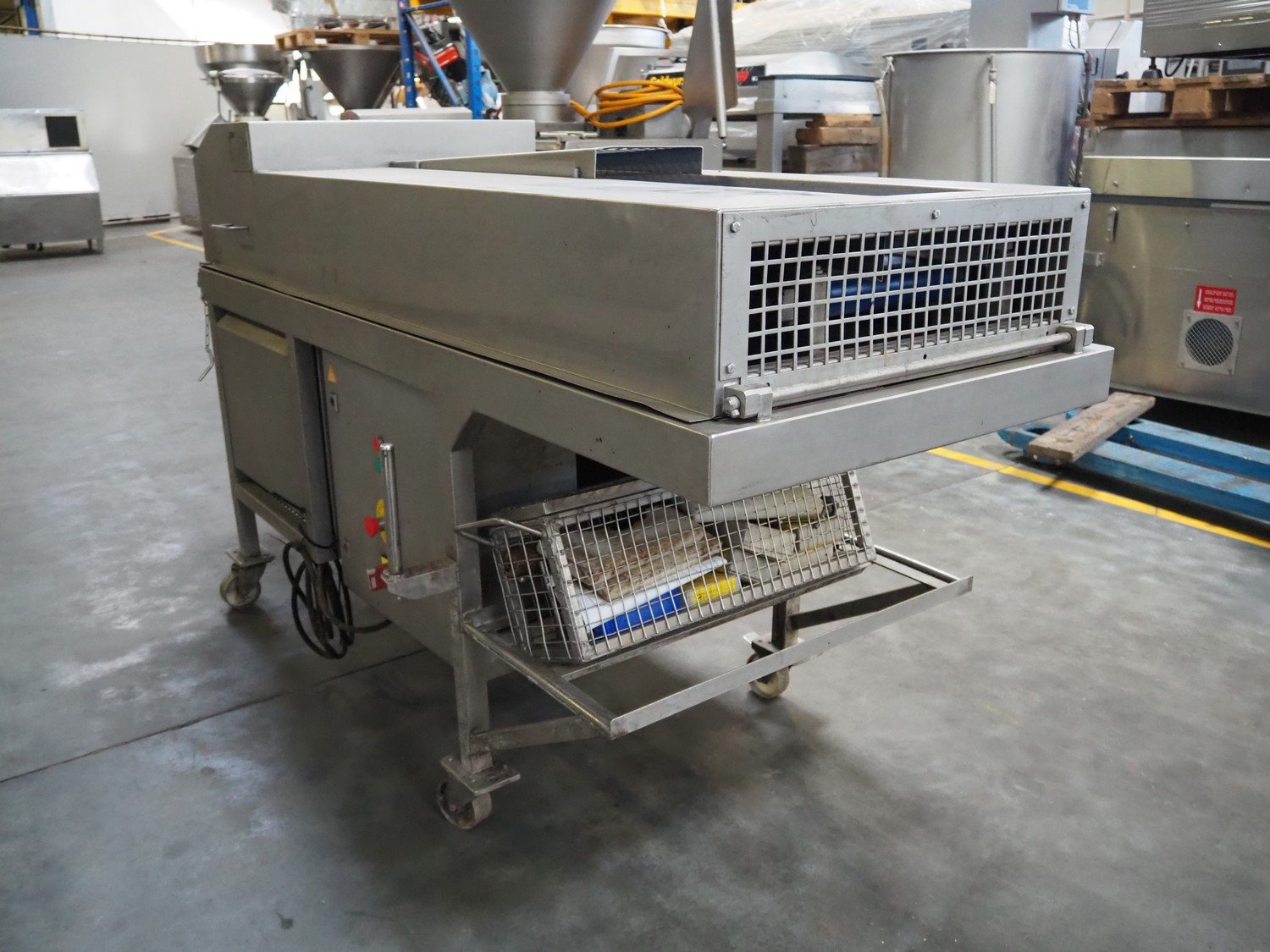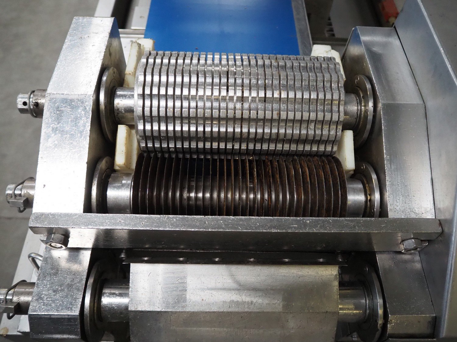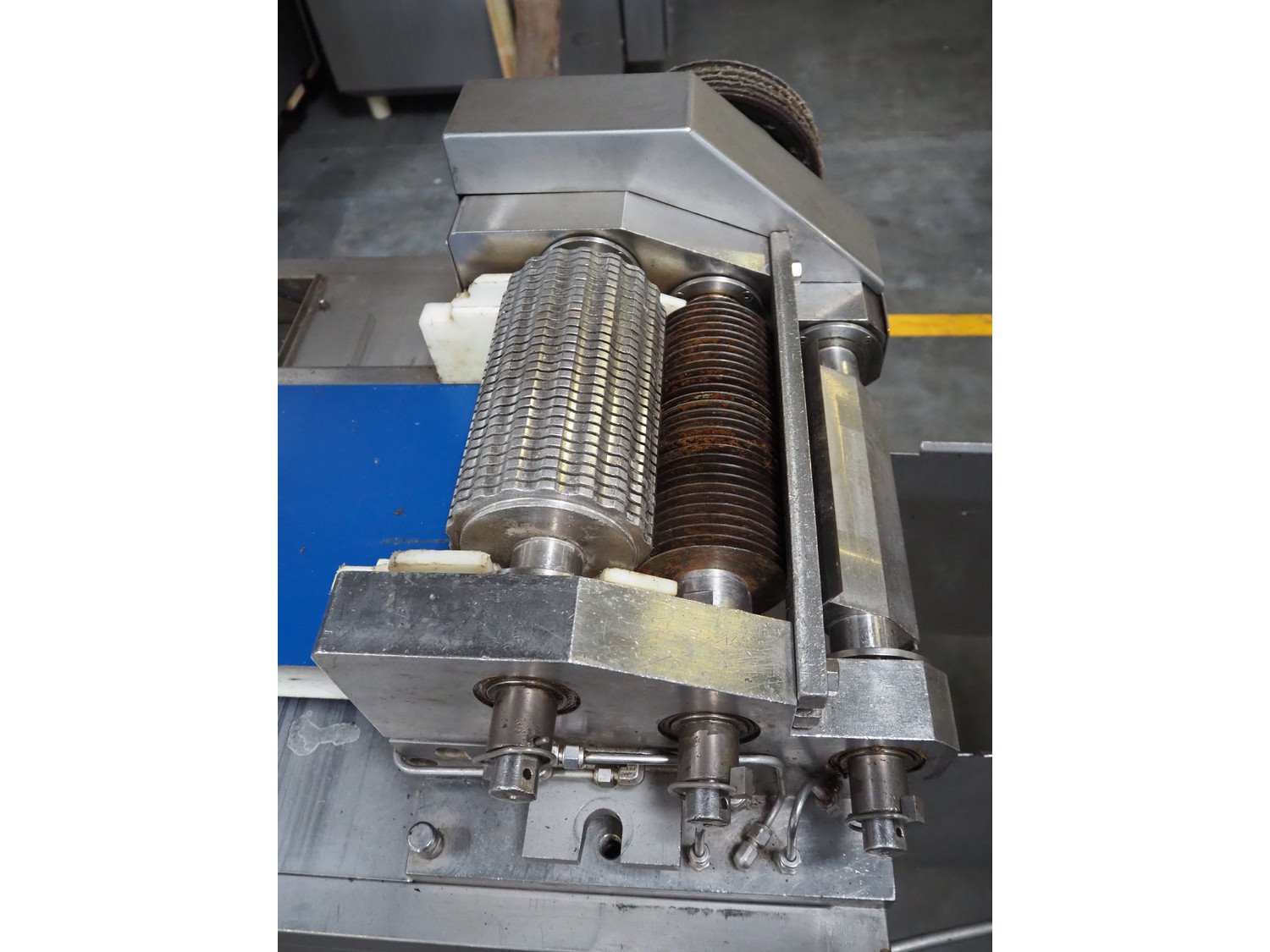 FAM slicer/dicer, type: PMD-2D, serial number: 4371, year of construction: 1999, 380 V, 3 Ph, 50 Hz, 7.5 kW, weight: 450 kg, plastic belt, belt width: 270 mm, 29 knives, distance between knives: 8 mm, total dimensions: 2450 mm x 900 mm x 1200 mm. Including extra belt.