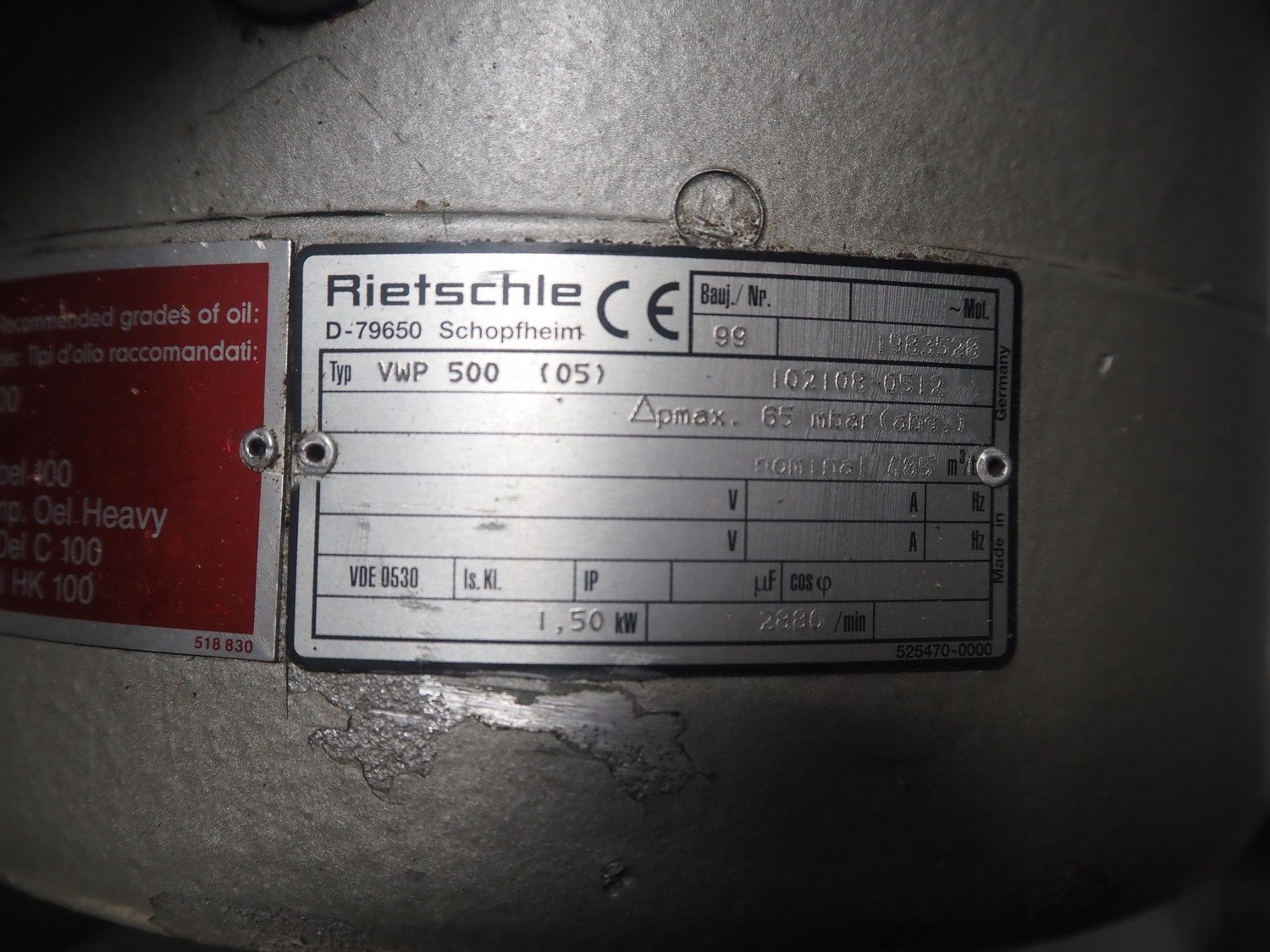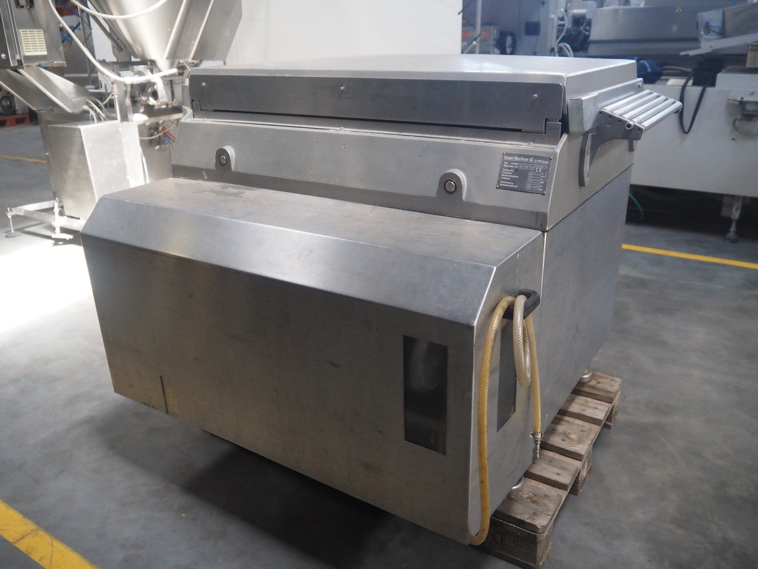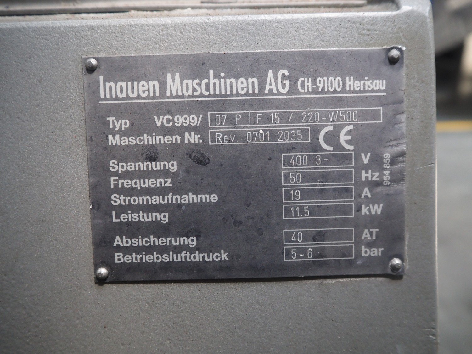 Inauen Maschinen AG belt vacuum machine, type: VC999/07 P|F 15 / 220-W500, machine number: Rev. 0701 2035, 400 V, 3 Ph, 50 Hz, 19 A, 11.5 kW, Rietschle vacuum pump, type: CLFH 220 V (20), capacity: 220 m³/h, seal width: (2x) 450 mm and (1x) 950 mm, dimensions chamber: 950 mm x 450 mm, plastic rollers, roller width: 440 mm, total dimensions: 1200 mm x 1200 mm x 1150 mm.