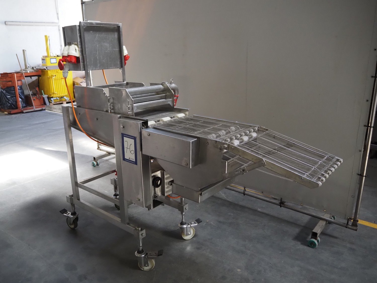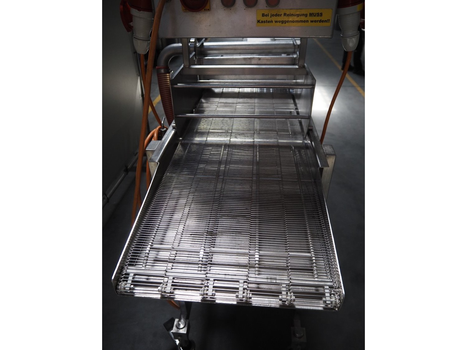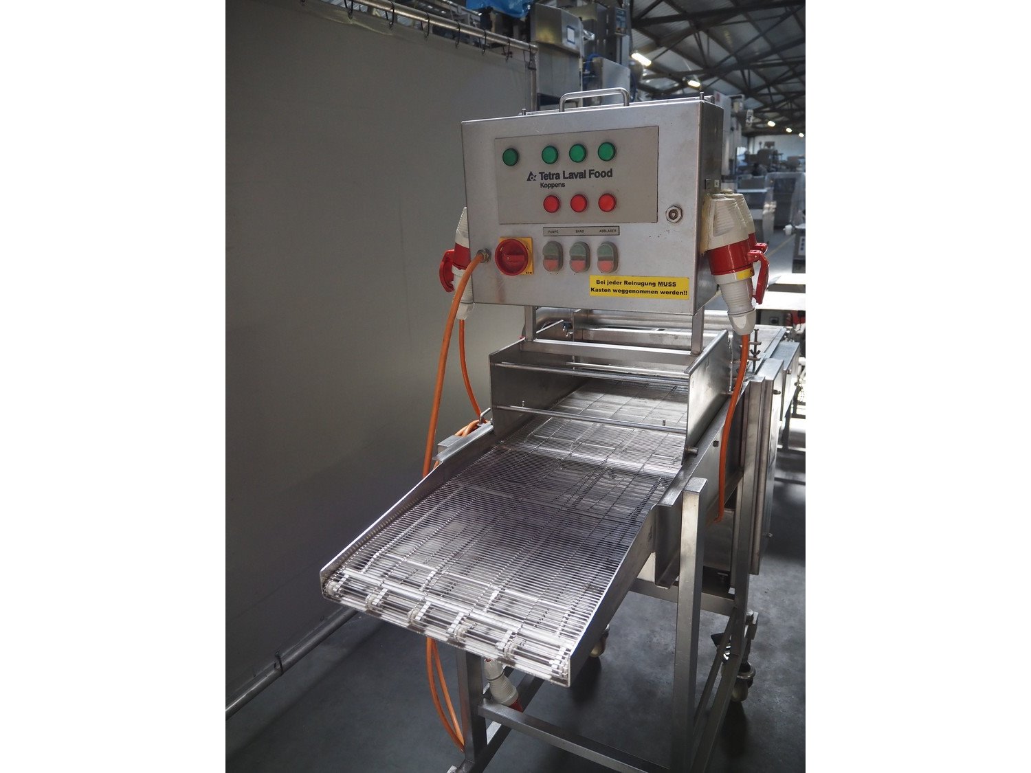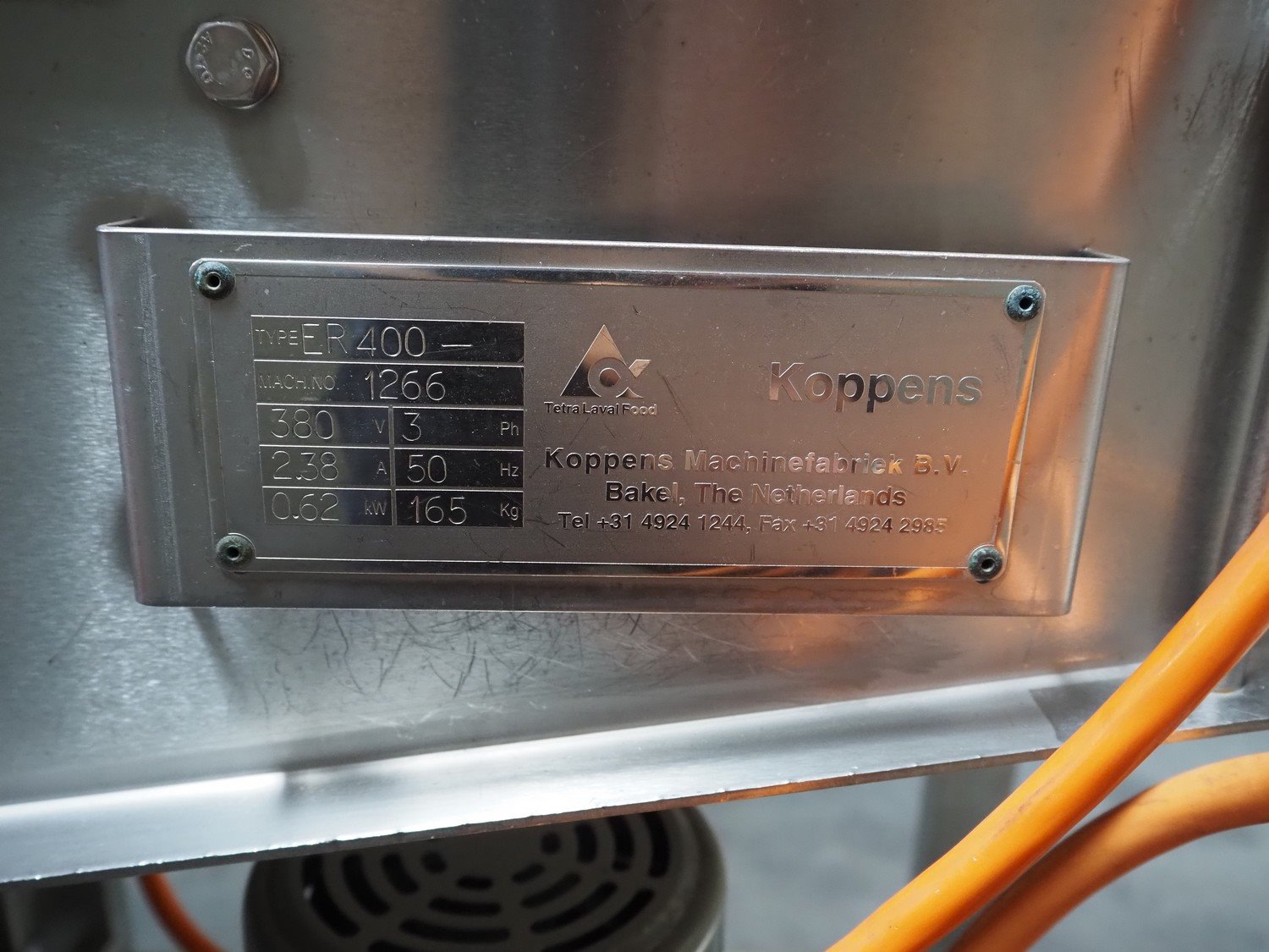 Koppens mobile coating machine, type: ER 400, serial number: 1266, 380 V, 3 Ph, 50 Hz, 2.38 A, 0.62 kW, weight: 165 kg, s/s mesh belt, belt width: 400 mm, total dimensions: 2450 mm x 720 mm x 1810 mm.