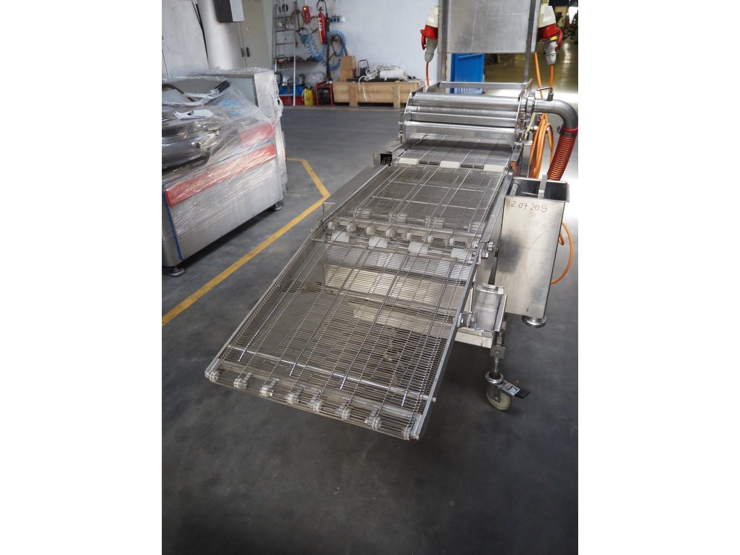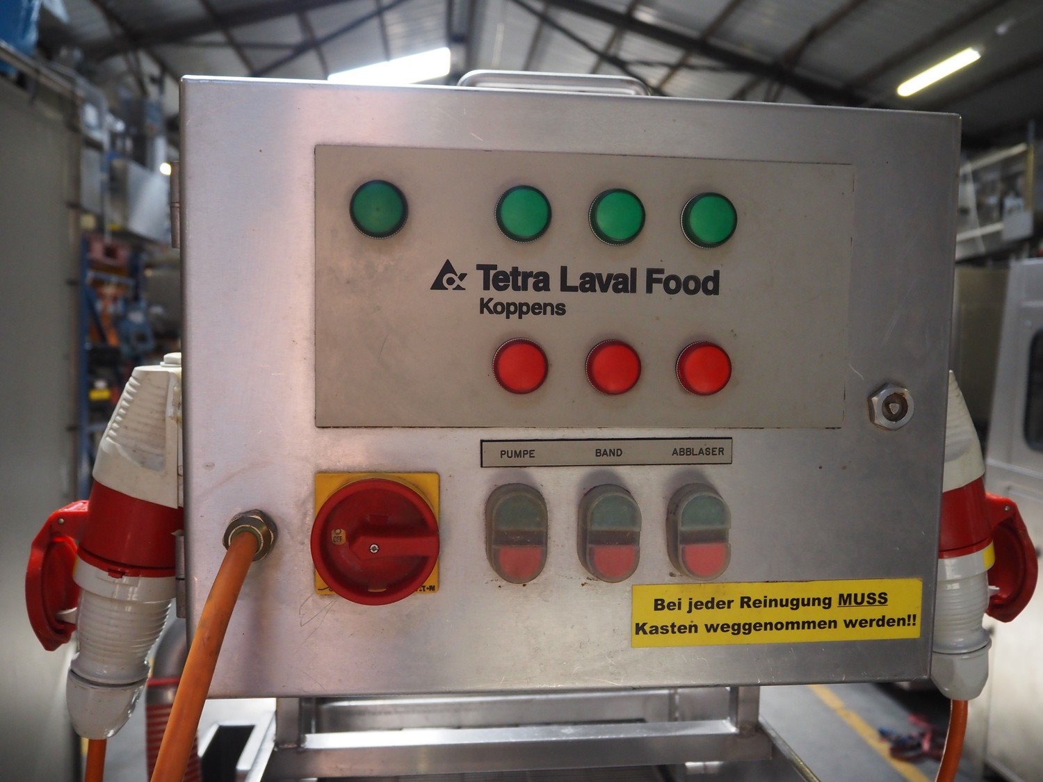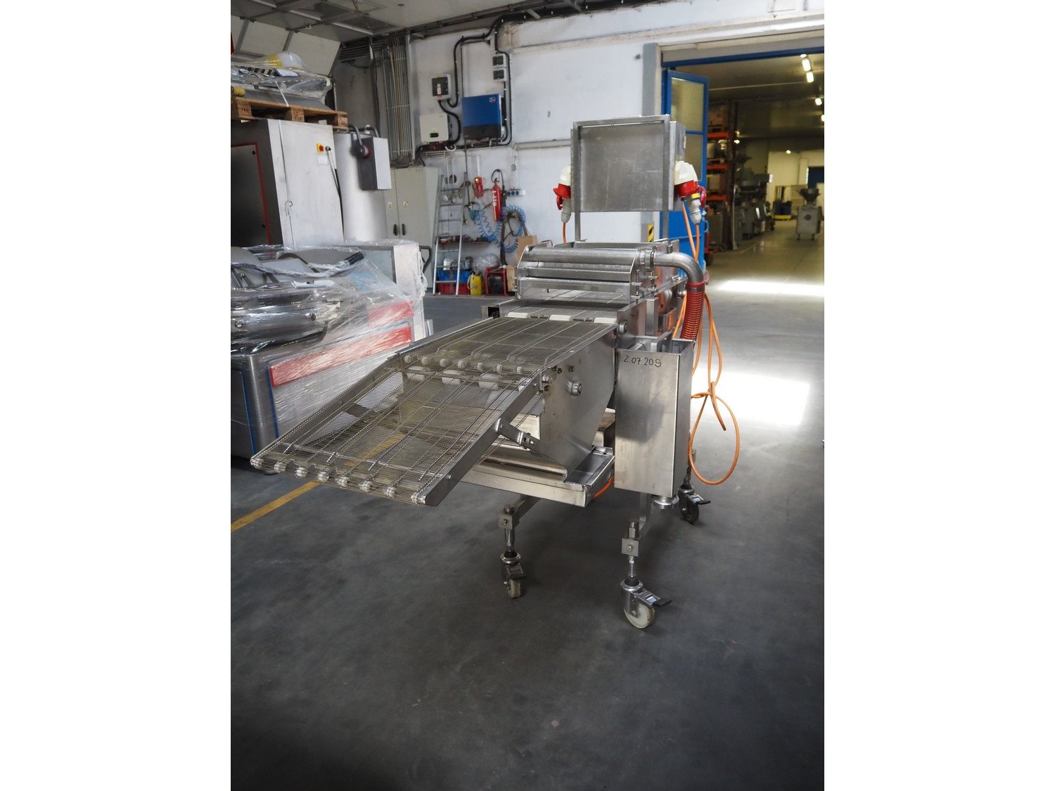 Koppens mobile coating machine, type: ER 400, serial number: 1266, 380 V, 3 Ph, 50 Hz, 2.38 A, 0.62 kW, weight: 165 kg, s/s mesh belt, belt width: 400 mm, total dimensions: 2450 mm x 720 mm x 1810 mm.