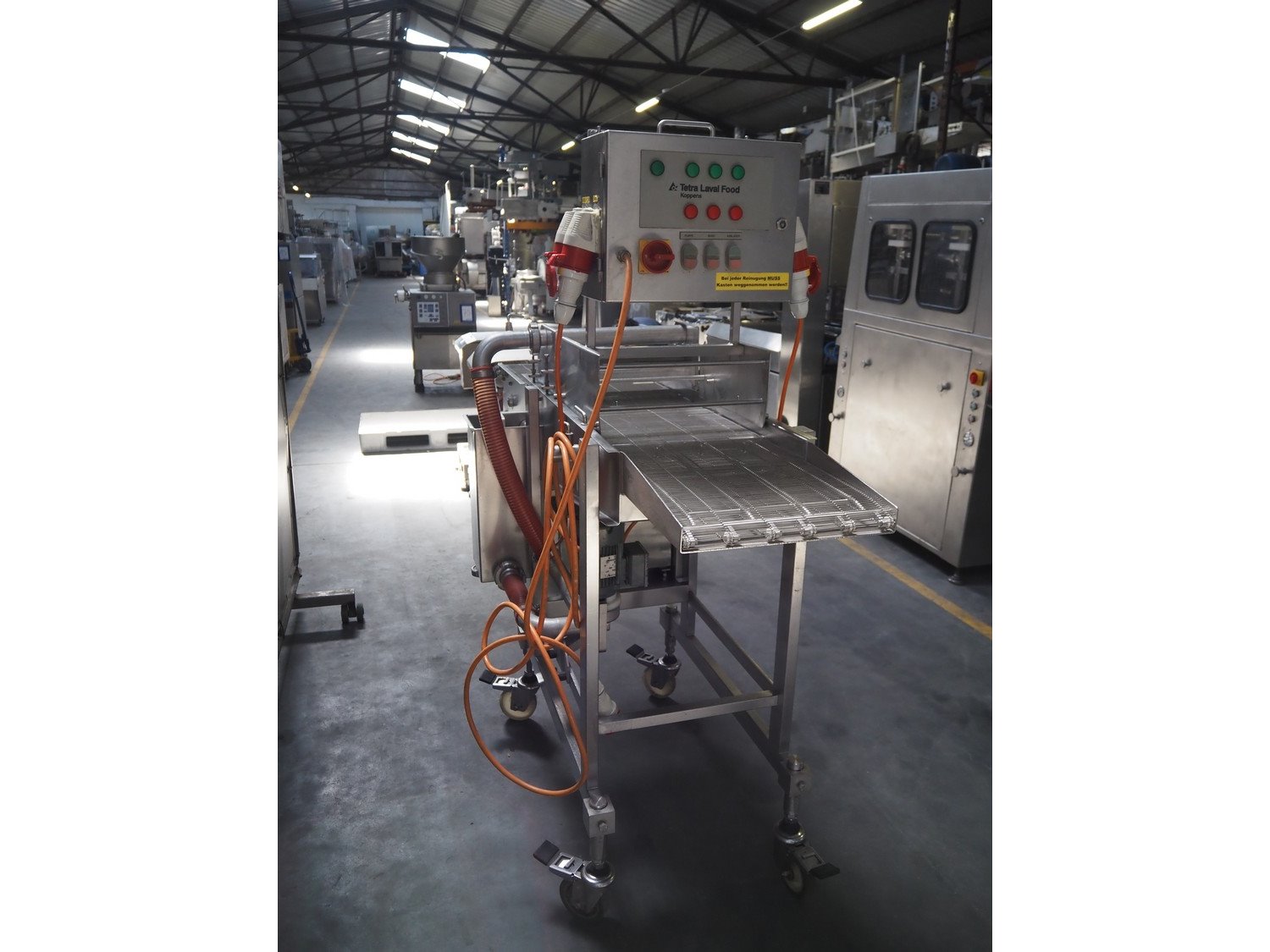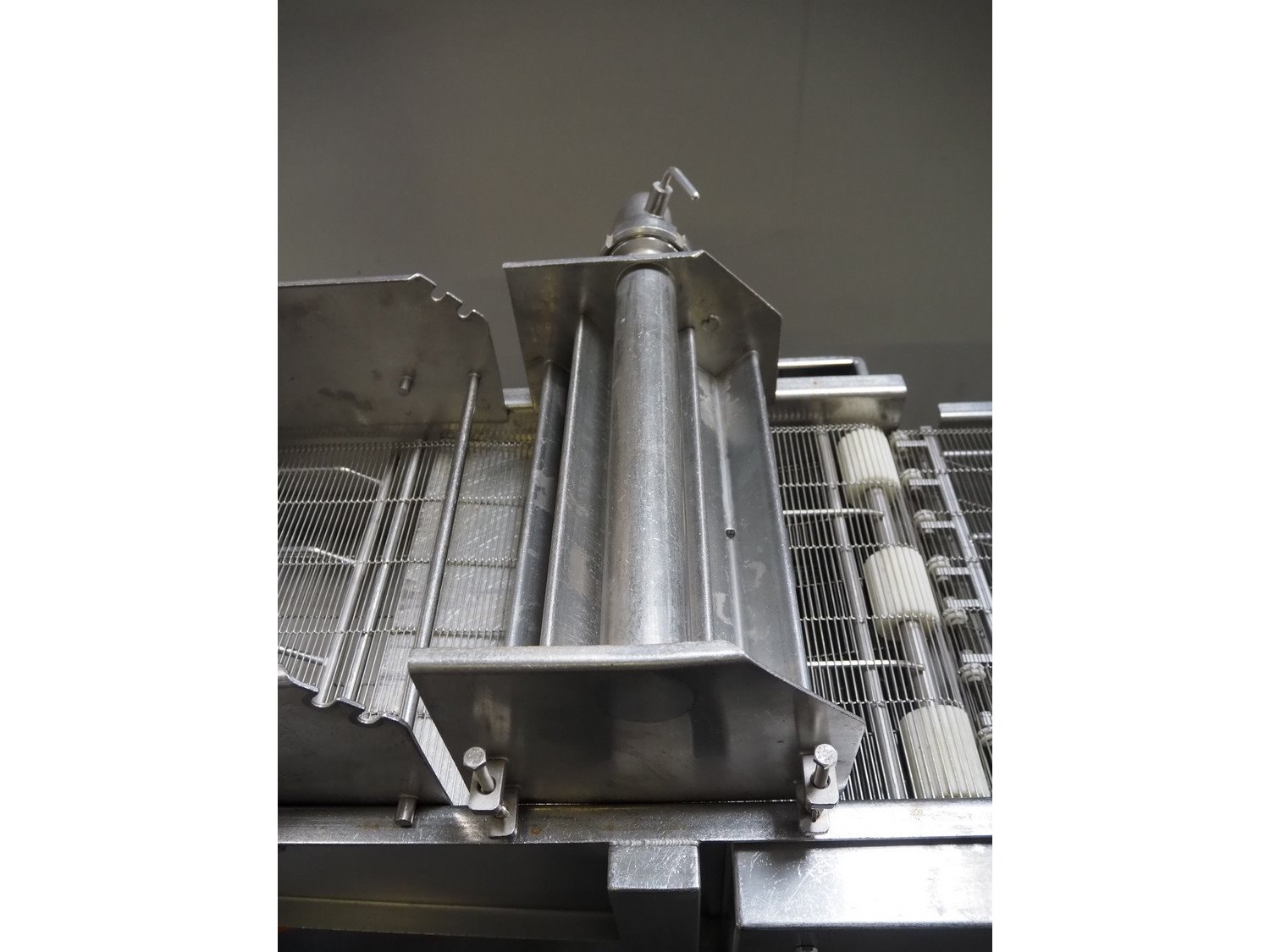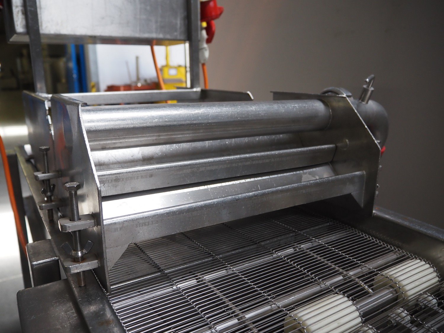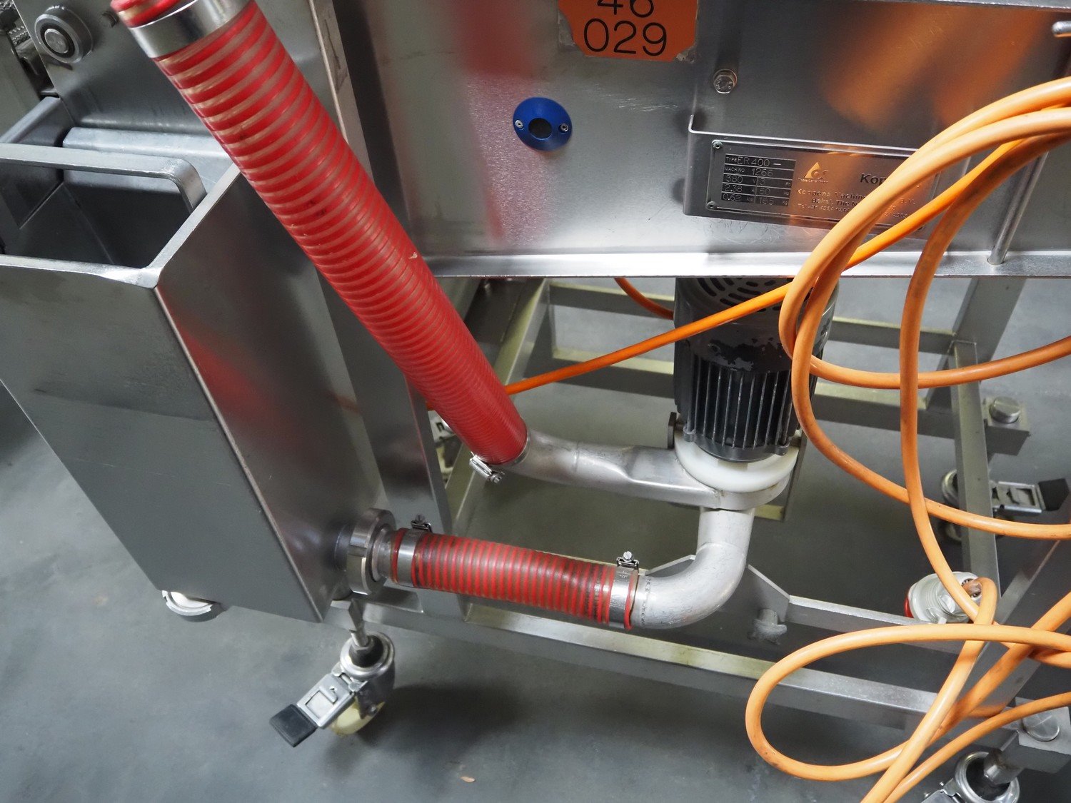 Koppens mobile coating machine, type: ER 400, serial number: 1266, 380 V, 3 Ph, 50 Hz, 2.38 A, 0.62 kW, weight: 165 kg, s/s mesh belt, belt width: 400 mm, total dimensions: 2450 mm x 720 mm x 1810 mm.