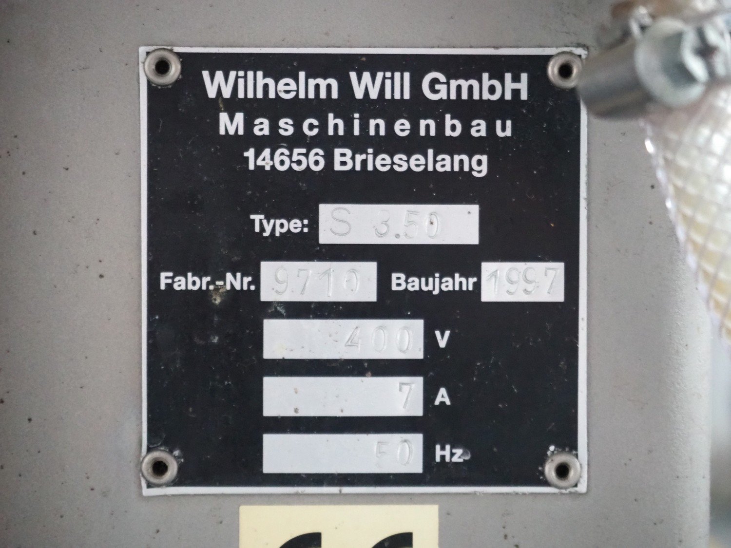 Wilhelm Will GmbH vertical form-, fill- and seal machine, type: S 3.50, fabrication number: 9710, year of construction: 1997, 400 V, 50 Hz, 7 A, vertical seal length: 340 mm, horizontal seal length: 230 mm, total dimensions: 1650 mm x 1200 mm x 2040 mm. Including box with parts.