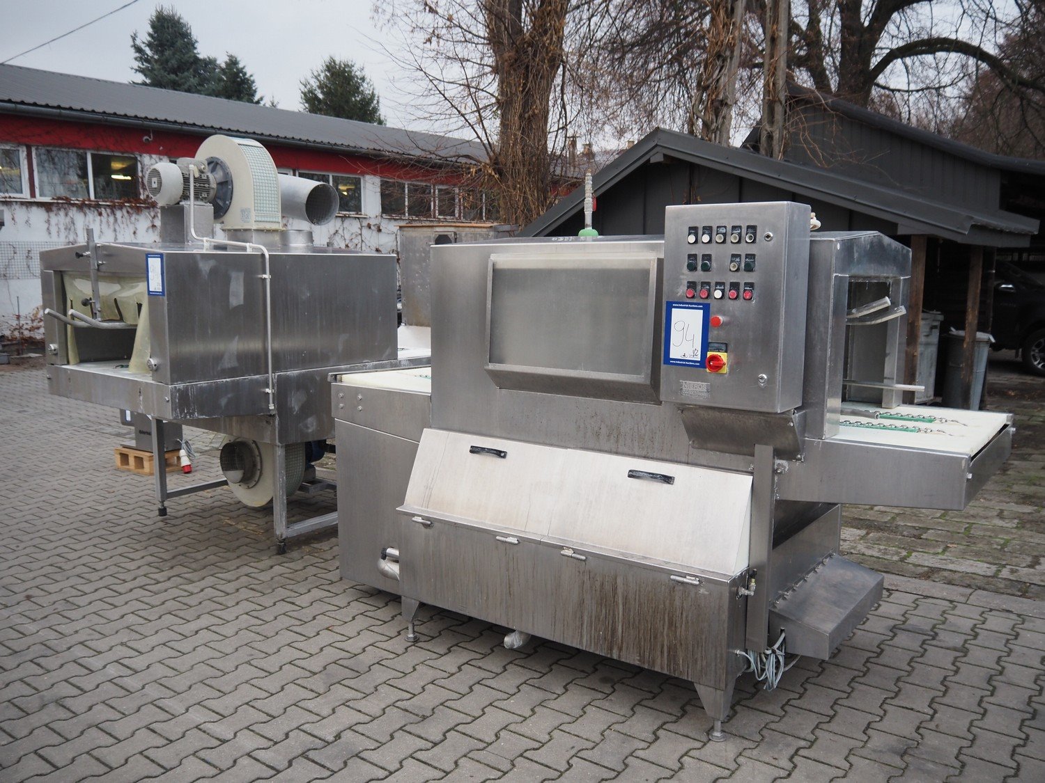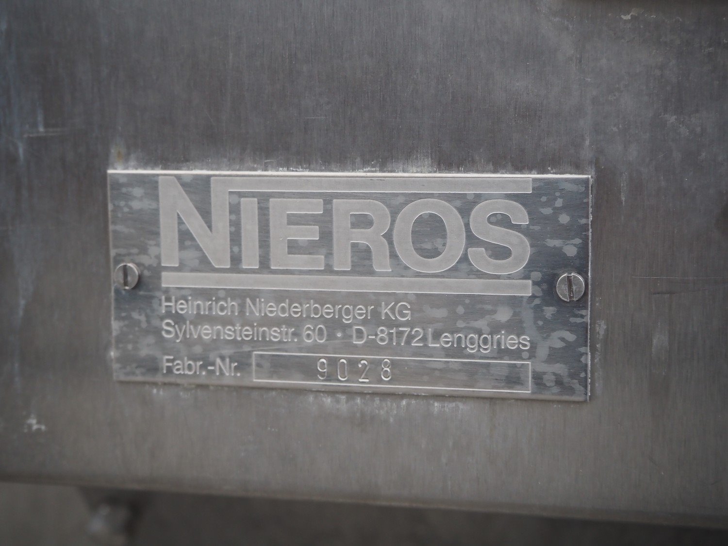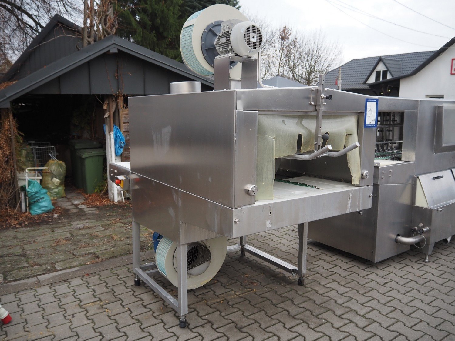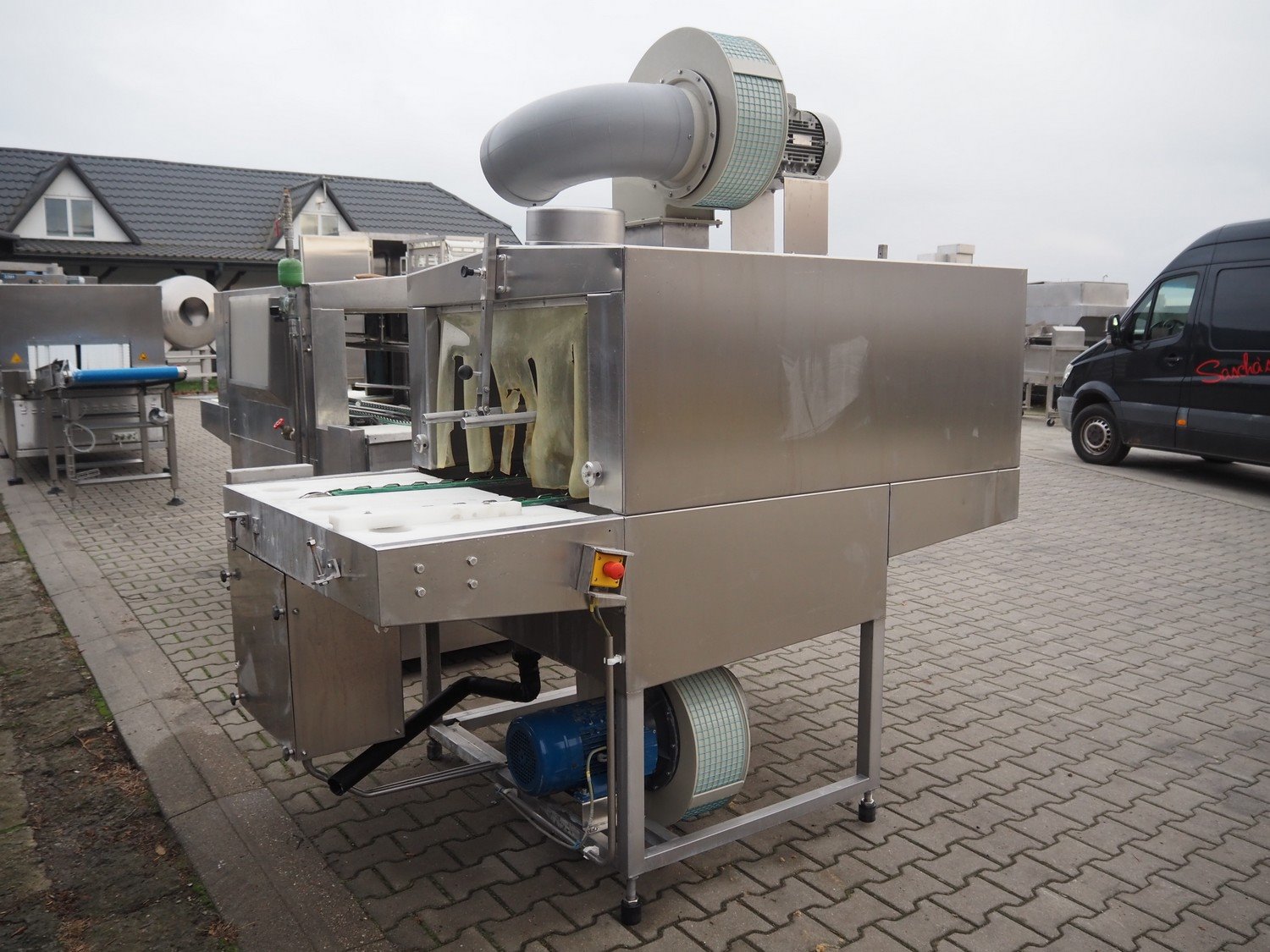 Nieros crate washer and dryer, number: 9028, clearance: 600 mm x 320 mm, total dimensions washer: 2650 mm x 1350 mm x 2000 mm, total dimension dryer: 2400 mm x 1300 mm x 2400 mm. Including in and outfeed belts, plastic rollers, roller width: 640 mm, total dimensions: 2000 mm x 750 mm x 700 mm and 3000 mm x 1700 mm.