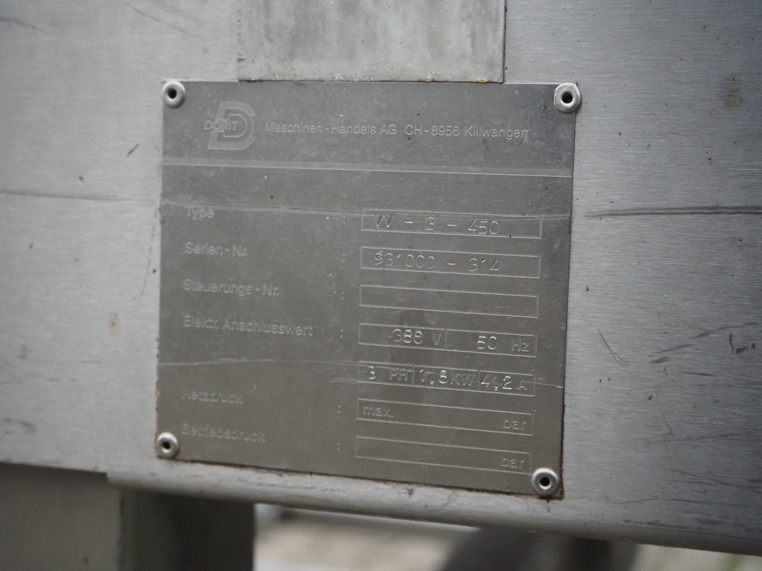 Dorit tumbler, type: VV-3-450, serial number: 931000-314, 380 V, 50 Hz, 3 Ph, 4.1 A, 1.8 kW, dimensions: 1650 mm x 1500 mm x 2050 mm.