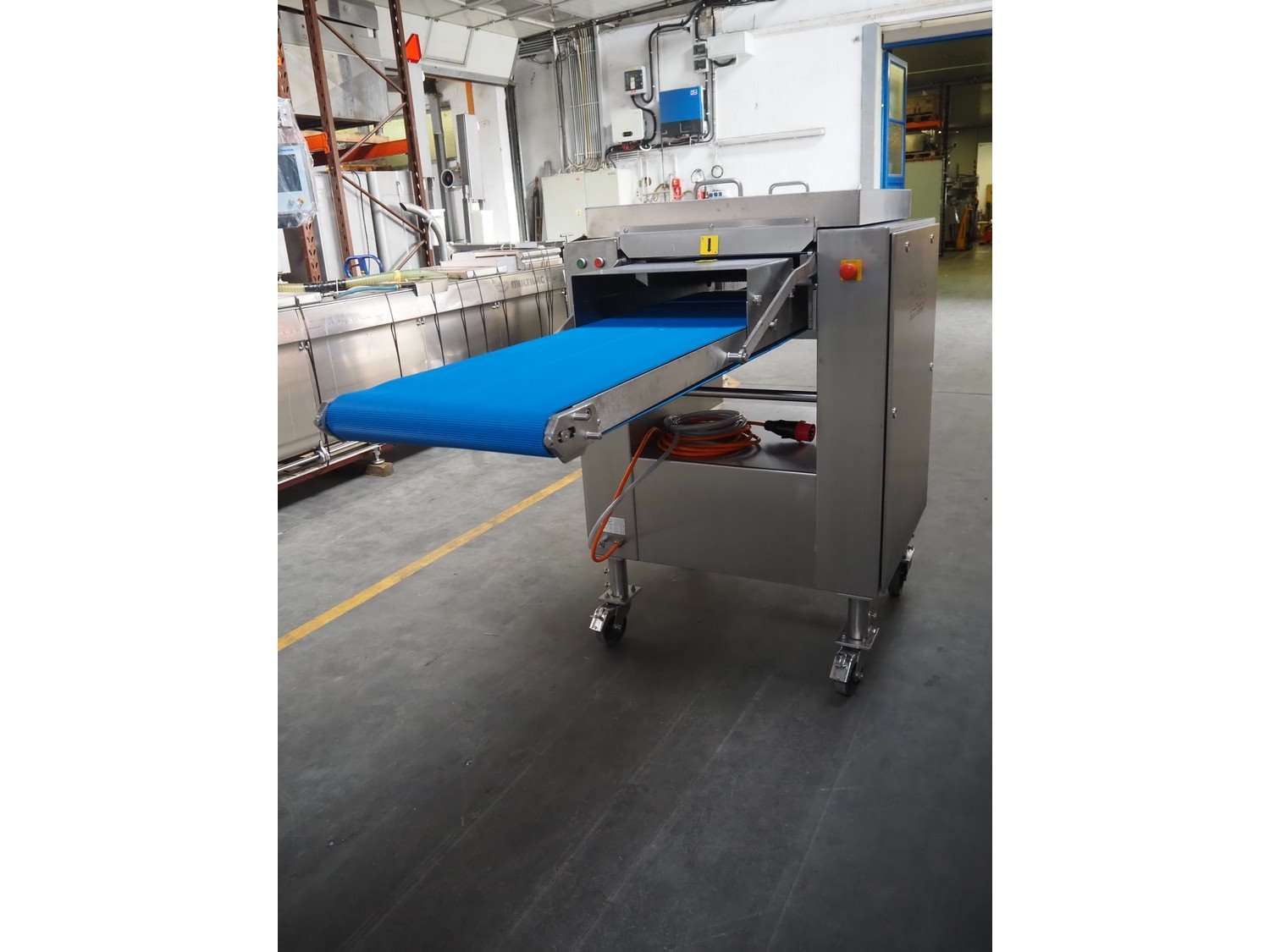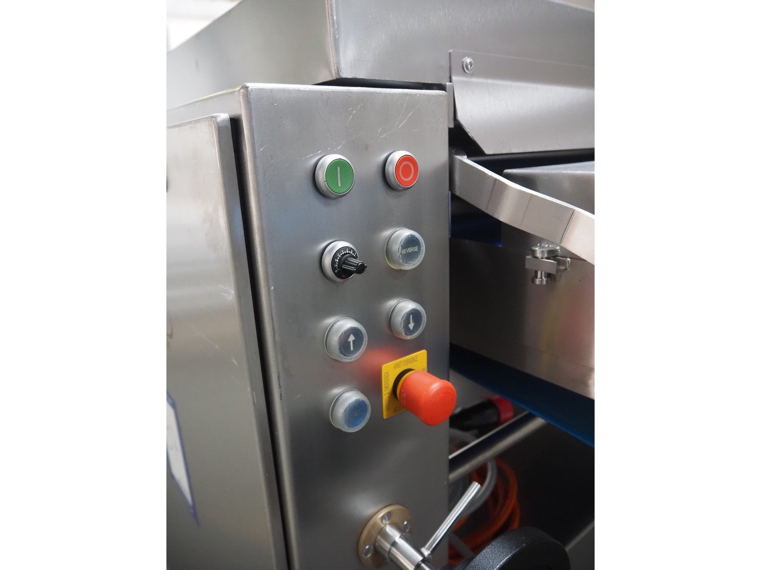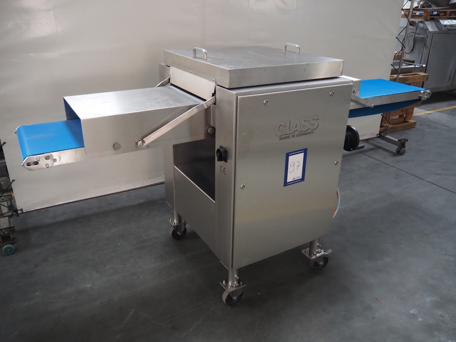 Glass mobile tenderizer, type: GSS-400, number: 4464, year of construction: 2023, 400 V, 3 Ph, 50 Hz, 5.2 A, 2.3 kW, weight: 400 kg, plastic belt, belt width: 440 mm, working width: 420 mm, total dimensions: 2750 mm x 960 mm x 1440 mm.