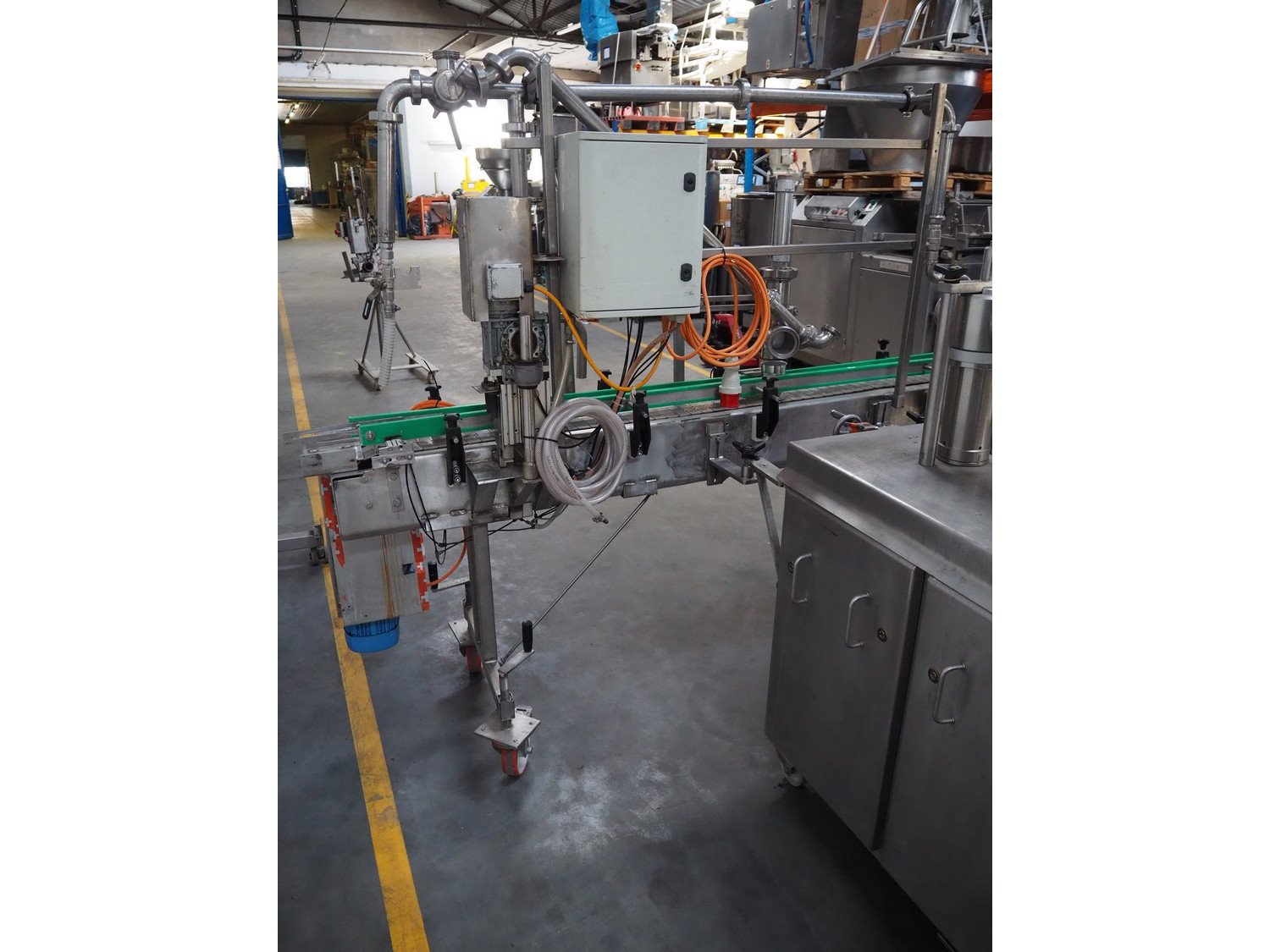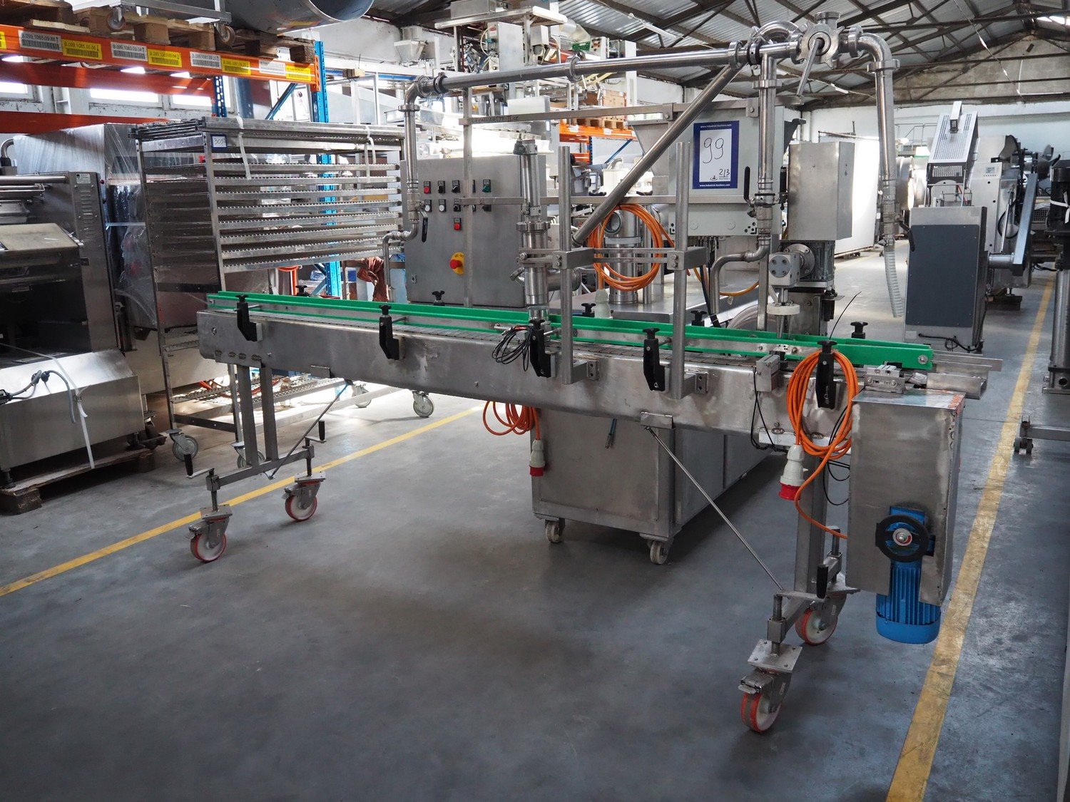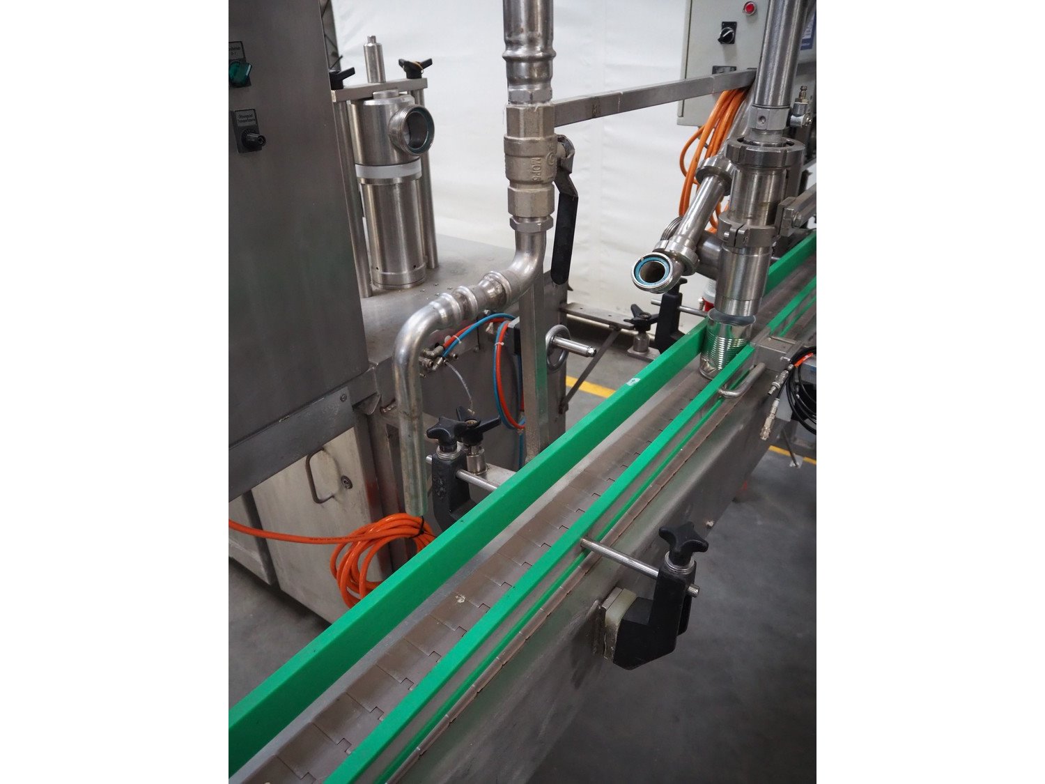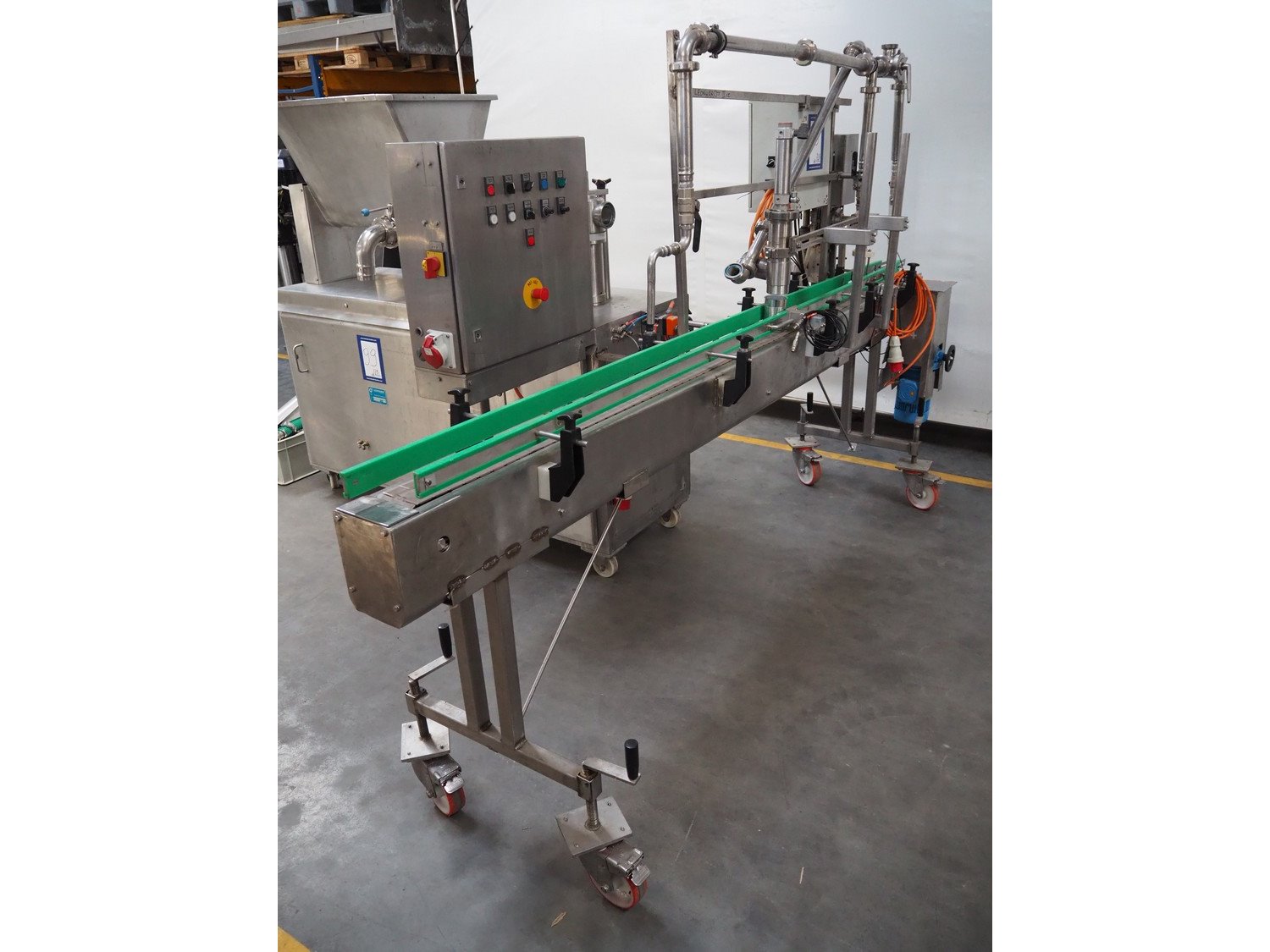 Leonhardt mobile filling station for cans, type: AG 1 DPZ0/S, number: 0140/1022, year of construction: 2002, total dimensions filling machine: 2100 mm x 1300 mm x 1770 mm. With mobile belt, plastic belt, belt width: 100 mm, filling head: Ø 70 mm, total dimensions belt: 3100 mm x 650 mm x 1900 mm.