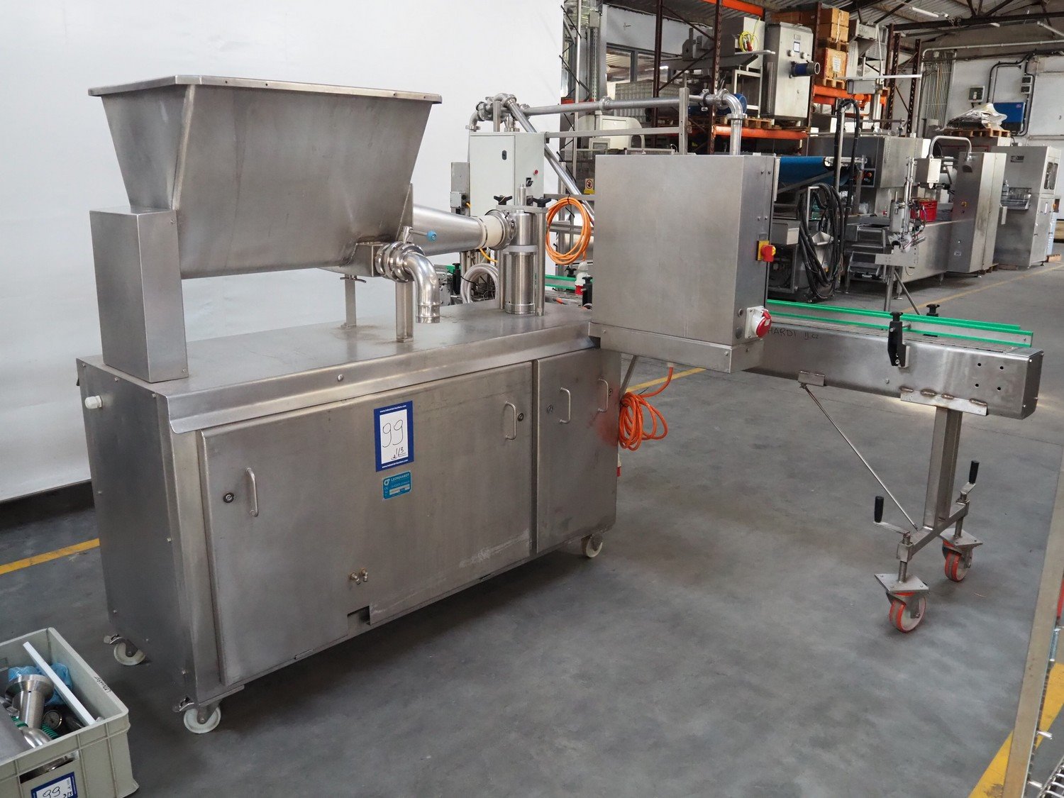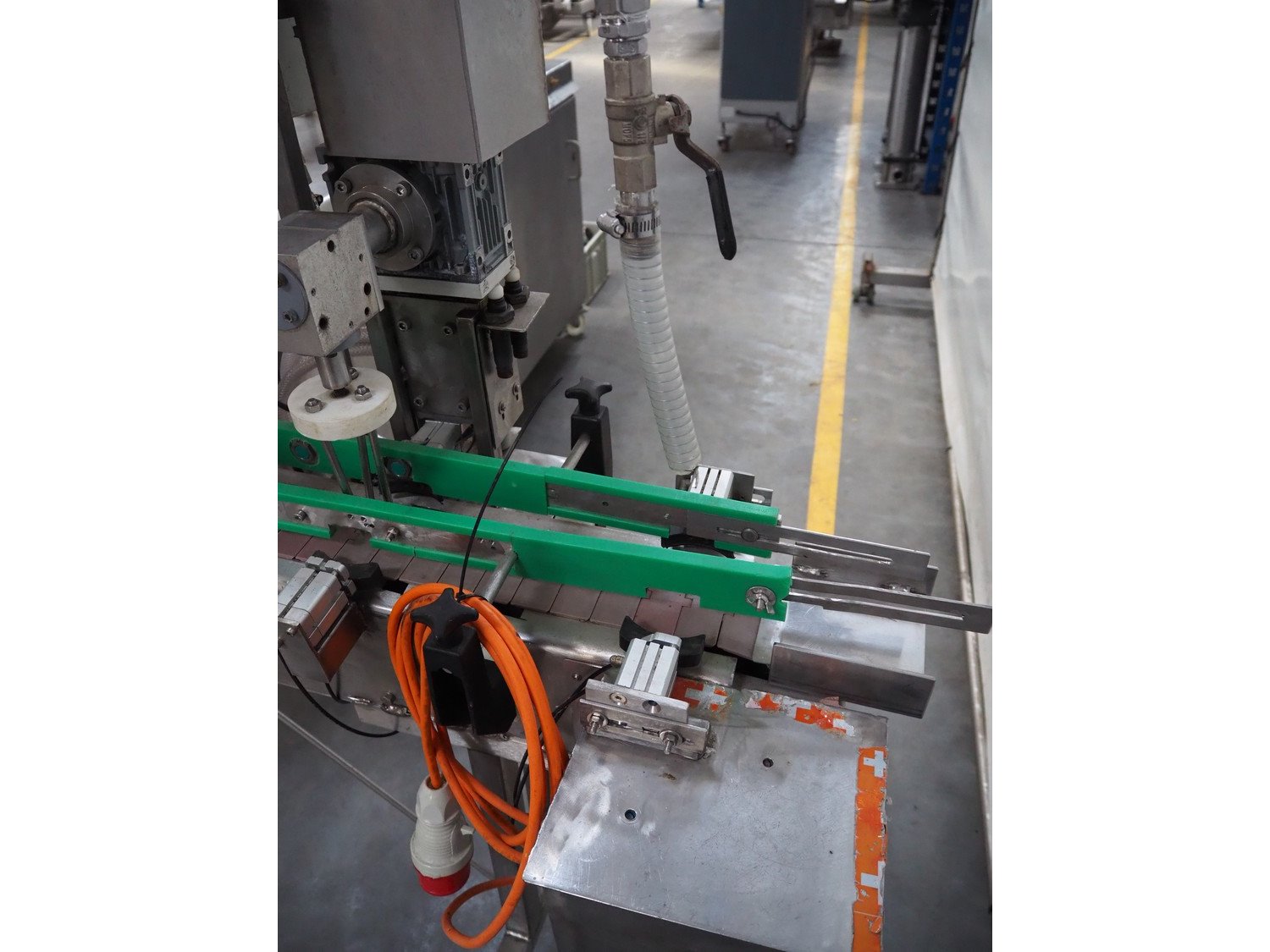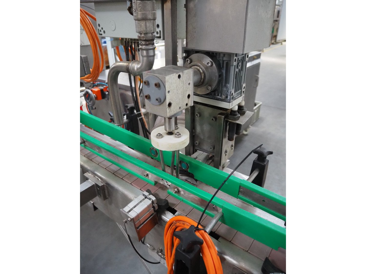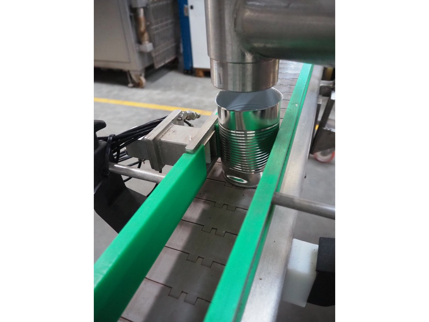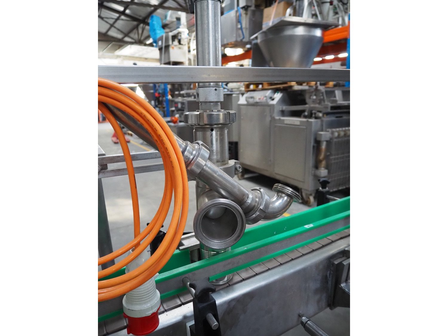 Leonhardt mobile filling station for cans, type: AG 1 DPZ0/S, number: 0140/1022, year of construction: 2002, total dimensions filling machine: 2100 mm x 1300 mm x 1770 mm. With mobile belt, plastic belt, belt width: 100 mm, filling head: Ø 70 mm, total dimensions belt: 3100 mm x 650 mm x 1900 mm.