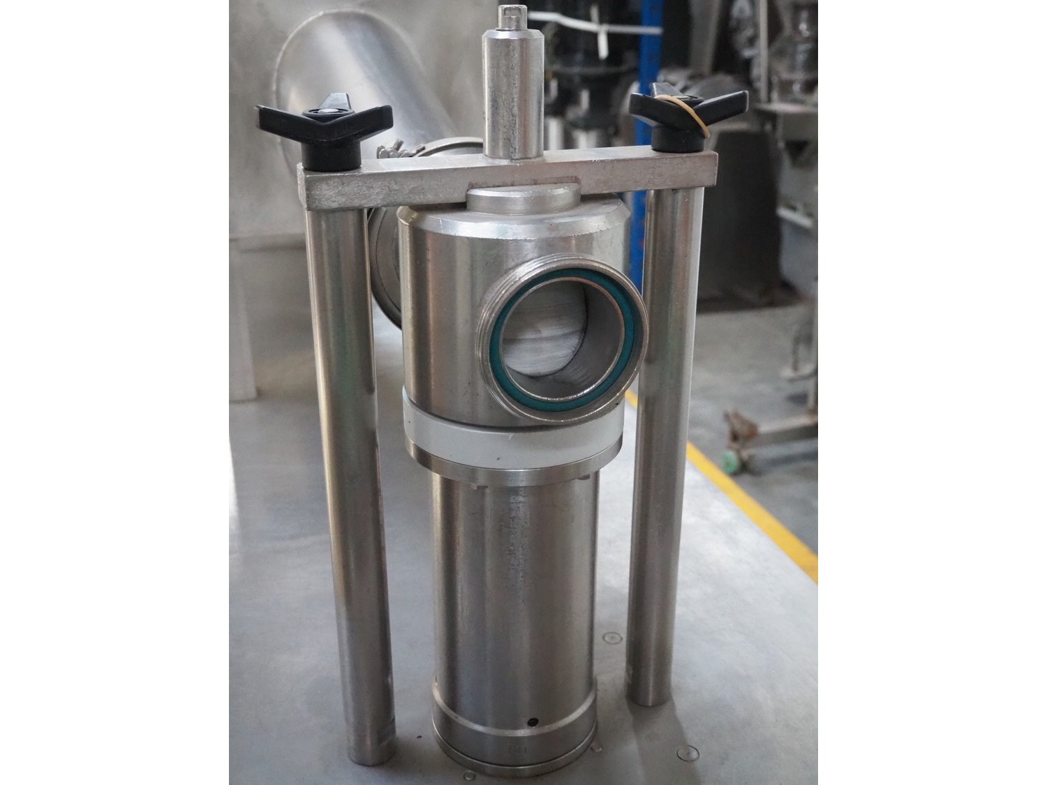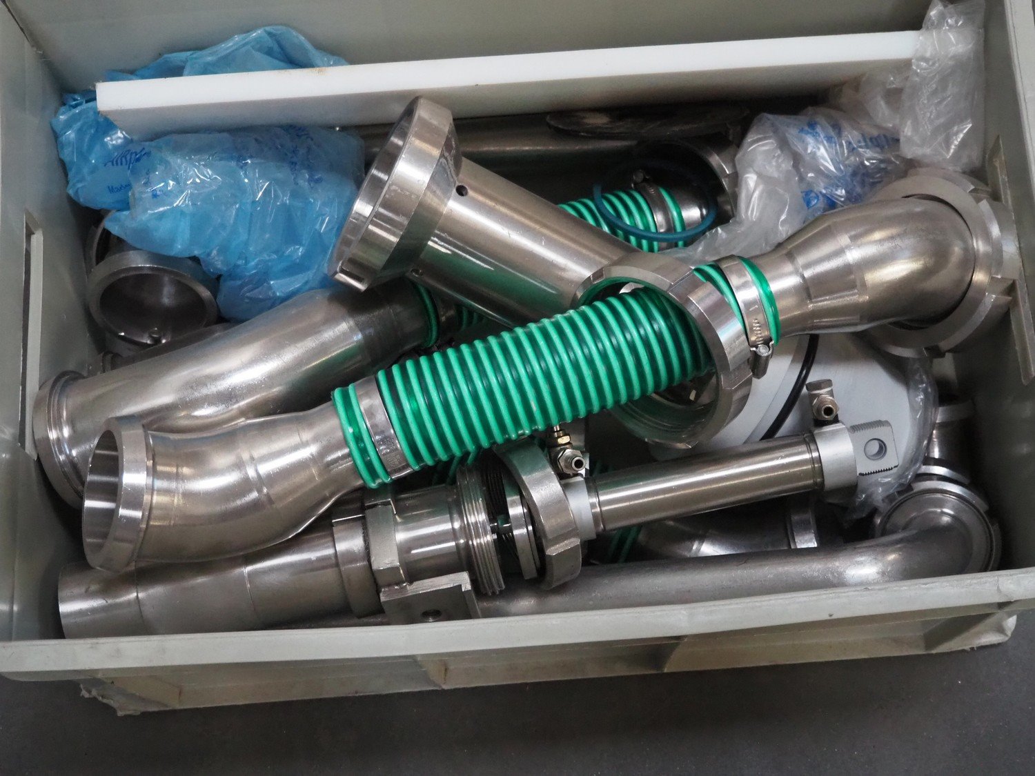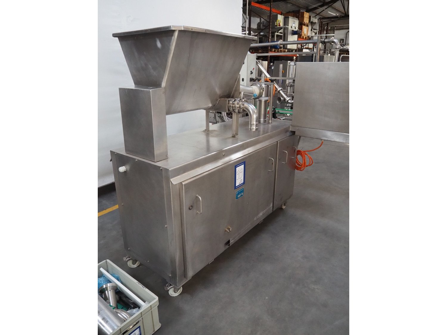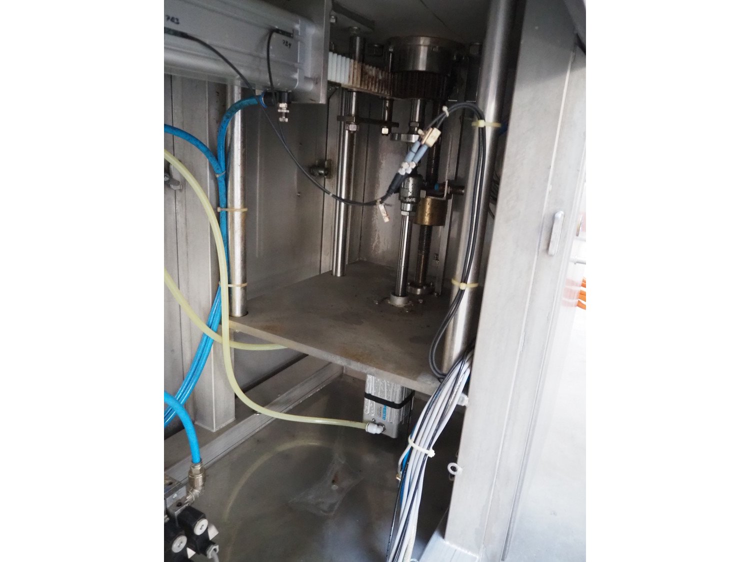 Leonhardt mobile filling station for cans, type: AG 1 DPZ0/S, number: 0140/1022, year of construction: 2002, total dimensions filling machine: 2100 mm x 1300 mm x 1770 mm. With mobile belt, plastic belt, belt width: 100 mm, filling head: Ø 70 mm, total dimensions belt: 3100 mm x 650 mm x 1900 mm.