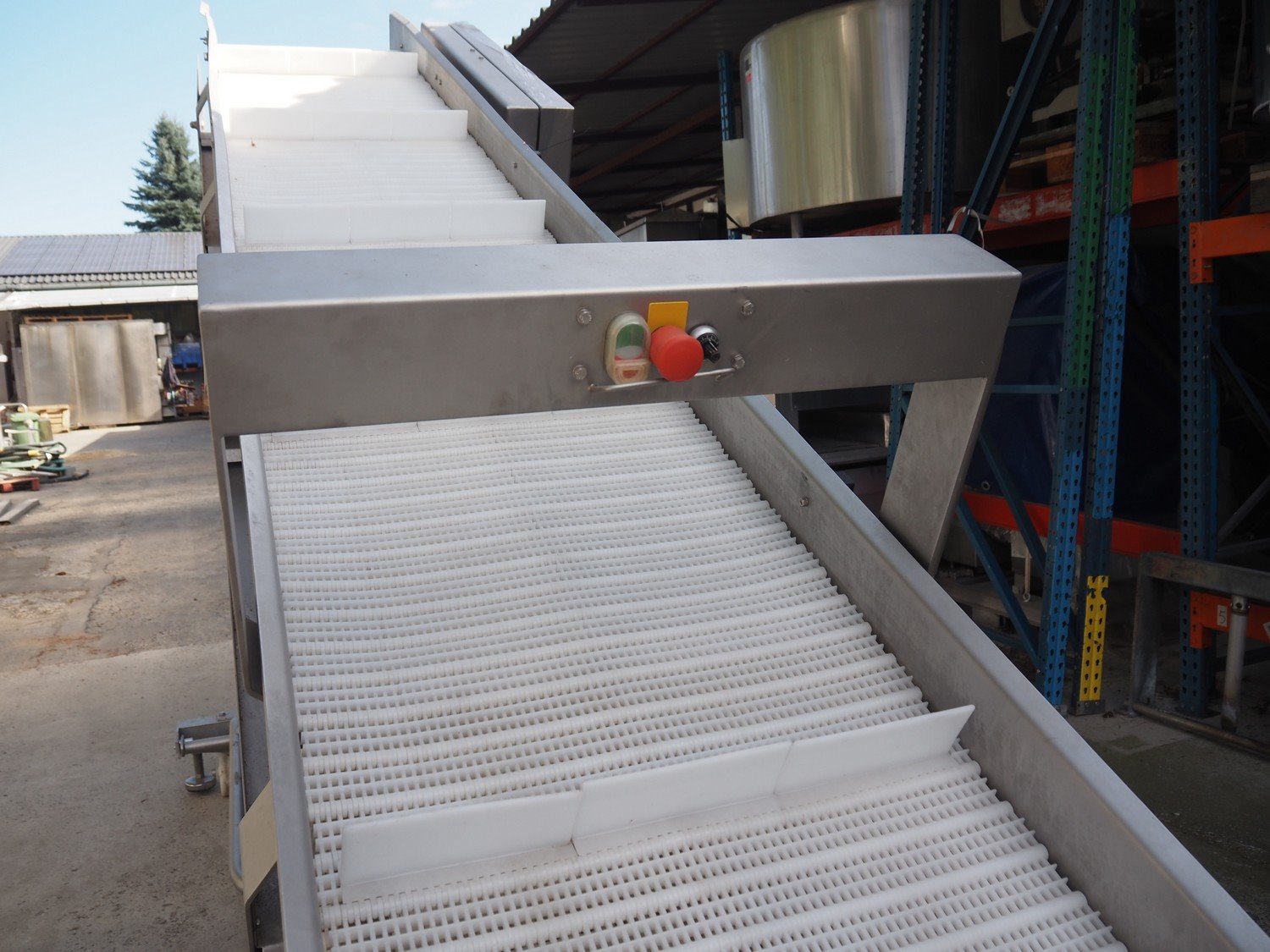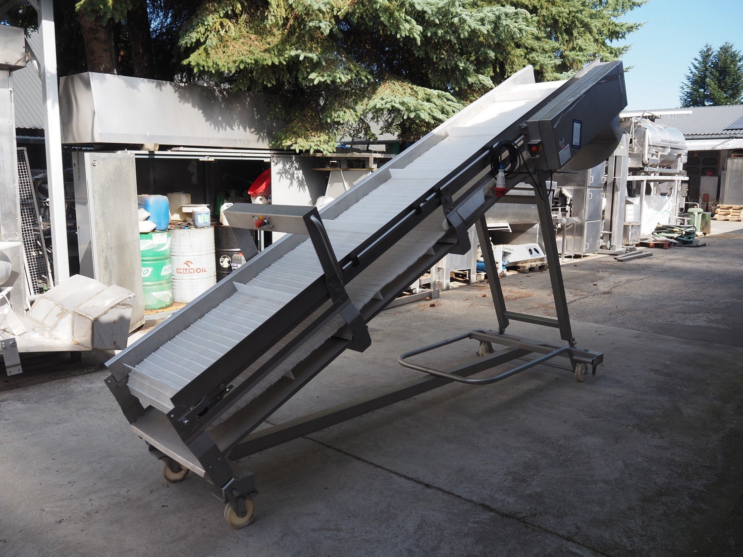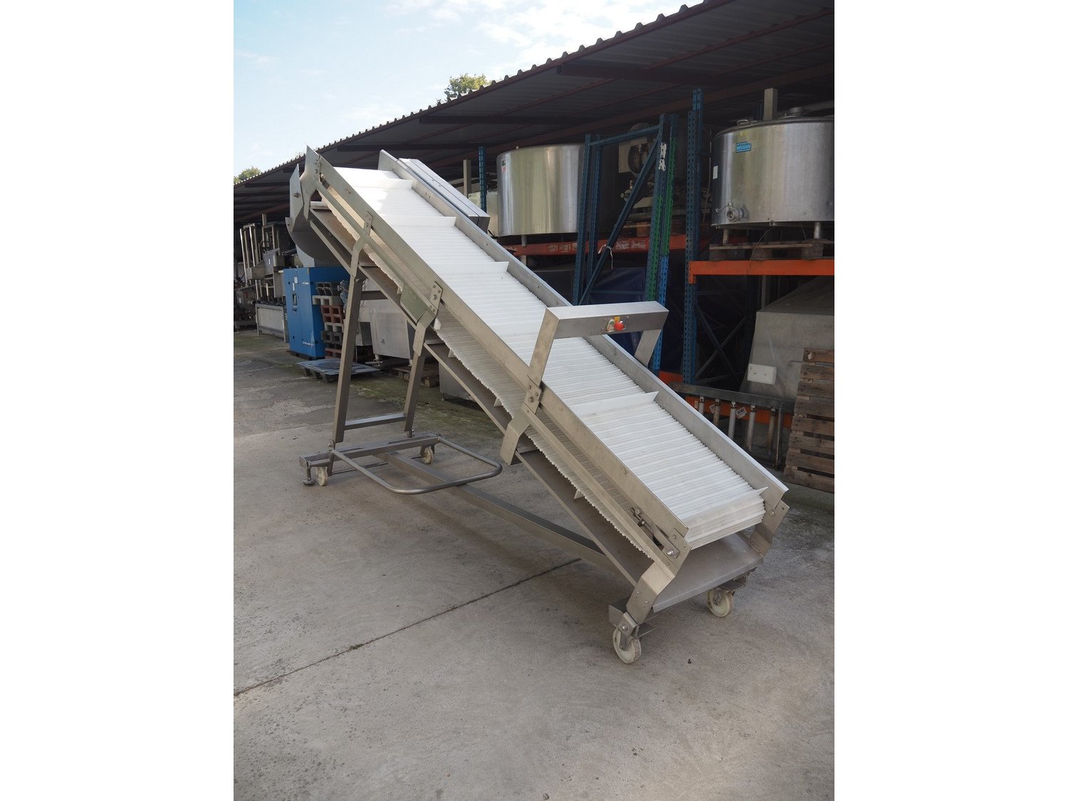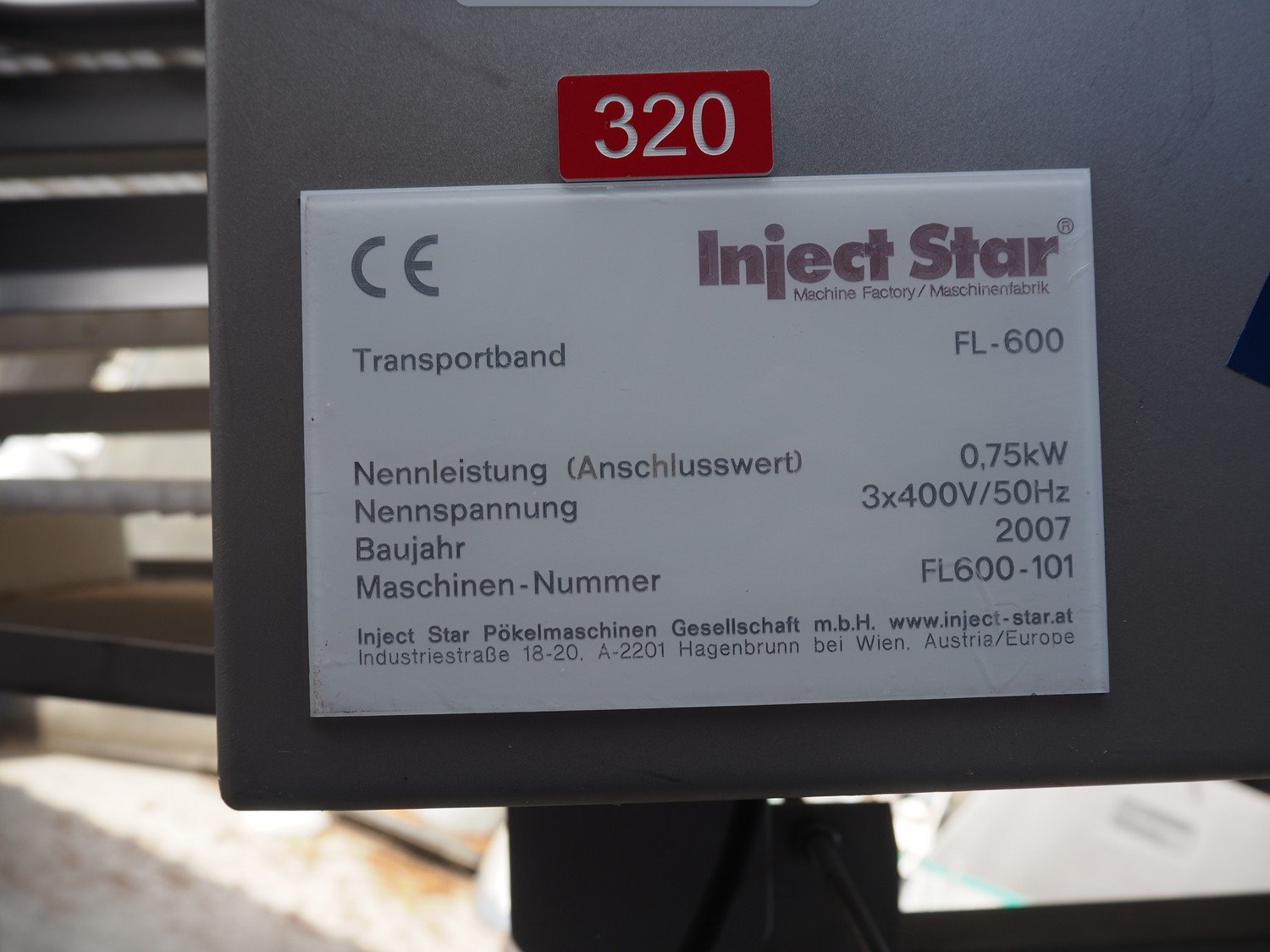 Inject Star mobile elevating belt, type: FL-600, number: FL600-101, year of construction: 2007, 400 V, 3 Ph, 50 Hz, 0.75 kW, plastic mesh belt, belt width: 610 mm, distance between dividers: 705 mm, divider height: 750 mm, elevating height: 2500 mm, total dimensions: 3600 mm x 1220 mm x 2650 mm.