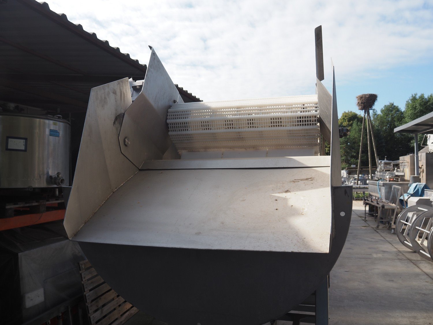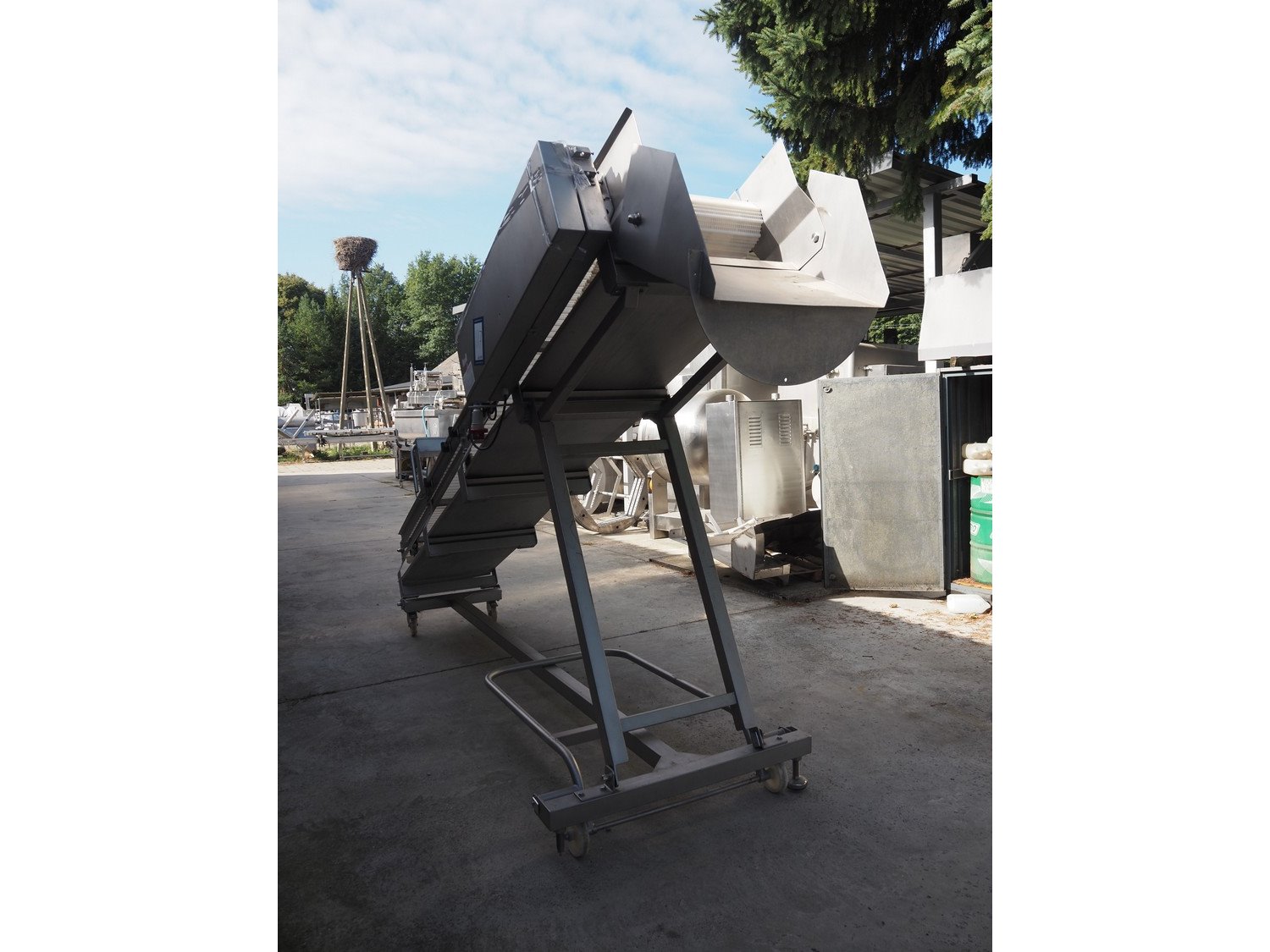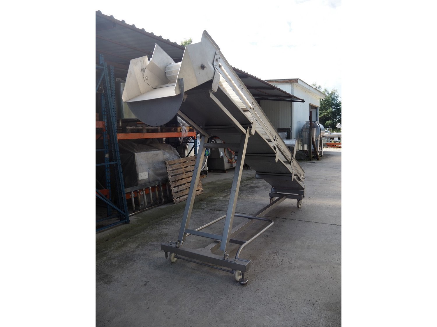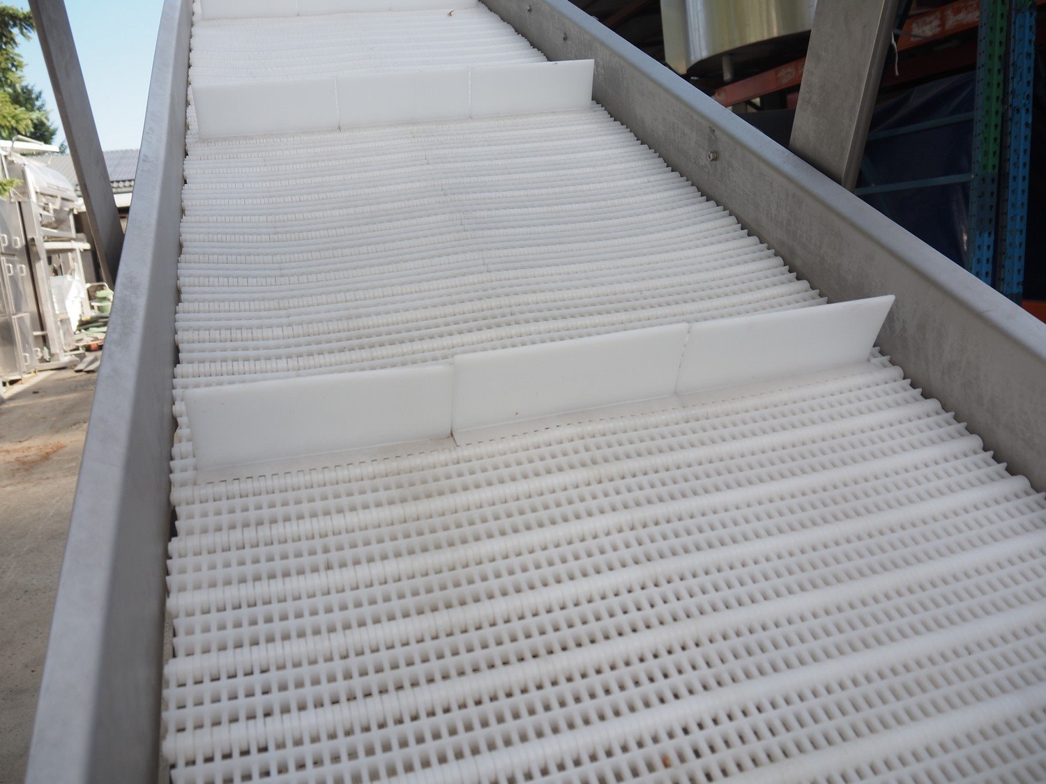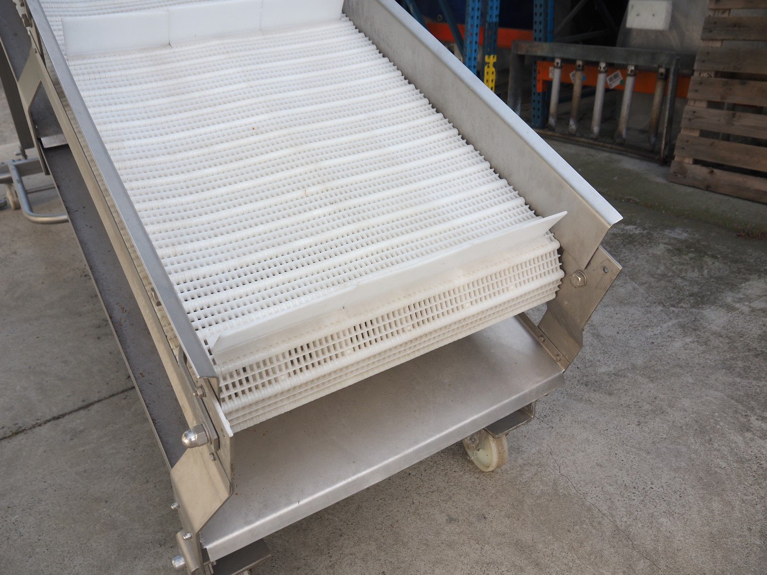 Inject Star mobile elevating belt, type: FL-600, number: FL600-101, year of construction: 2007, 400 V, 3 Ph, 50 Hz, 0.75 kW, plastic mesh belt, belt width: 610 mm, distance between dividers: 705 mm, divider height: 750 mm, elevating height: 2500 mm, total dimensions: 3600 mm x 1220 mm x 2650 mm.