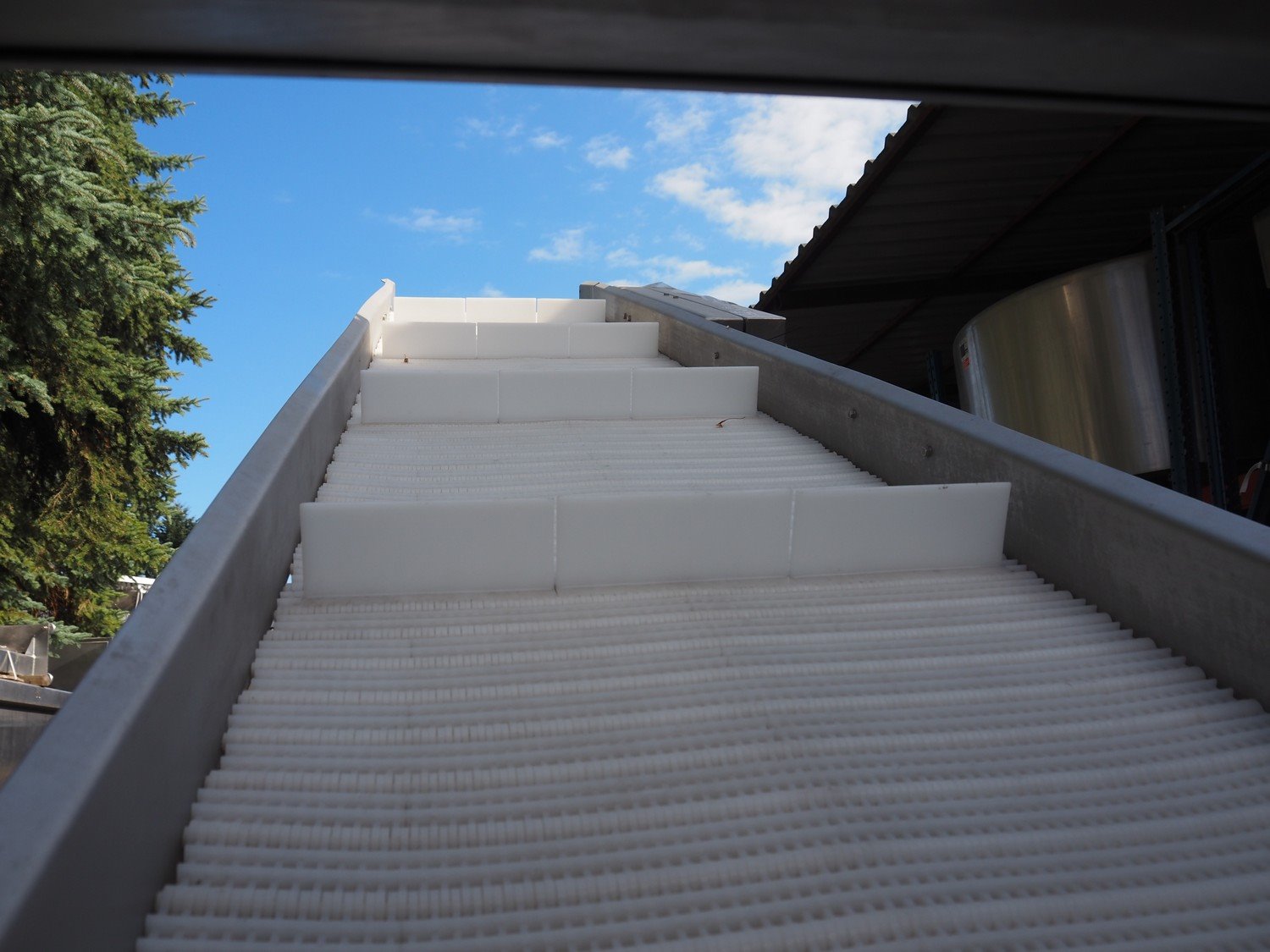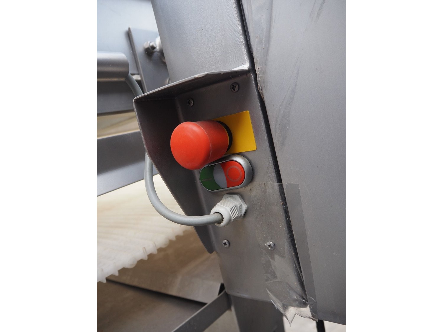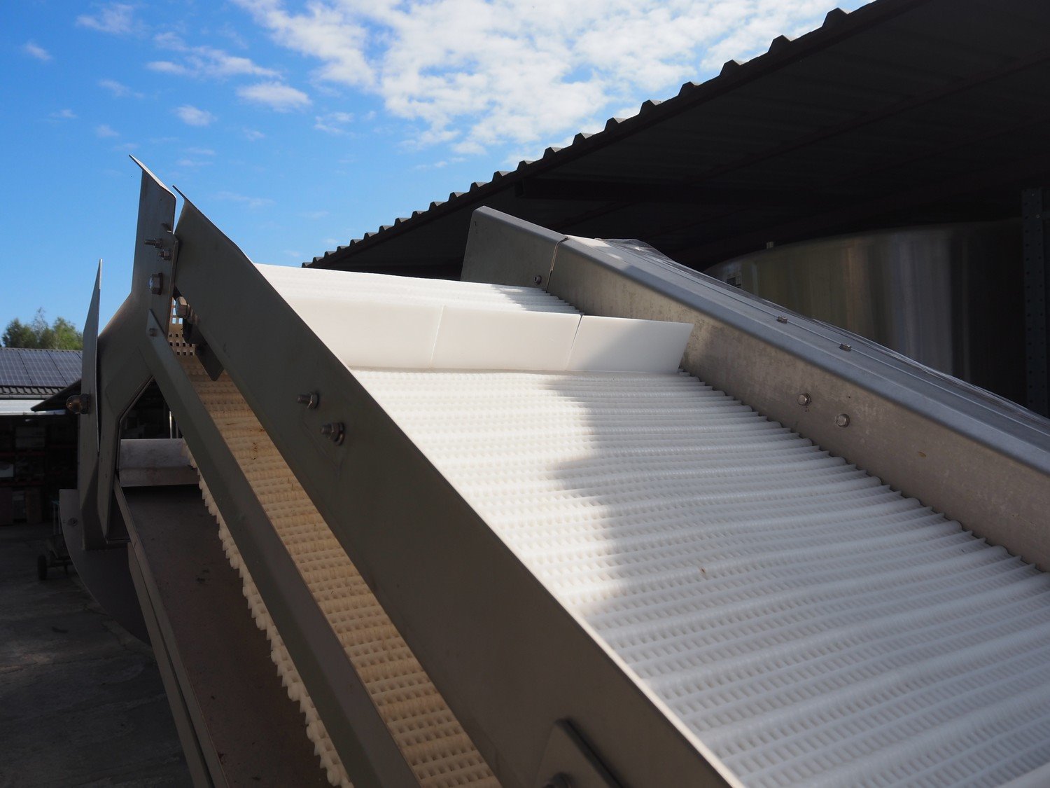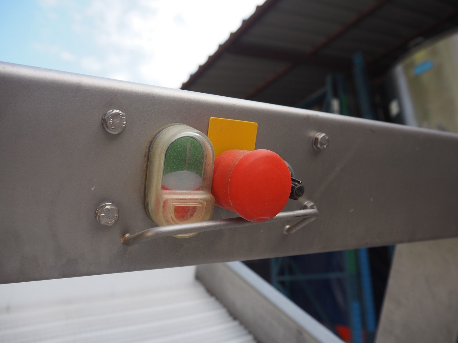 Inject Star mobile elevating belt, type: FL-600, number: FL600-101, year of construction: 2007, 400 V, 3 Ph, 50 Hz, 0.75 kW, plastic mesh belt, belt width: 610 mm, distance between dividers: 705 mm, divider height: 750 mm, elevating height: 2500 mm, total dimensions: 3600 mm x 1220 mm x 2650 mm.