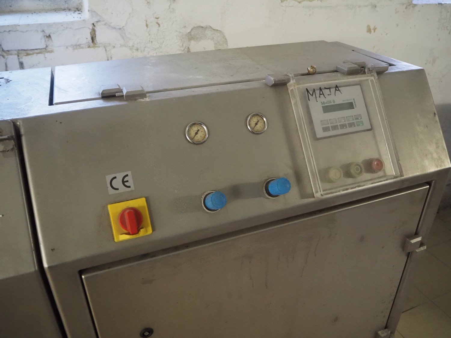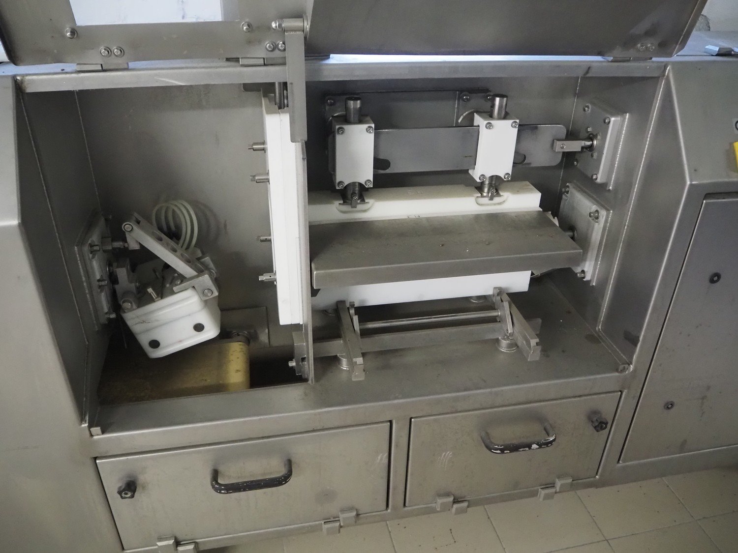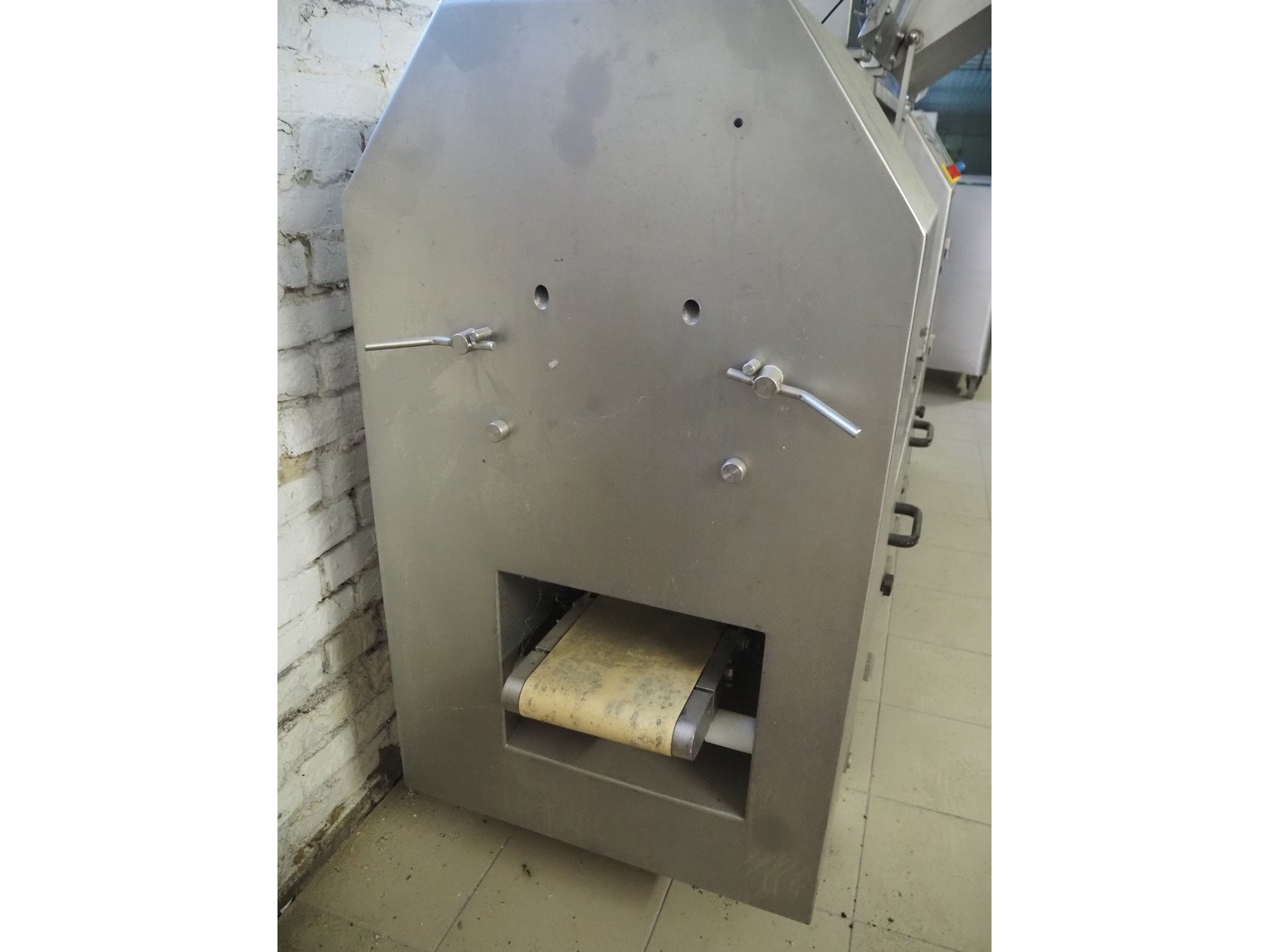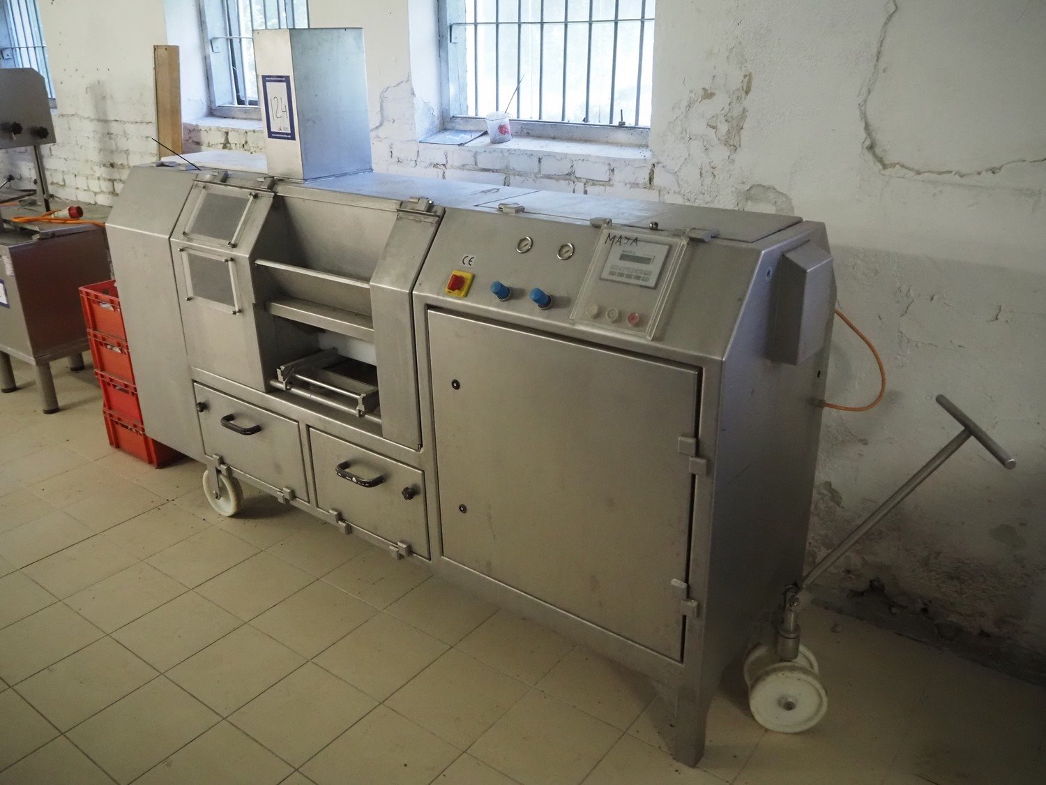 Maja mobile portioning machine, type: FPS 40, serial number: 40927, year of construction: 1999, 400 V, 50 Hz, 3 Ph, 630 kg, capacity: 40-60 pieces per minute, weight range: 11-700 g, plastic belt, belt width: 200 mm, Busch vacuum pump, type: RC 0025 E 501, number: 03013682, capacity: 25 m³ per hour, total dimensions: 2870 mm x 720 mm x 1170 mm. Including crates with extra parts.