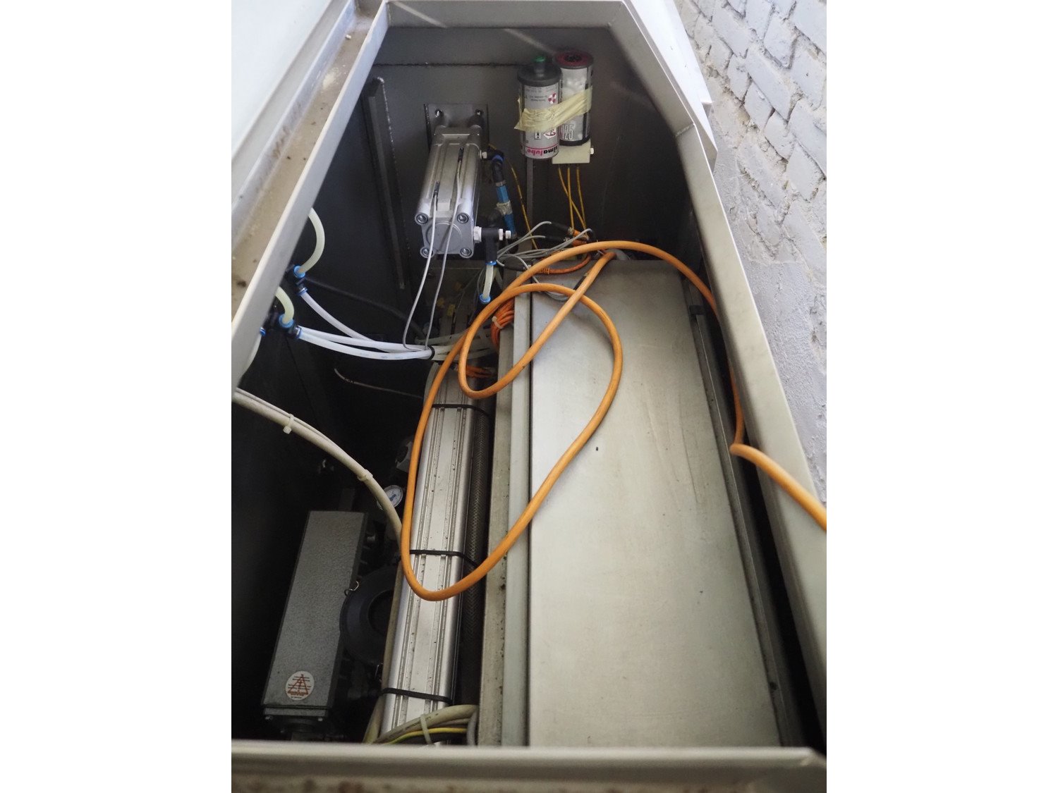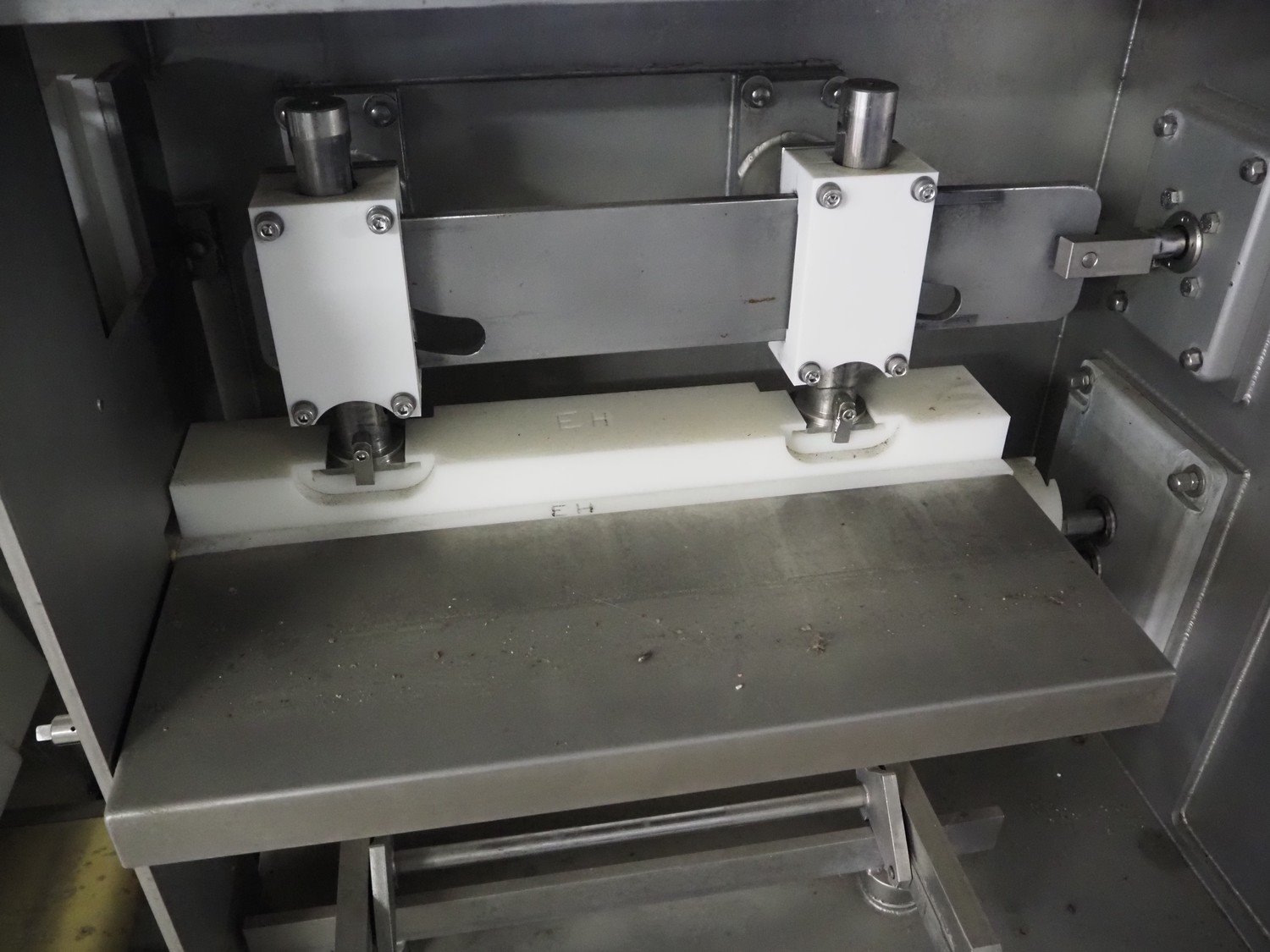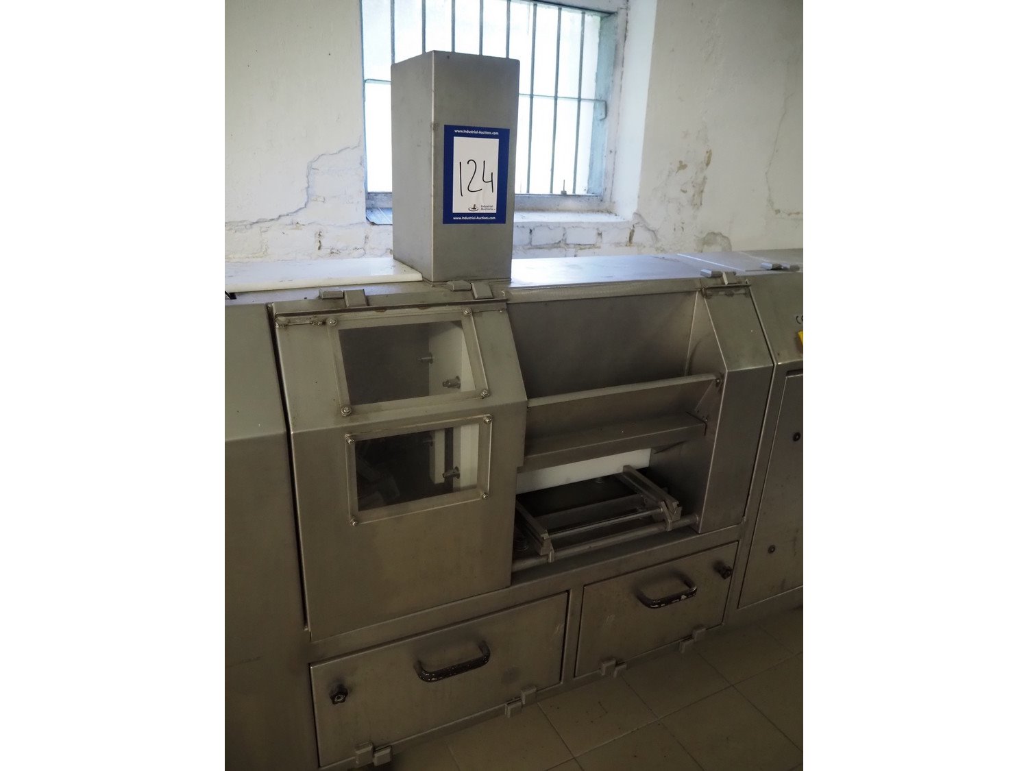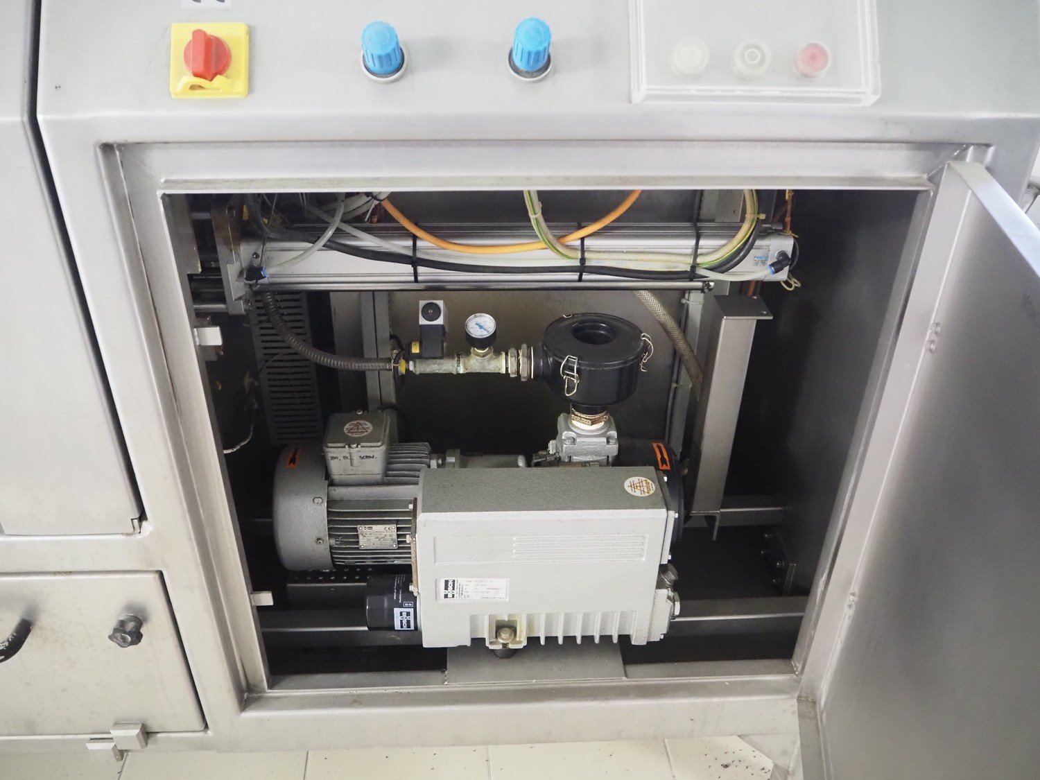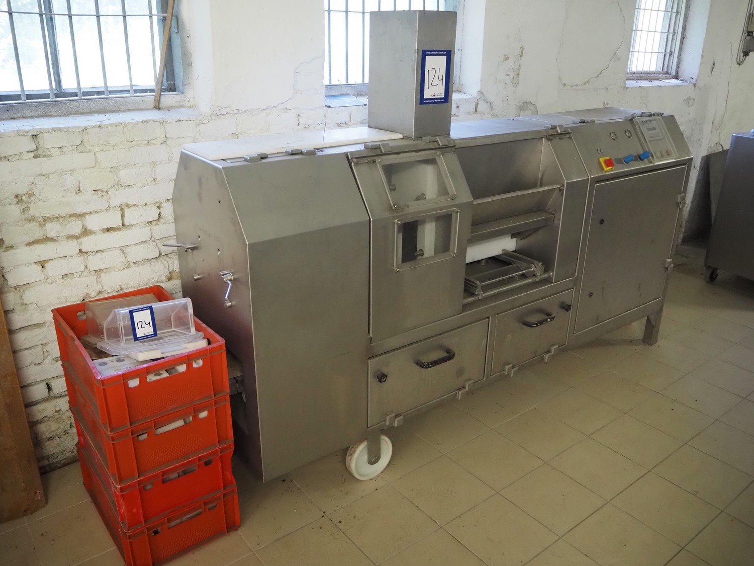 Maja mobile portioning machine, type: FPS 40, serial number: 40927, year of construction: 1999, 400 V, 50 Hz, 3 Ph, 630 kg, capacity: 40-60 pieces per minute, weight range: 11-700 g, plastic belt, belt width: 200 mm, Busch vacuum pump, type: RC 0025 E 501, number: 03013682, capacity: 25 m³ per hour, total dimensions: 2870 mm x 720 mm x 1170 mm. Including crates with extra parts.