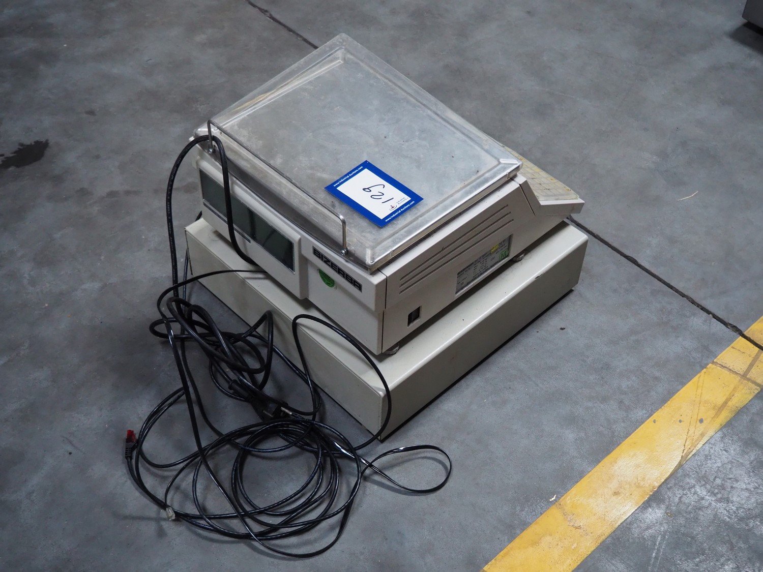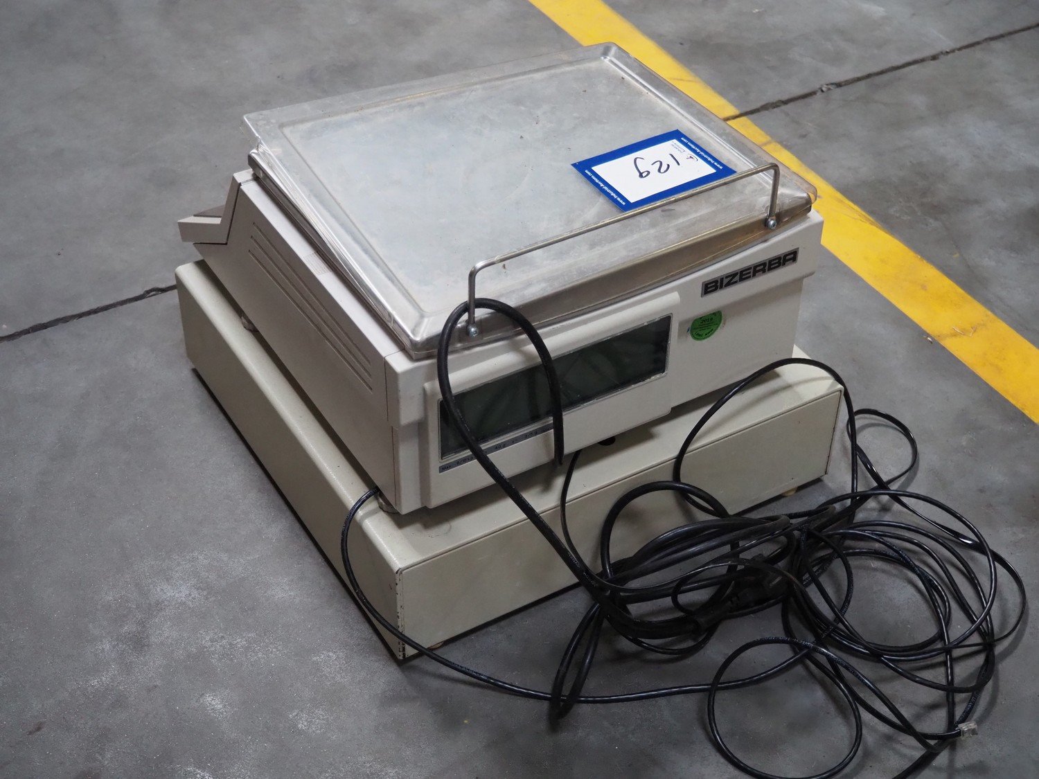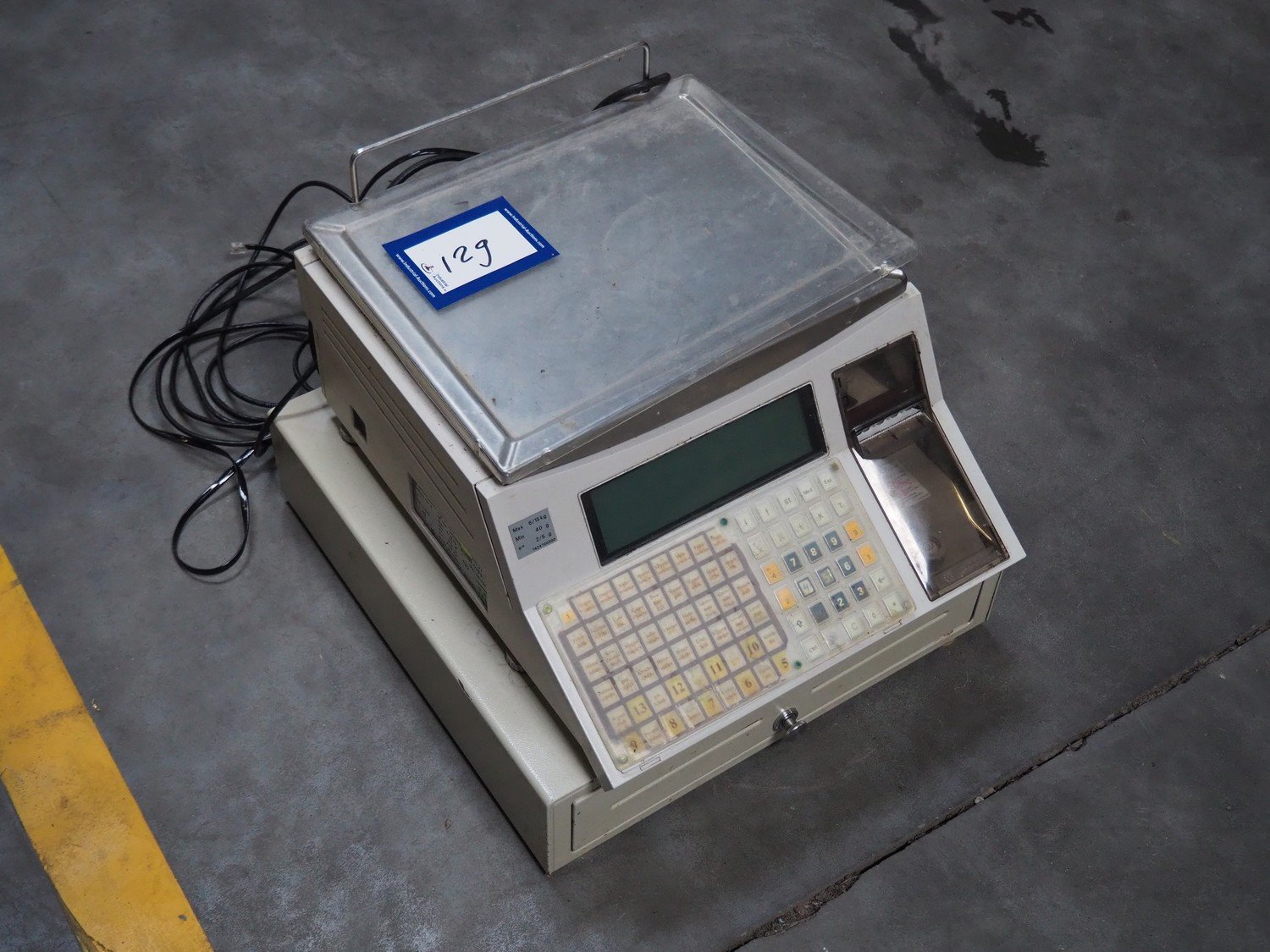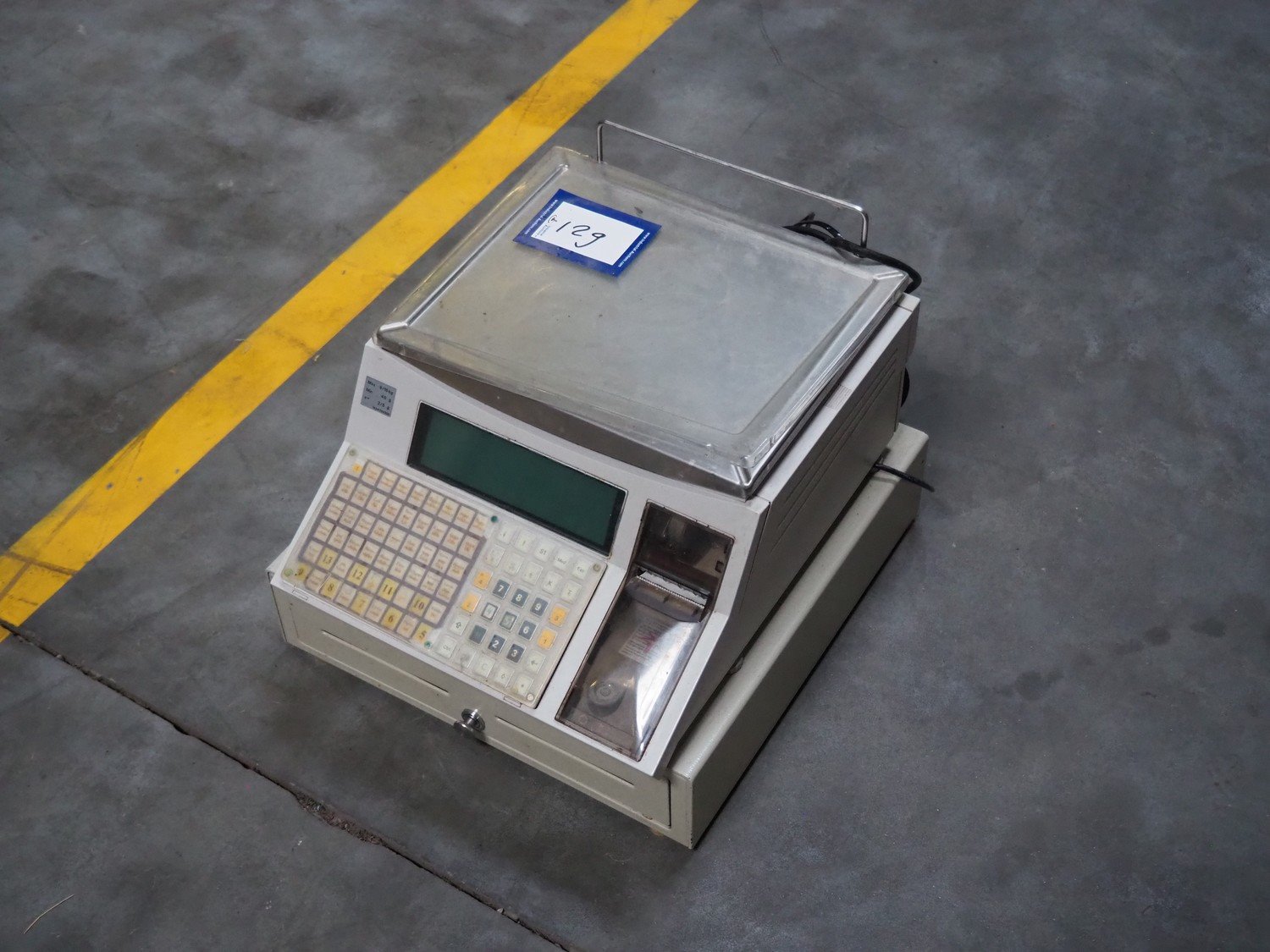 Bizerba weighing scale labelling machine with cash drawer, type: SC II 100, number: 10712619, year of construction: 2011, 120-240 V, 50/60 Hz, 0.35-0.25 A, maximum weight: 6/15 kg, minimum weight: 40 gram, e = 2/5 gram, T = - 6/15 kg, dimensions scale: 340 mm x 250 mm, total dimensions: 4200 mm x 4200 mm x 350 mm.