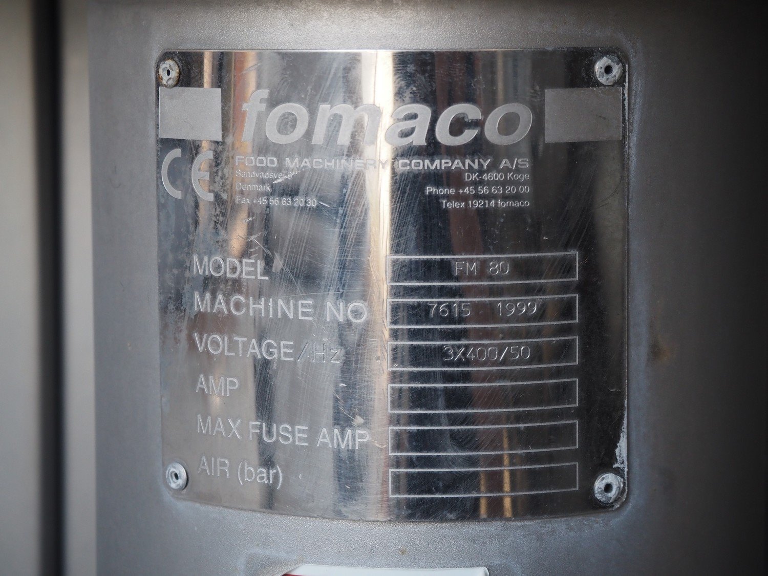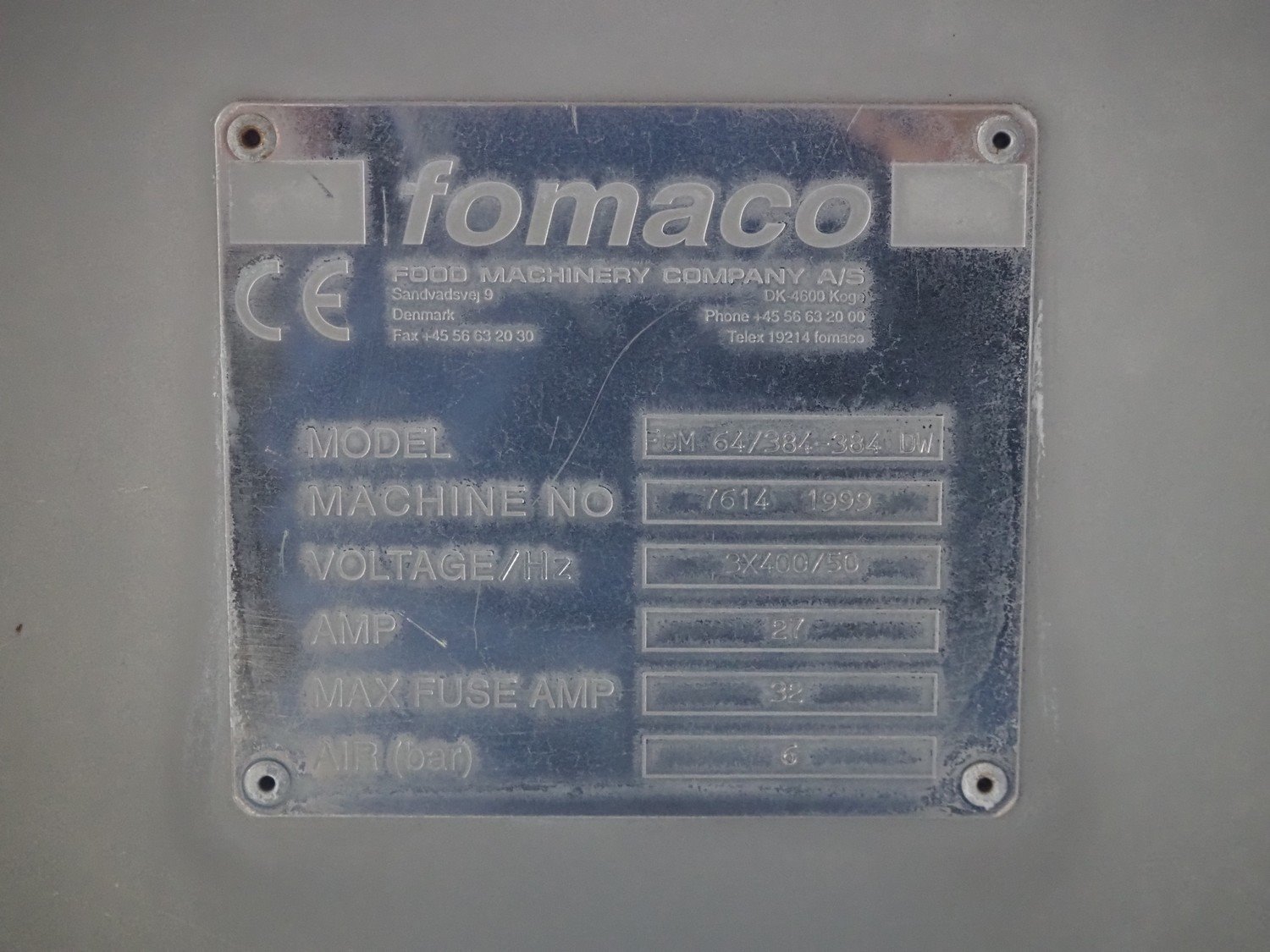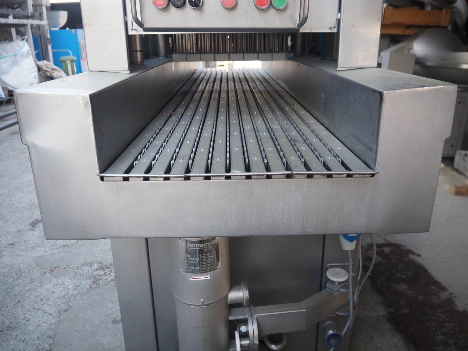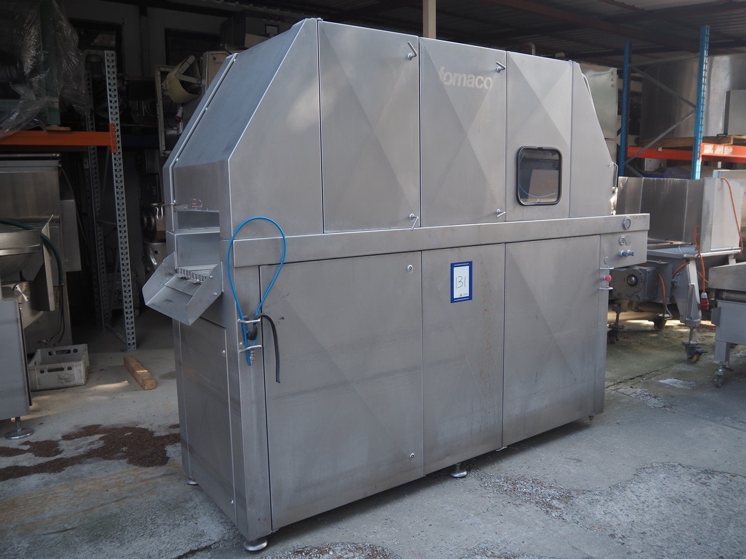 Fomaco injector and tenderizer with filter tub, model: FGM 64/384-384 DW, machine number: 7614, year of construction: 1999, 400 V, 3 Ph, 50 Hz, 27 A, 128 needles, s/s walking beam, beam width: 550 mm, dimensions injector: 3000 mm x 1000 mm x 2400 mm, dimensions filter tub: 2500 mm x 750 mm x 1000 mm.