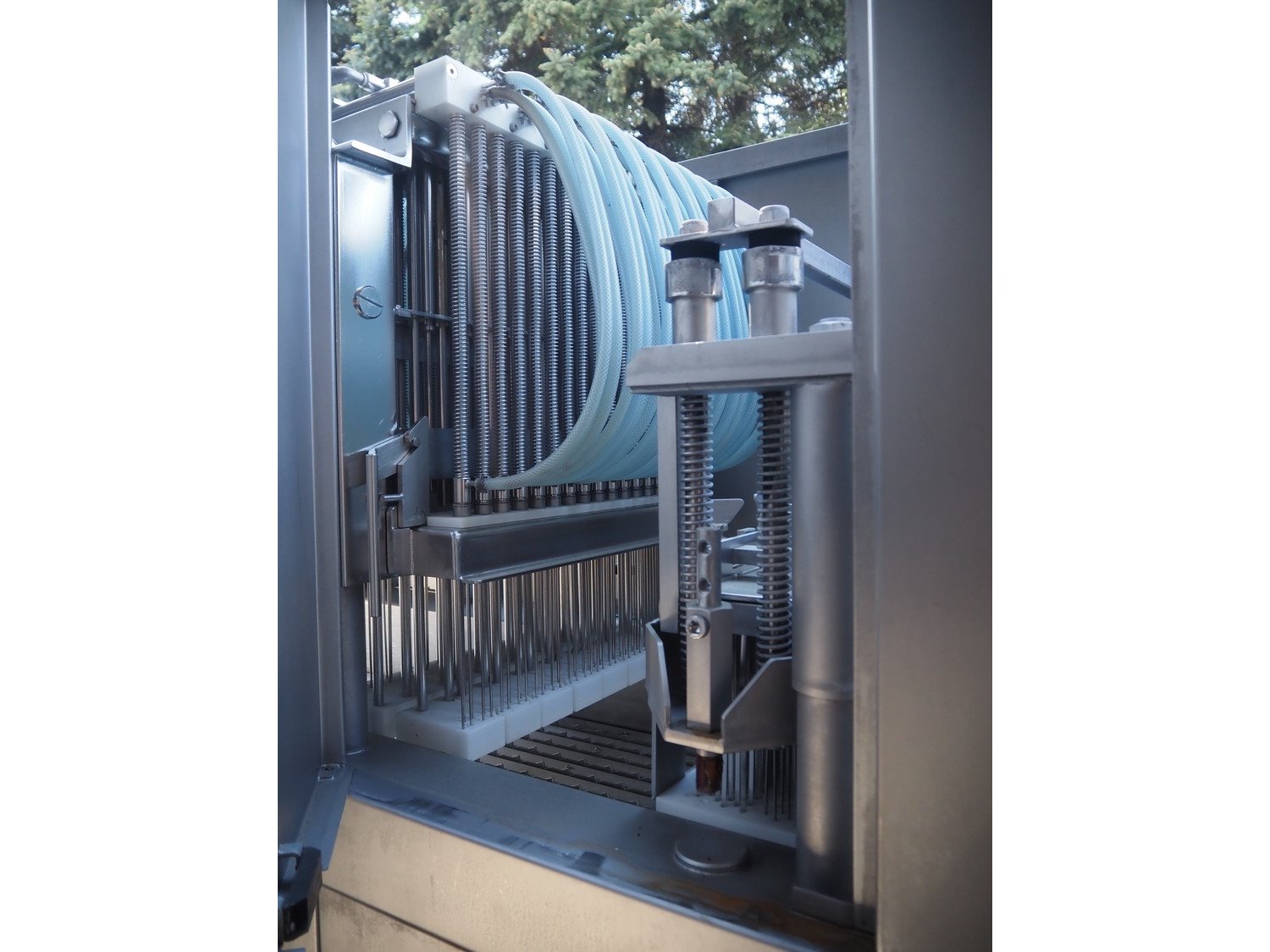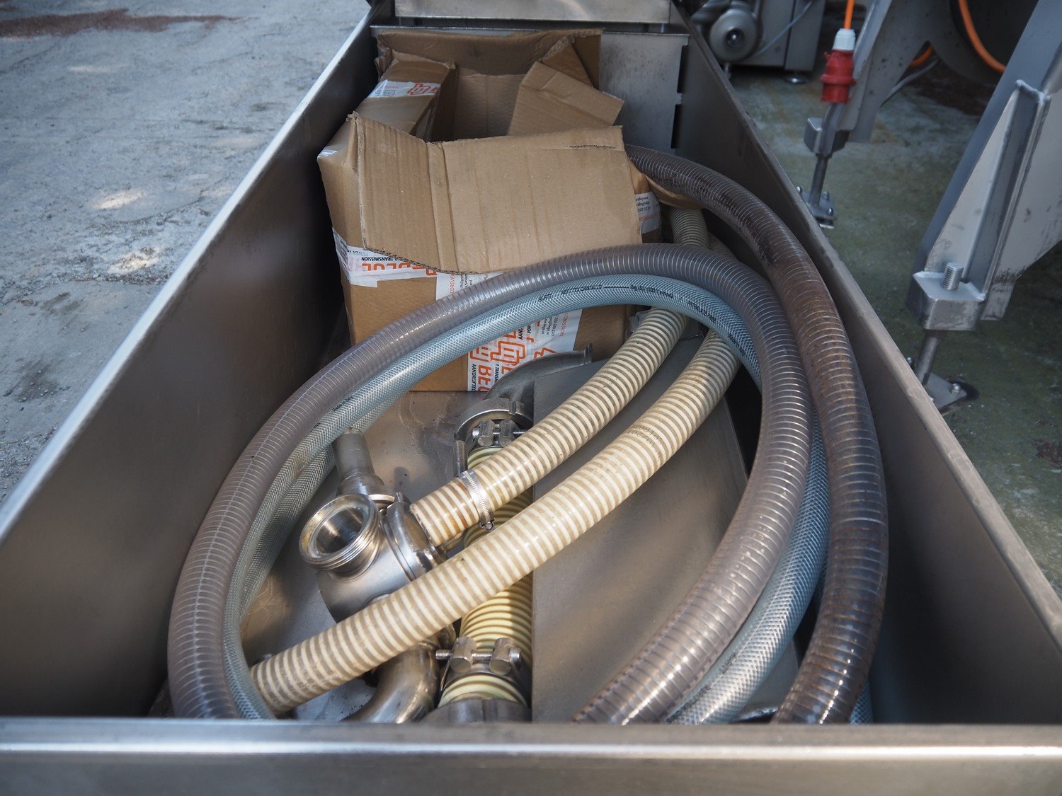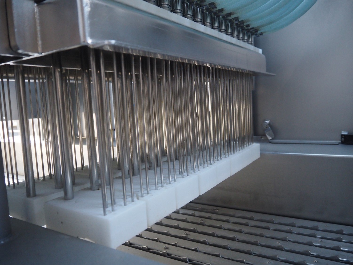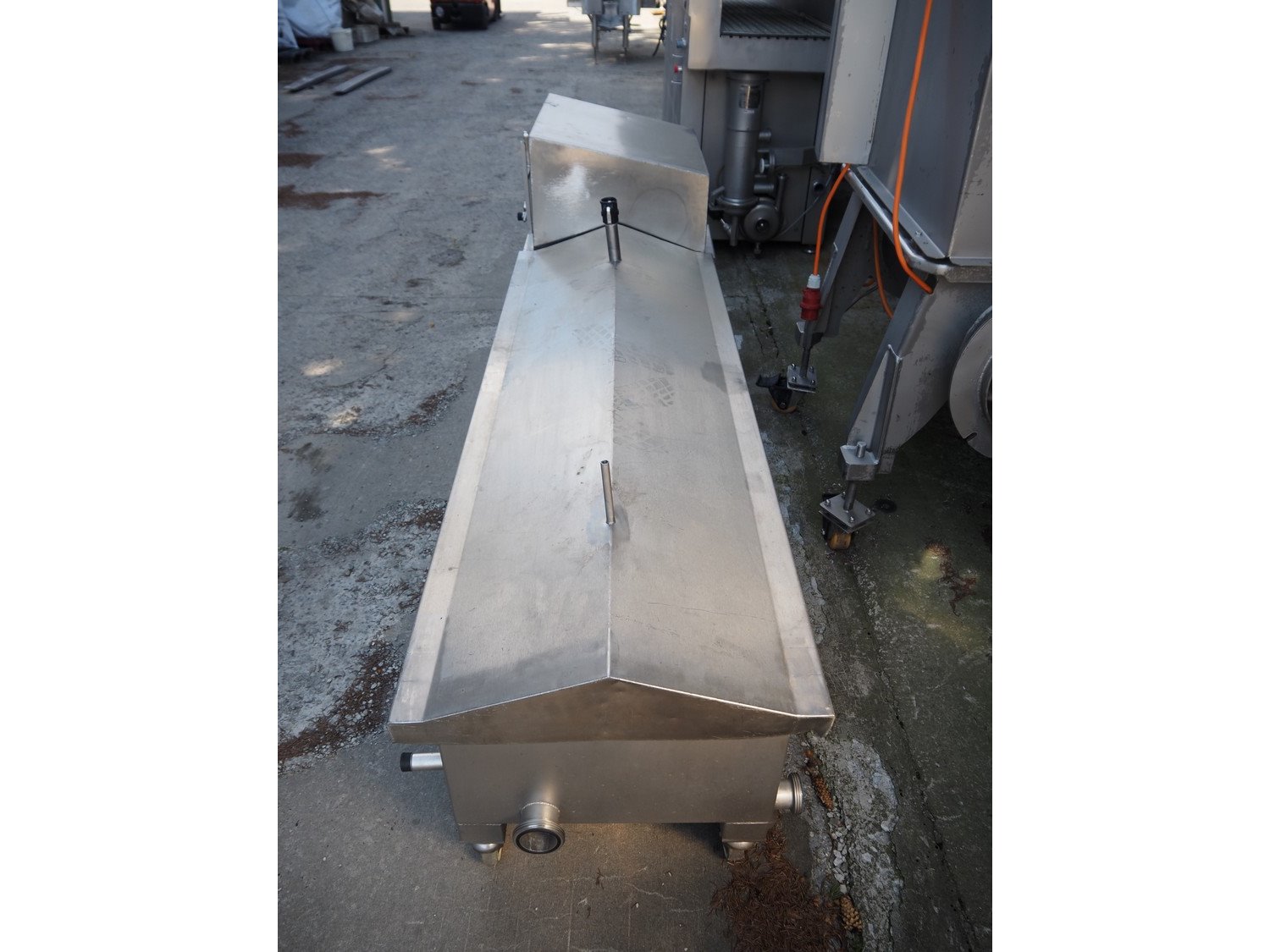 Fomaco injector and tenderizer with filter tub, model: FGM 64/384-384 DW, machine number: 7614, year of construction: 1999, 400 V, 3 Ph, 50 Hz, 27 A, 128 needles, s/s walking beam, beam width: 550 mm, dimensions injector: 3000 mm x 1000 mm x 2400 mm, dimensions filter tub: 2500 mm x 750 mm x 1000 mm.