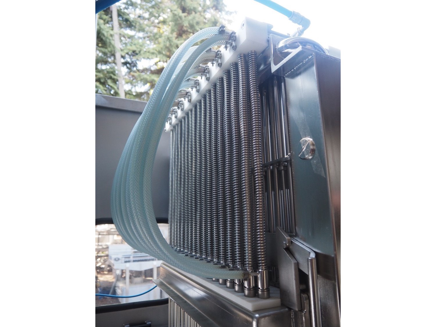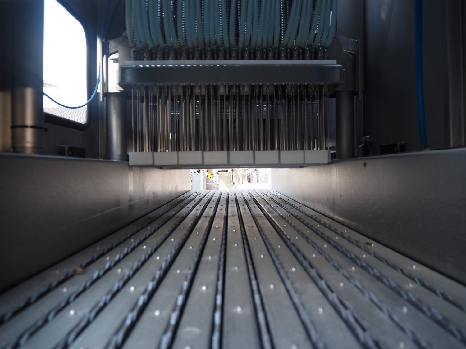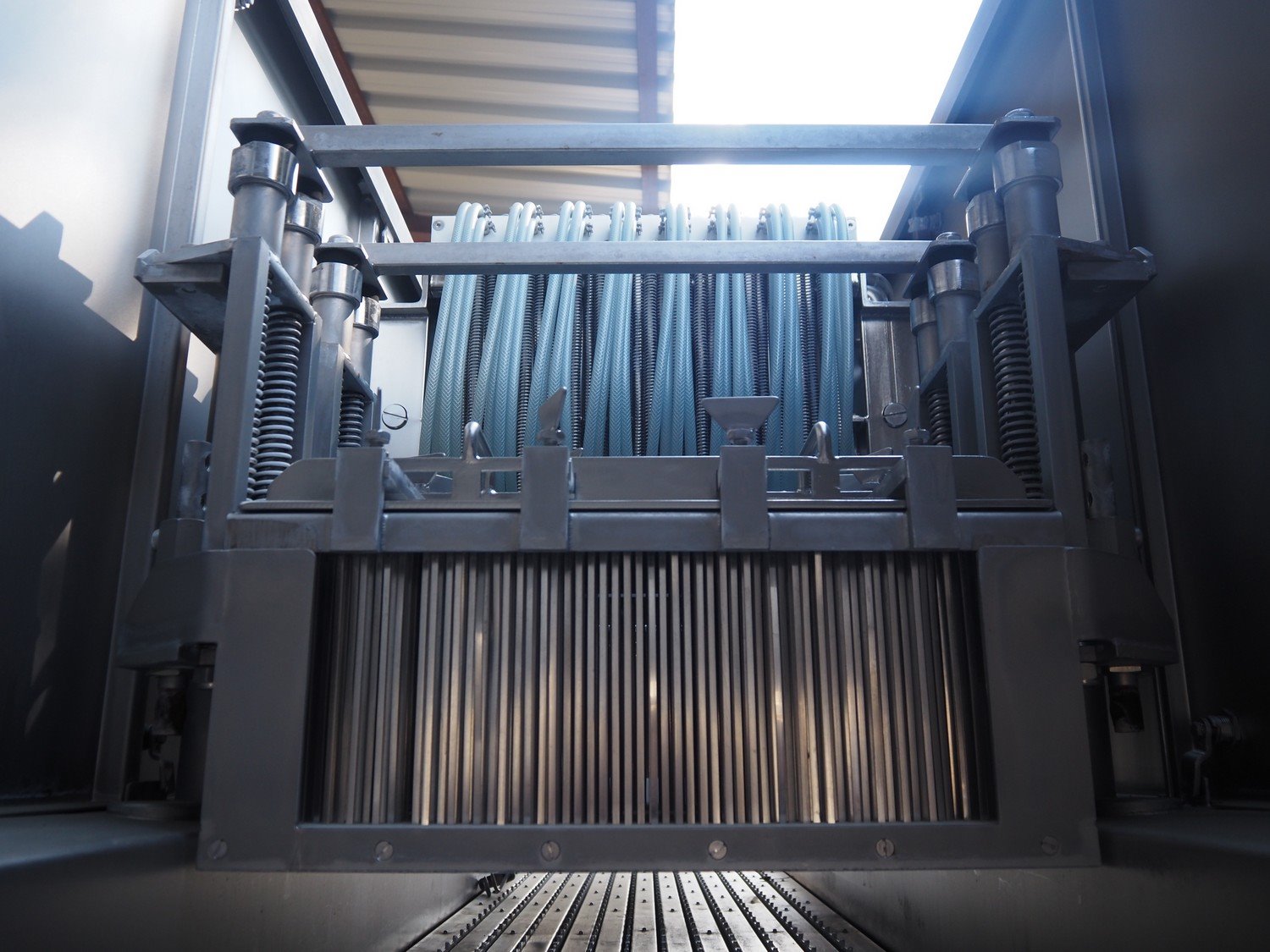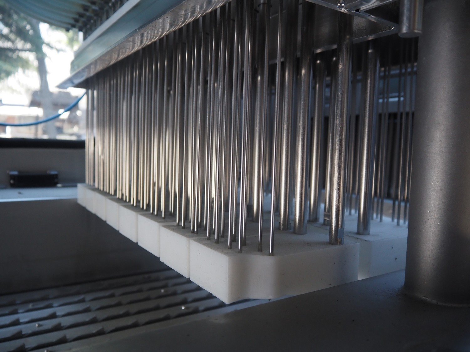 Fomaco injector and tenderizer with filter tub, model: FGM 64/384-384 DW, machine number: 7614, year of construction: 1999, 400 V, 3 Ph, 50 Hz, 27 A, 128 needles, s/s walking beam, beam width: 550 mm, dimensions injector: 3000 mm x 1000 mm x 2400 mm, dimensions filter tub: 2500 mm x 750 mm x 1000 mm.