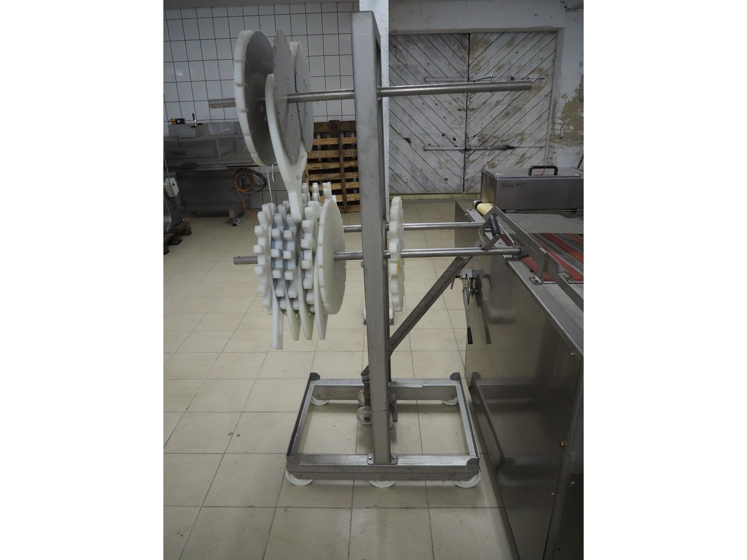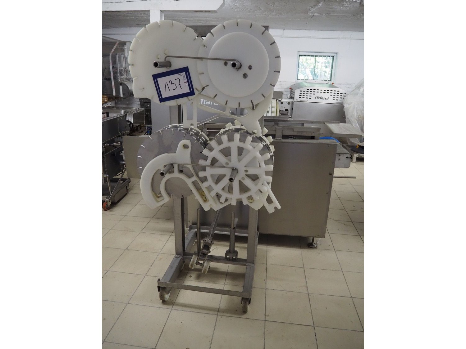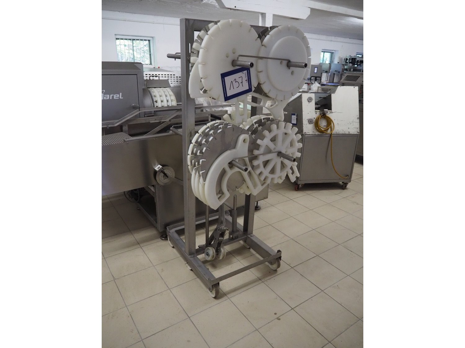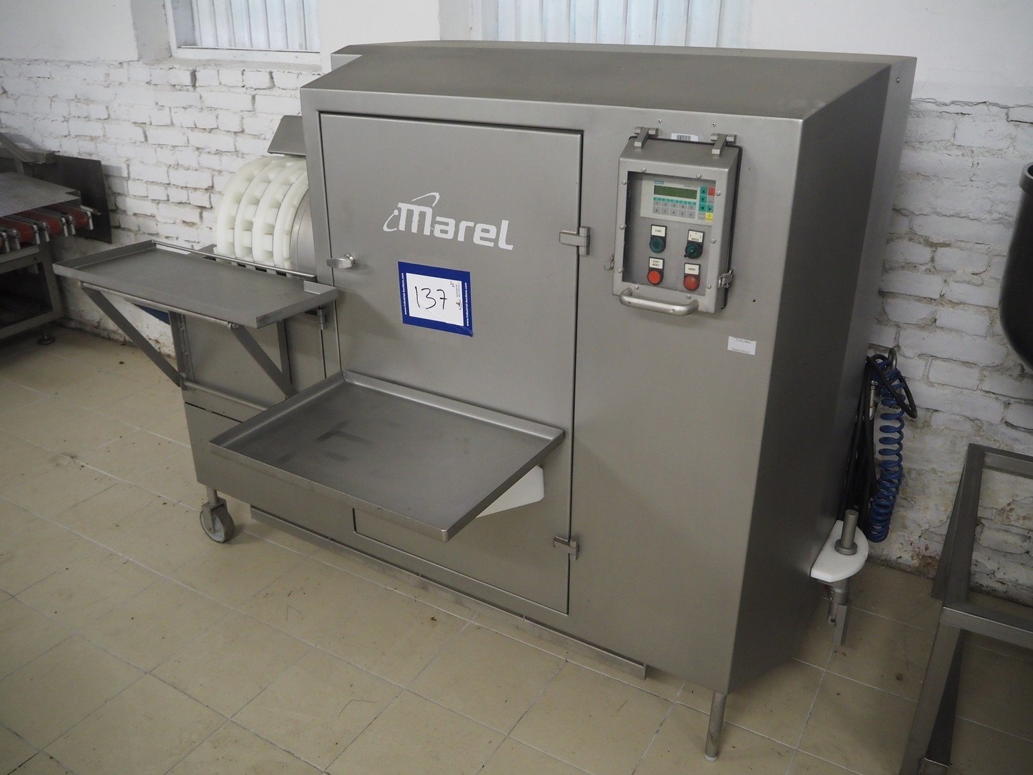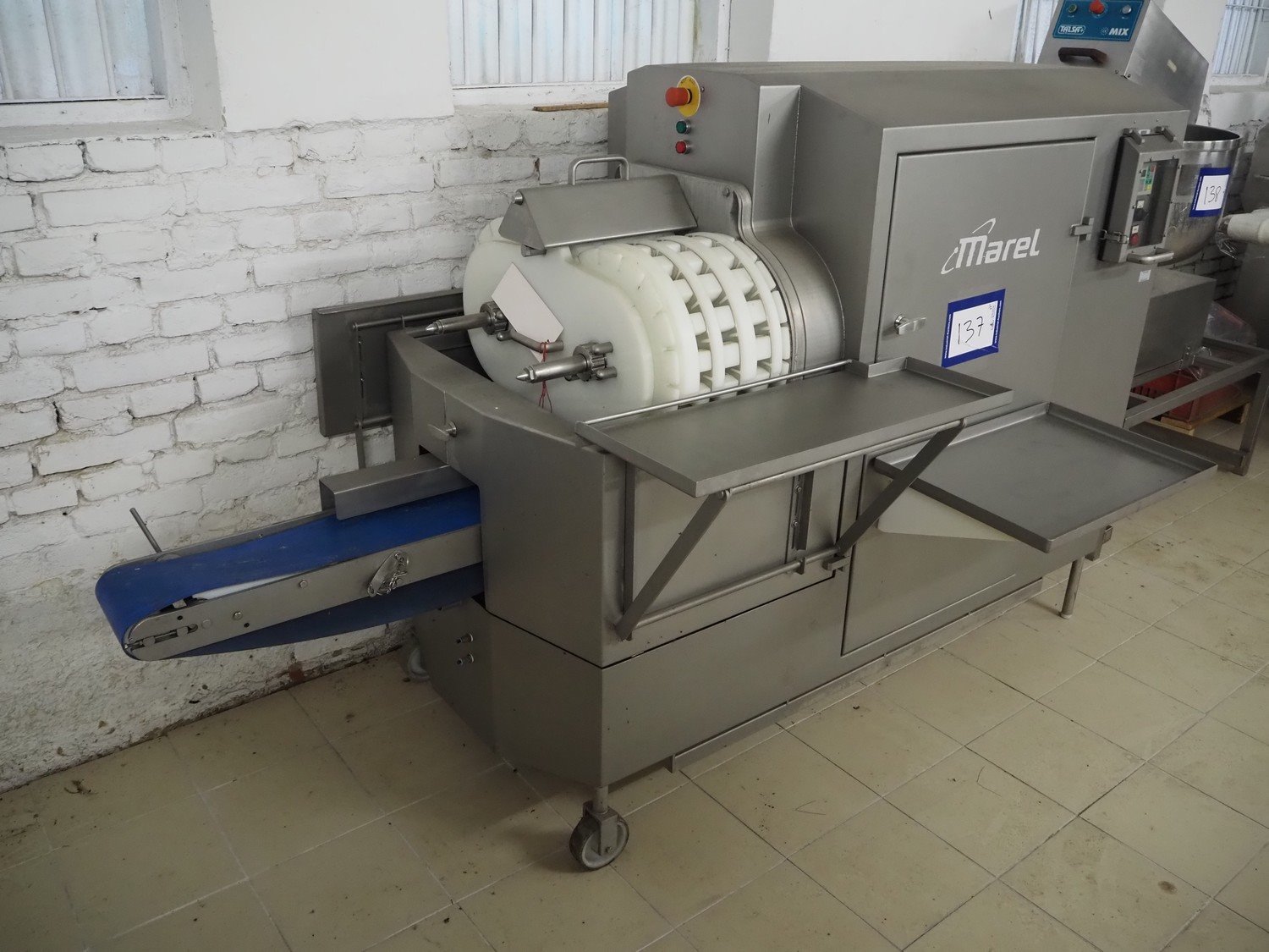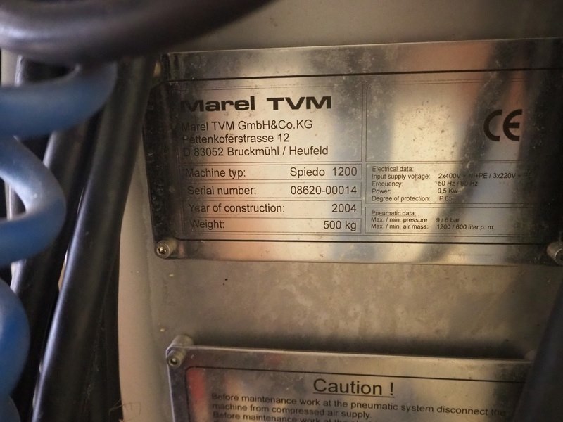 Marel TVM mobile skewering machine, type: Spiedo 1200, serial number: 08620-00014, year of construction: 2004, 400/200 V, 2/3 Ph, 50/60 Hz, 0.5 kW, 9/6 bar, weight: 500 kg, plastic outfeed belt, belt width: 200 mm, total dimensions: 2500 mm x 1430 mm x 1500 mm. Including box with extra parts and an trolley with extra forms, dimensions trolley: 620 mm x 840 mm x 1750 mm.